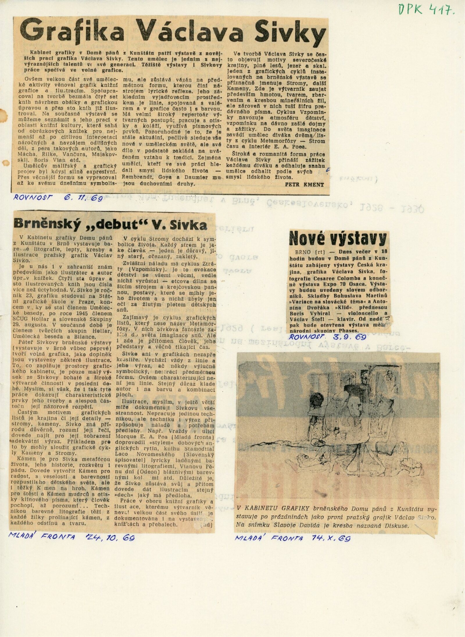 Václav Sivko: Dům umění města Brna / Dům pánů z Kunštátu, Kabinet grafiky, 3. 10. – 2. 11. 1969 / Text: Miroslav Míčko. – Brno: DUmB, 1969. – 8 s., obr., životopis, DPK 417. – MZK; MG; MMB