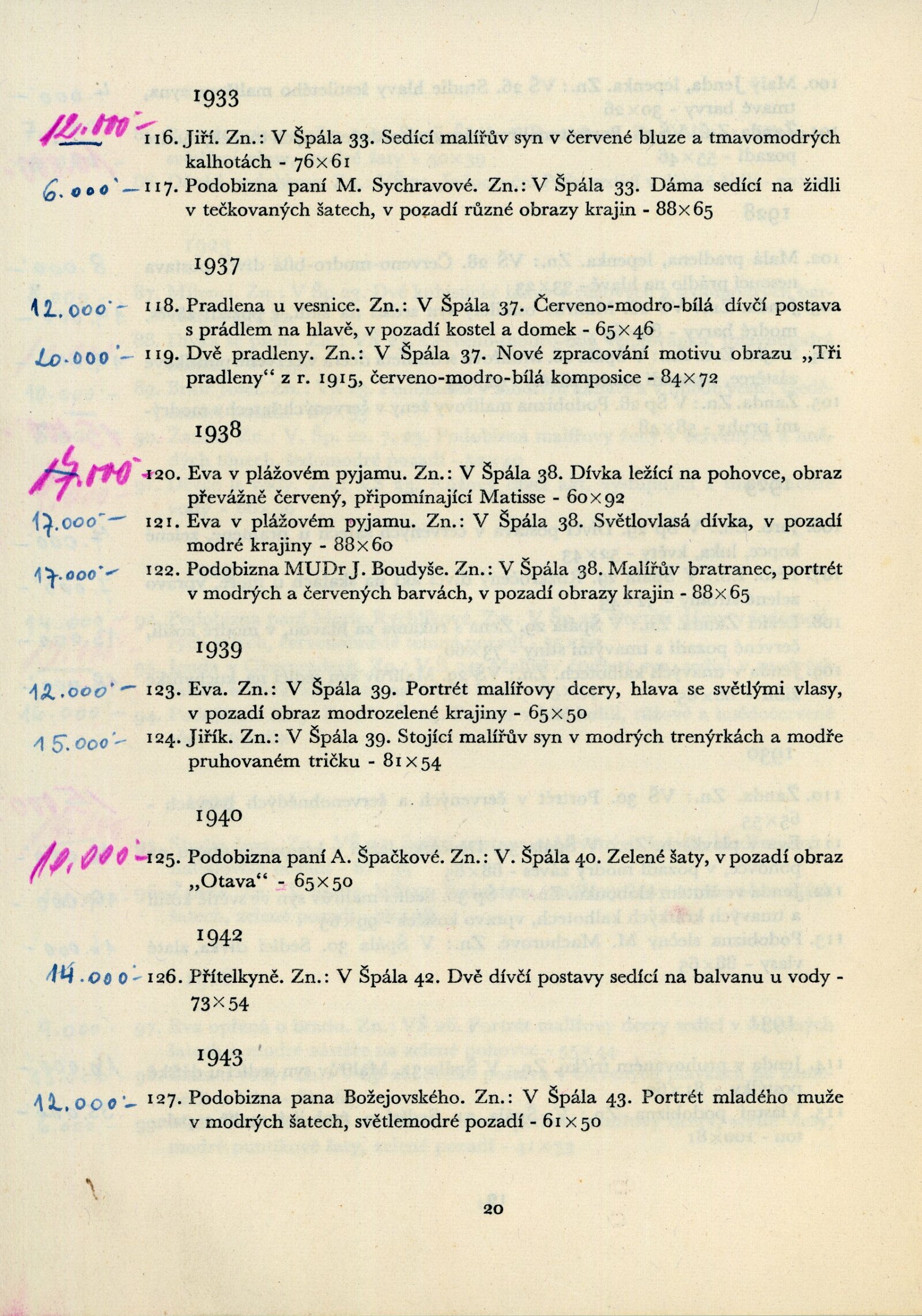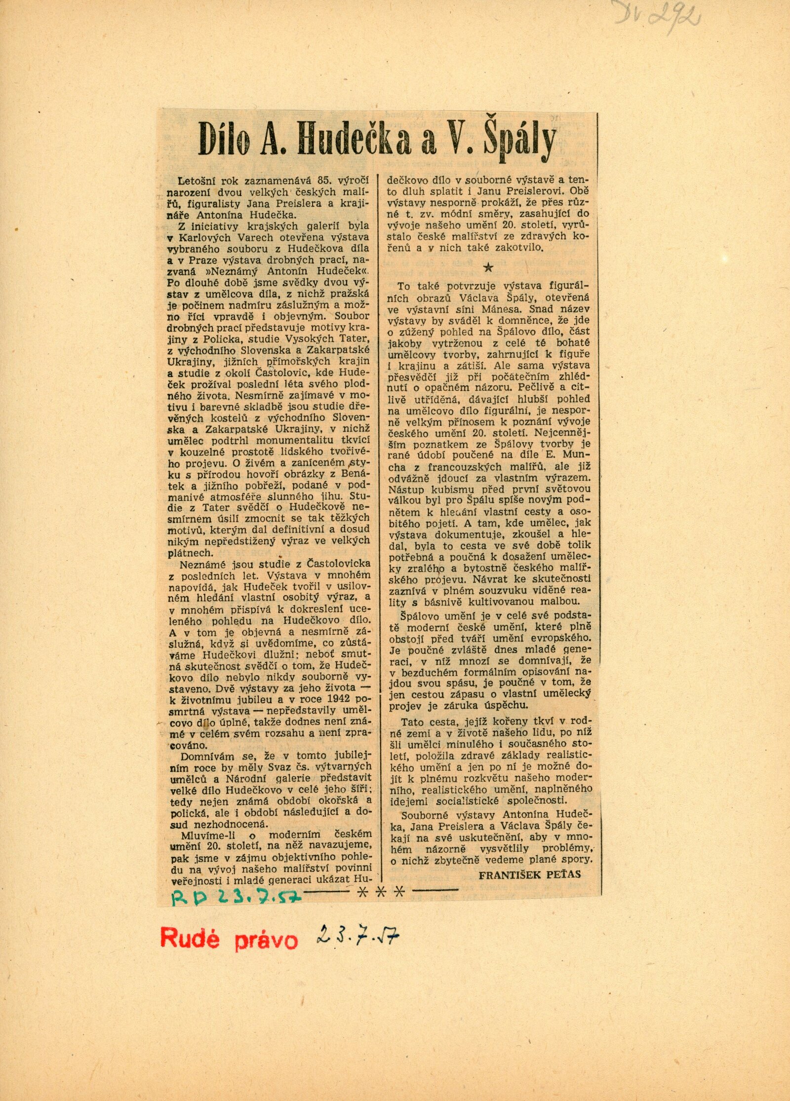 pozvánka, katalog, prezenční list z tiskové konference, 1 fotografie z výstavy v Domě umění, 2 fotografie z výstavy v Mánesu v Praze (foto Jiří Hampl), seznam děl, korespondence (Adolfa Kroupy s J. Špálou a Jaromírem Pečírkou o přípravě výstavy, korespondence o převzetí výstavy do Bratislavy)