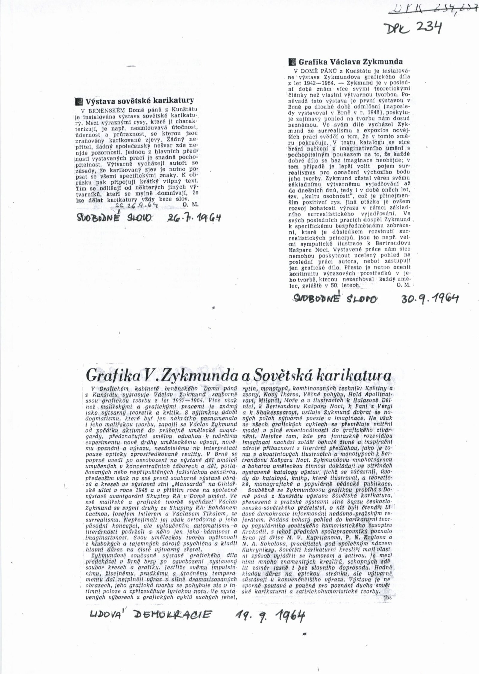 společná pozvánka DPK 234–236, katalog, žádost o uspořádání výstavy, strojopis textu pro katalog, podmínky pro uspořádání výstavy, korespondence, recenze v tisku, gratulace k narozeninám a zdravice (Adolf Kroupa), do složky dodatečně vloženo parte Václava Zykmunda z roku 1984