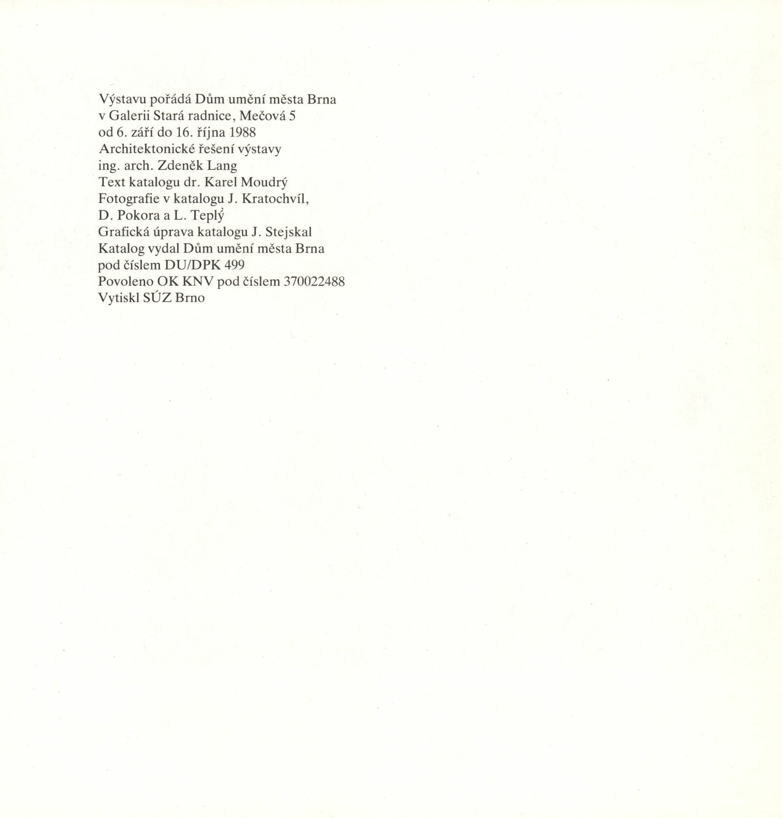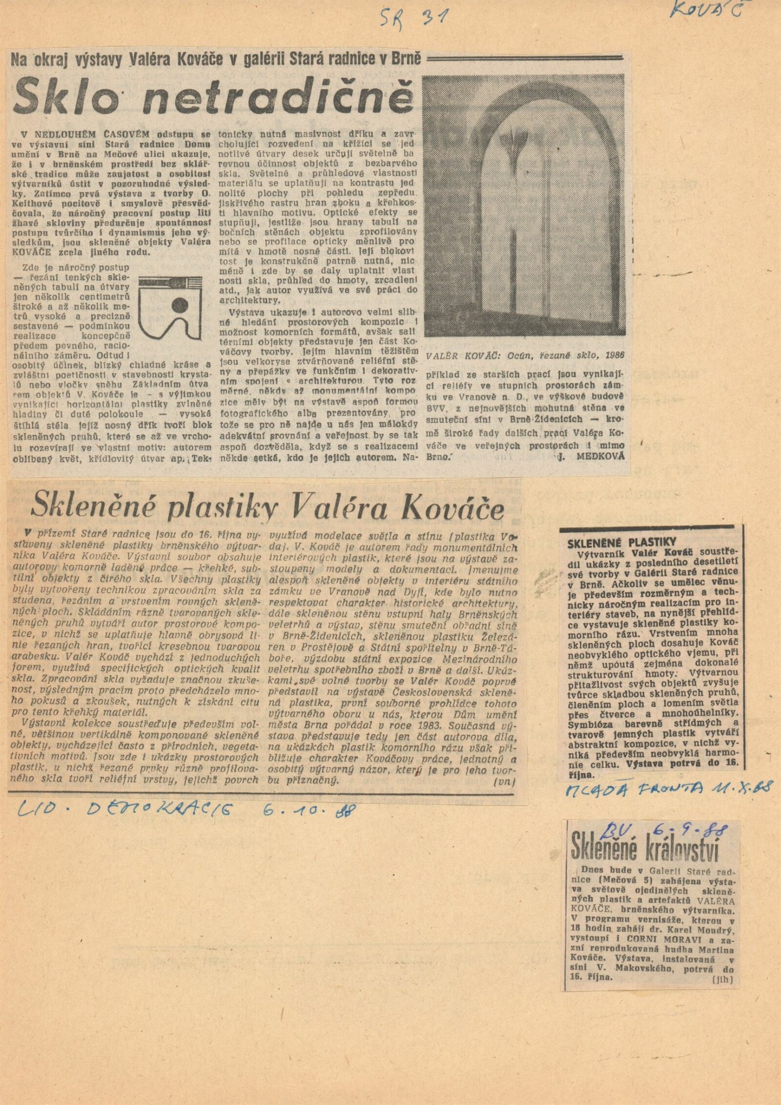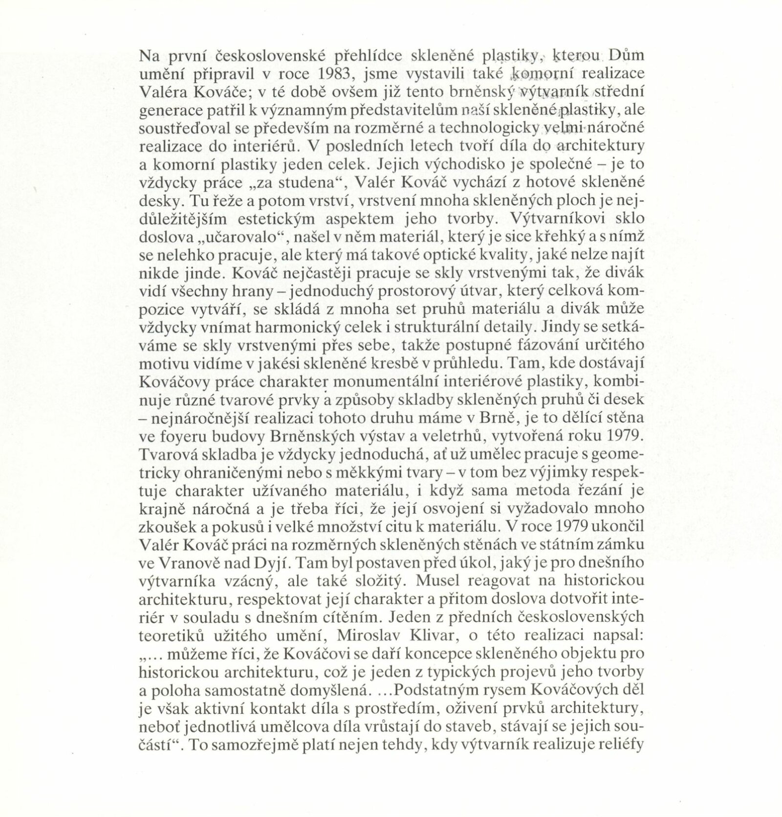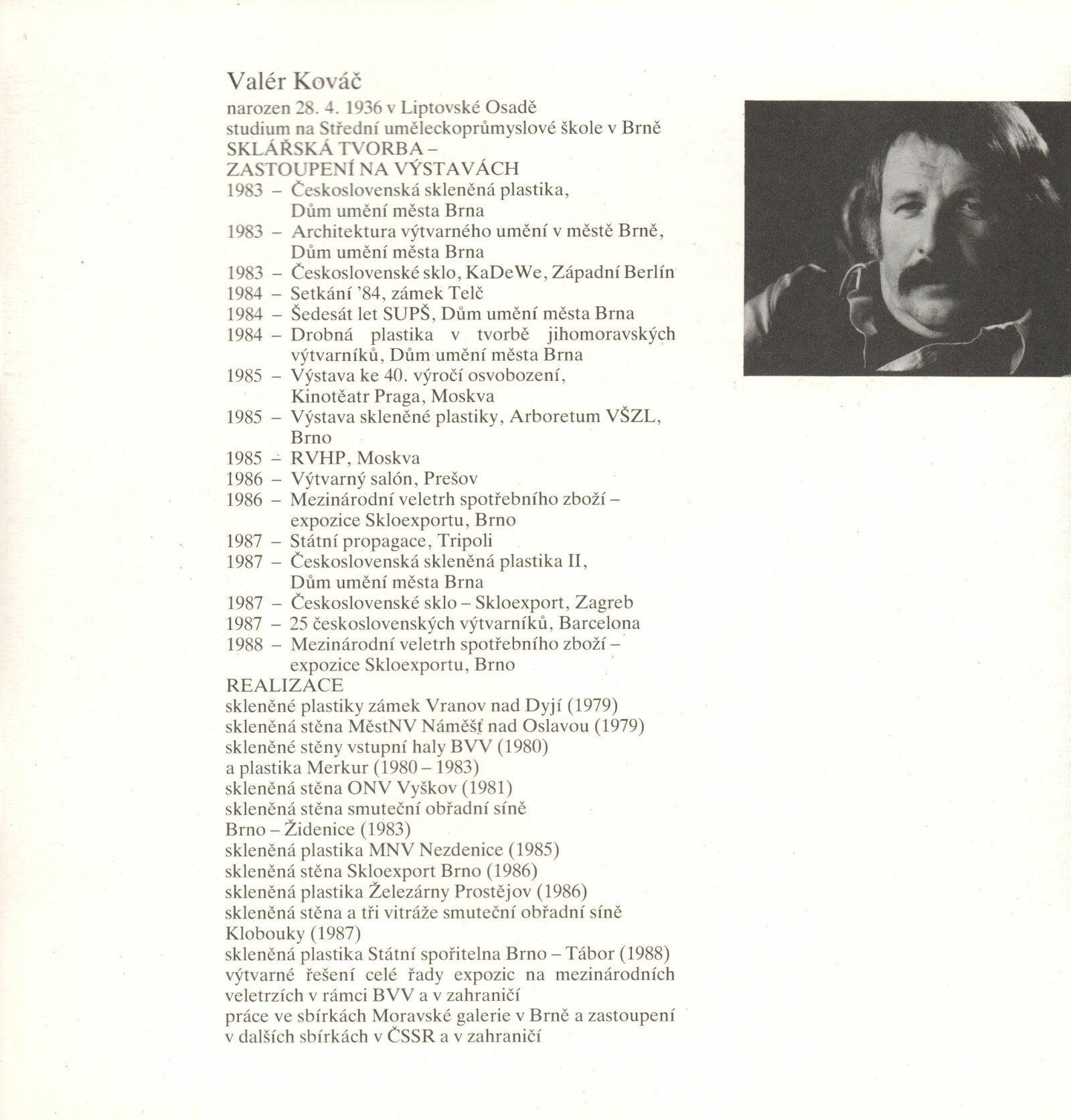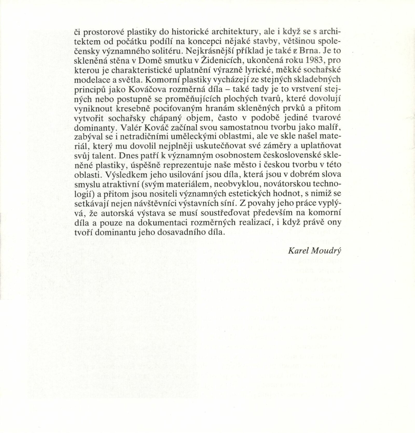 Valér Kováč. Vrstvené sklo: Galerie Stará radnice, 6. 9. – 16. 10. 1988 / Text: Karel Moudrý. – Brno: DUmB, 1988. – [24] s., obr., životní data, realizace, GSR 31. – MZK; MG; MMB