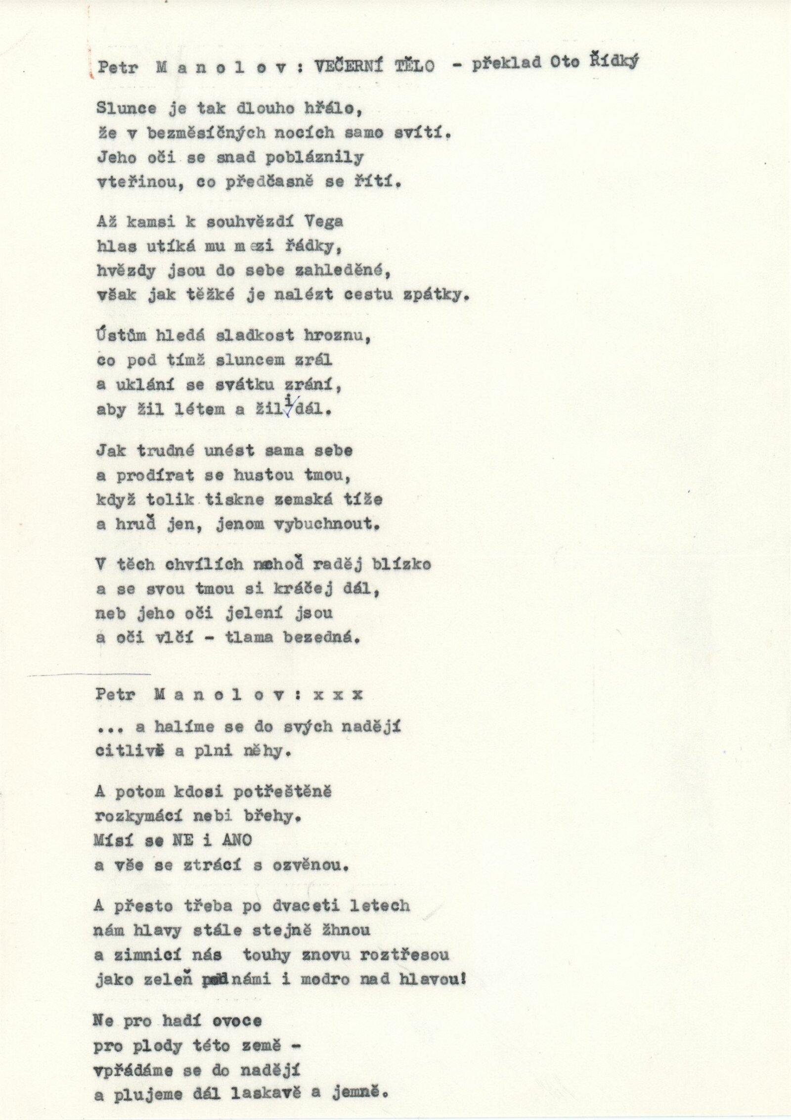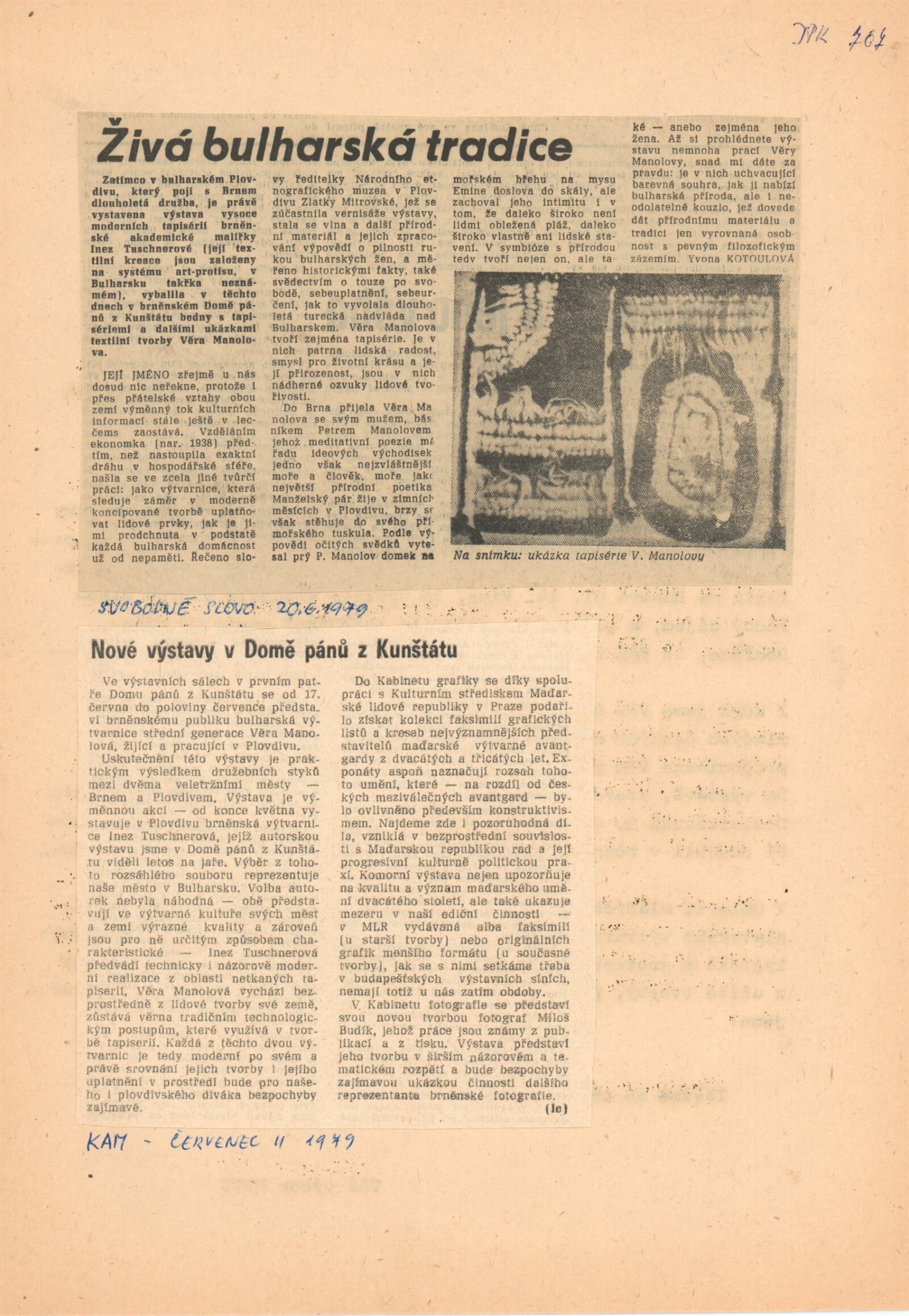 pozvánka, katalog + strojopis (ČJ, RJ), fotografie tapiserie, básně P. Manolova, seznam exponátů, provozní korespondence, recenze v tisku