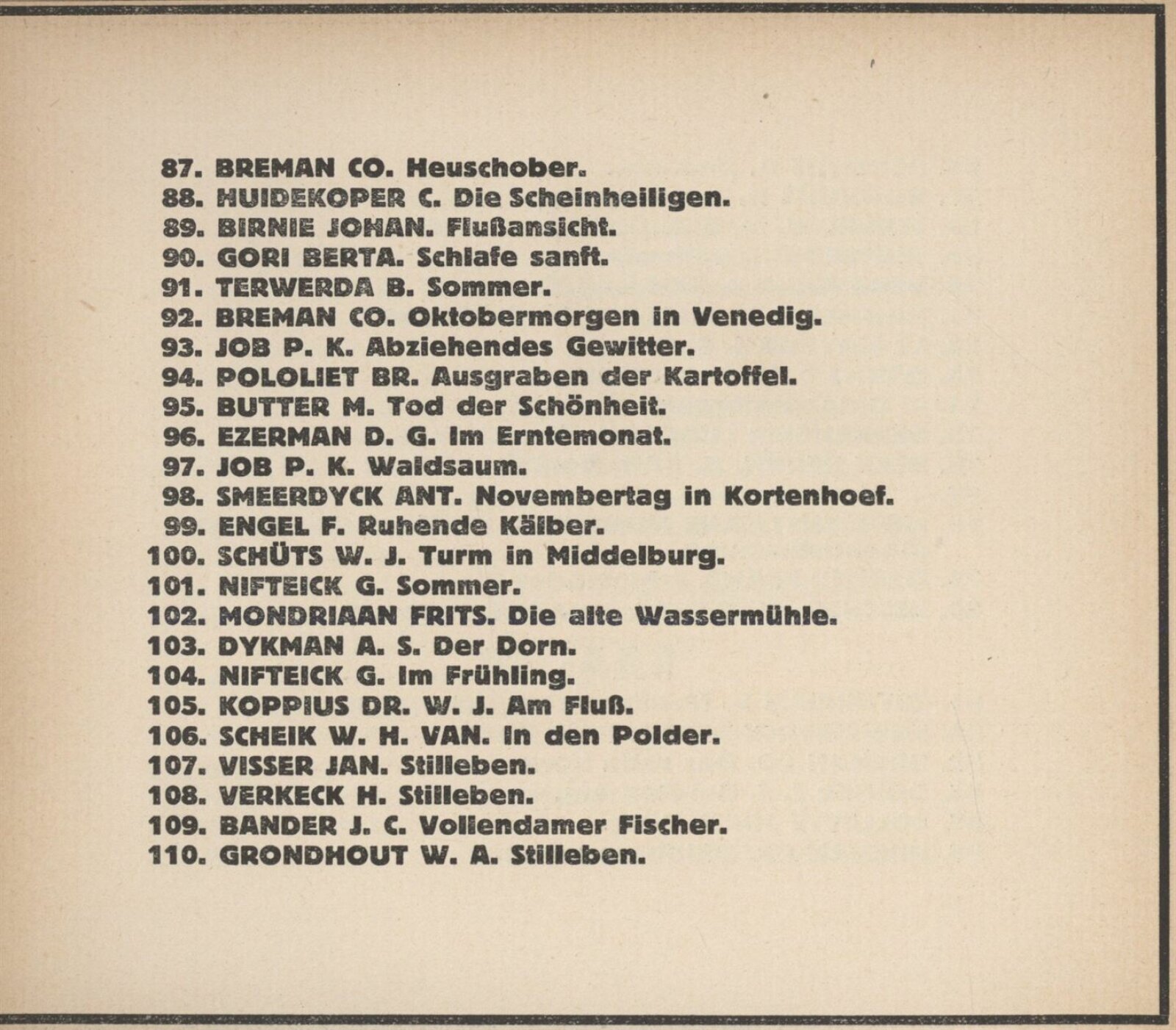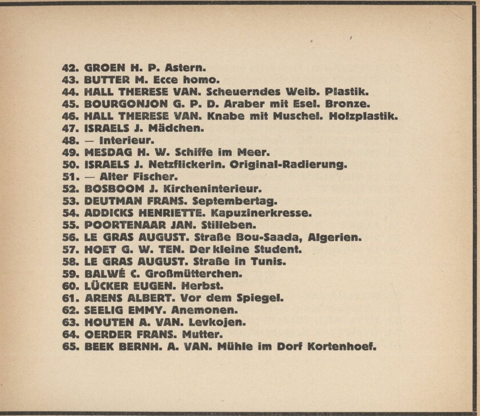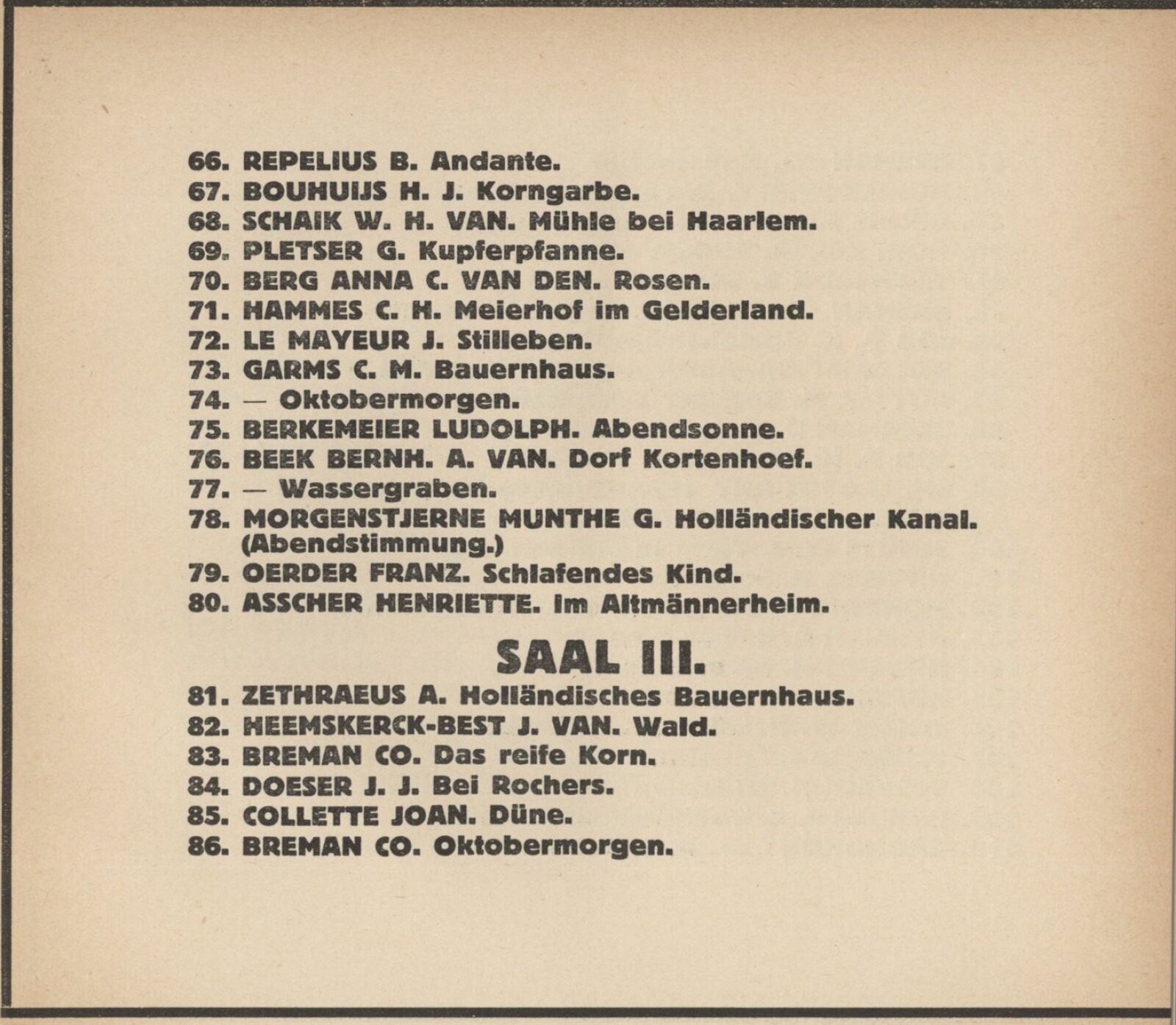 Henriette Addicks, C. J. Alban, J. E. Alban, G. Altmann, Lizzy Ansingh, Albert Arens, Henriette Asscher, C. Balwé, J. C. Bander, Bernh. A. van Beek, Anna van den Berg, Ludolph Berkemeier, Johan Birnie, Gerard J. de Boer, H. F. Boot, J. Bos Gerard, J. Bosboom, H. J. Bouhuijs, G. P. D. Bourgonjon, Co. Breman, M. Butter, J. J. Coellette, Carl L. Dake, Frans Deutman, J. J. Doeser, Therese van Duyl-Schwartze, A. S. Dykman, F. Engel, D. G. Ererman, C. M. Garms, Berta Gori, H. P. Groen, W. A. Grondhout, A. C. Gyswyt, Therese van Hall, C. H. Hammes, Dirk Harting, H. Hayenbrock, J. van Heemskerck-Best, Mar Heyl, G. W. ten Hoet, A. van Houten, J. Hoynck van Papendrecht, C. Huidekoper, J. L. van Ishoven, J. Israels, P. K. Job, Bernh Klene, A. H. Konning, Dr. W. J. Koppius, C. M. L. Kouw, H. M. Krabbe, H. Kruijder, Herman Kuijt, August Le Gras, J. Le Mayeur, Eugen Lücker, H. W. Mesdag, Martin Monickendam, Munthe Morgenstjerne, Bernhard Mulder, G. Nifteick, Frans Oerder, G. Th. M. van Pelt, G. Pletser, Jan Poortenaar, J. Proost, M. van Raalte, Louis Raemaeckers, M. P. Rens, B. Repelius, Jakob Ritsema, Emmy Seelig, A. Shmerdyk, E. R. D. Schaap, H. W. J. Schaap van der Pek, W. H. van Schaik, A. M. van Schaik-Russel, W. H. van Scheik, David Schulman, W. J. Schüts, Therese van Schwartze, Willy Sluiter, Ant. Smeerdyck, G. J. Staller, Marie Stork-Kruijff, J. Surie, B. Terwerda, H. Verkeck, Jan Visser, Tjipke Visser, Nikolaus van Waay, Marie Wuijtiers, A. Zethraeus