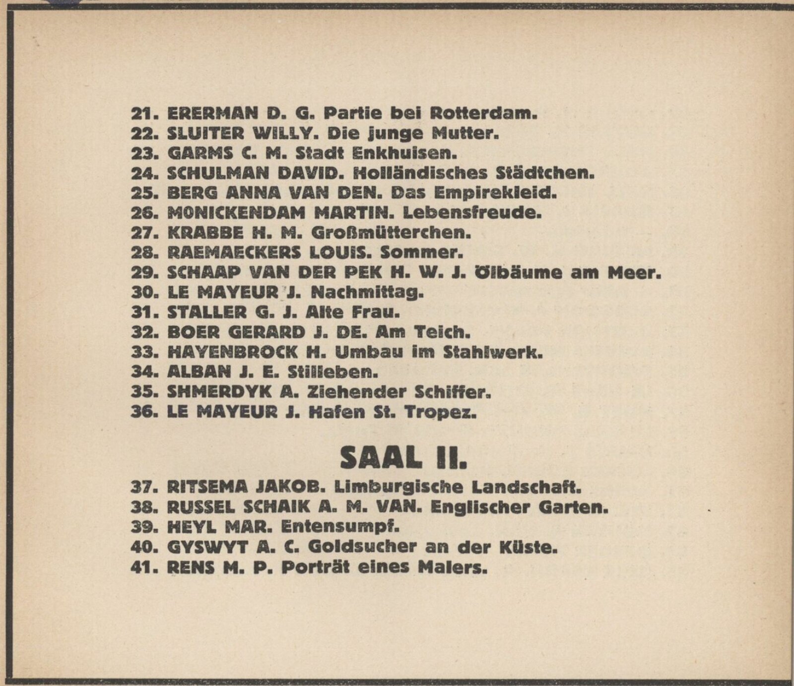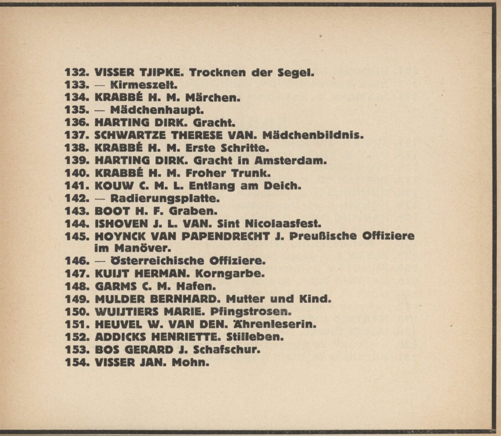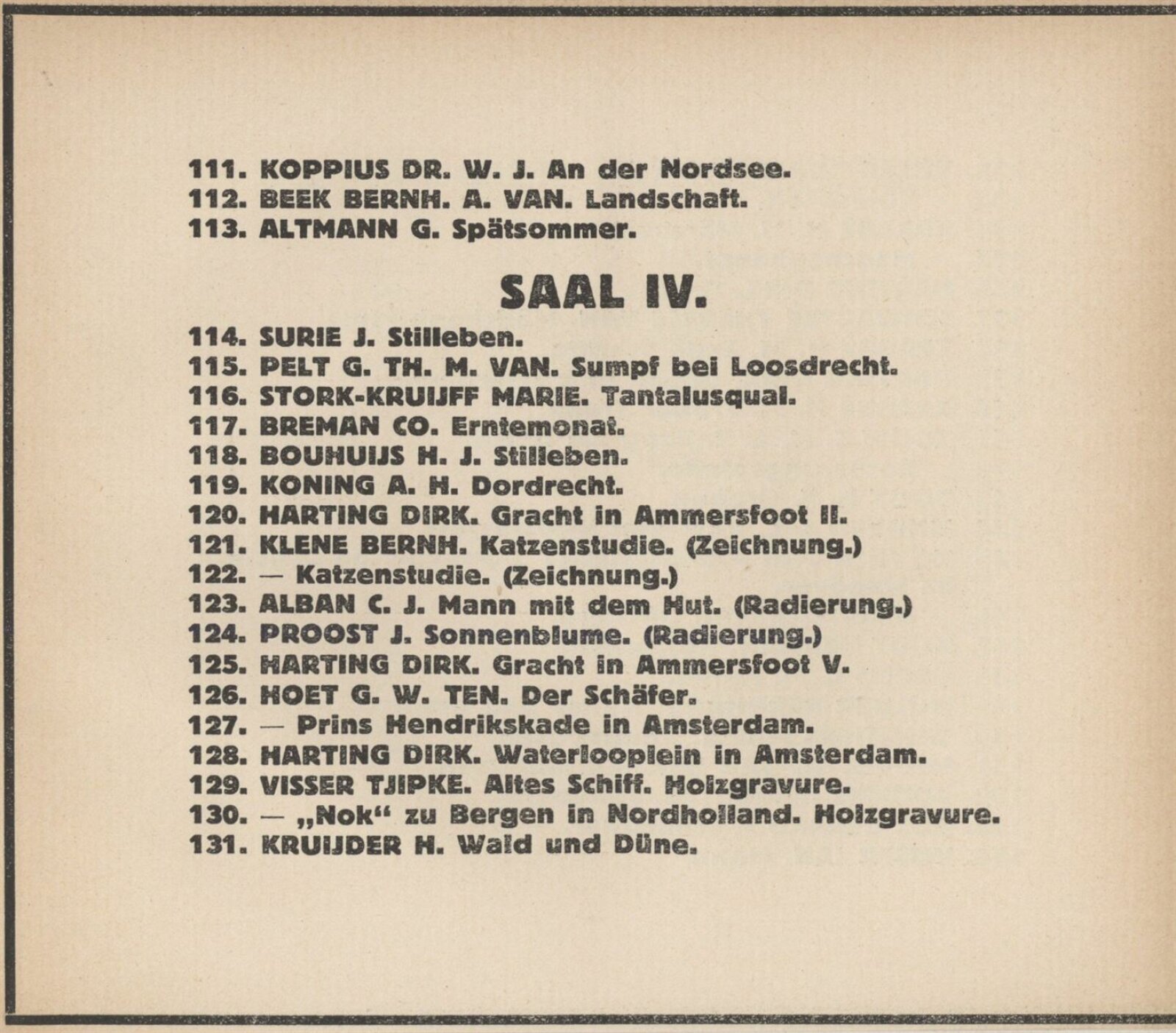 Henriette Addicks, C. J. Alban, J. E. Alban, G. Altmann, Lizzy Ansingh, Albert Arens, Henriette Asscher, C. Balwé, J. C. Bander, Bernh. A. van Beek, Anna van den Berg, Ludolph Berkemeier, Johan Birnie, Gerard J. de Boer, H. F. Boot, J. Bos Gerard, J. Bosboom, H. J. Bouhuijs, G. P. D. Bourgonjon, Co. Breman, M. Butter, J. J. Coellette, Carl L. Dake, Frans Deutman, J. J. Doeser, Therese van Duyl-Schwartze, A. S. Dykman, F. Engel, D. G. Ererman, C. M. Garms, Berta Gori, H. P. Groen, W. A. Grondhout, A. C. Gyswyt, Therese van Hall, C. H. Hammes, Dirk Harting, H. Hayenbrock, J. van Heemskerck-Best, Mar Heyl, G. W. ten Hoet, A. van Houten, J. Hoynck van Papendrecht, C. Huidekoper, J. L. van Ishoven, J. Israels, P. K. Job, Bernh Klene, A. H. Konning, Dr. W. J. Koppius, C. M. L. Kouw, H. M. Krabbe, H. Kruijder, Herman Kuijt, August Le Gras, J. Le Mayeur, Eugen Lücker, H. W. Mesdag, Martin Monickendam, Munthe Morgenstjerne, Bernhard Mulder, G. Nifteick, Frans Oerder, G. Th. M. van Pelt, G. Pletser, Jan Poortenaar, J. Proost, M. van Raalte, Louis Raemaeckers, M. P. Rens, B. Repelius, Jakob Ritsema, Emmy Seelig, A. Shmerdyk, E. R. D. Schaap, H. W. J. Schaap van der Pek, W. H. van Schaik, A. M. van Schaik-Russel, W. H. van Scheik, David Schulman, W. J. Schüts, Therese van Schwartze, Willy Sluiter, Ant. Smeerdyck, G. J. Staller, Marie Stork-Kruijff, J. Surie, B. Terwerda, H. Verkeck, Jan Visser, Tjipke Visser, Nikolaus van Waay, Marie Wuijtiers, A. Zethraeus