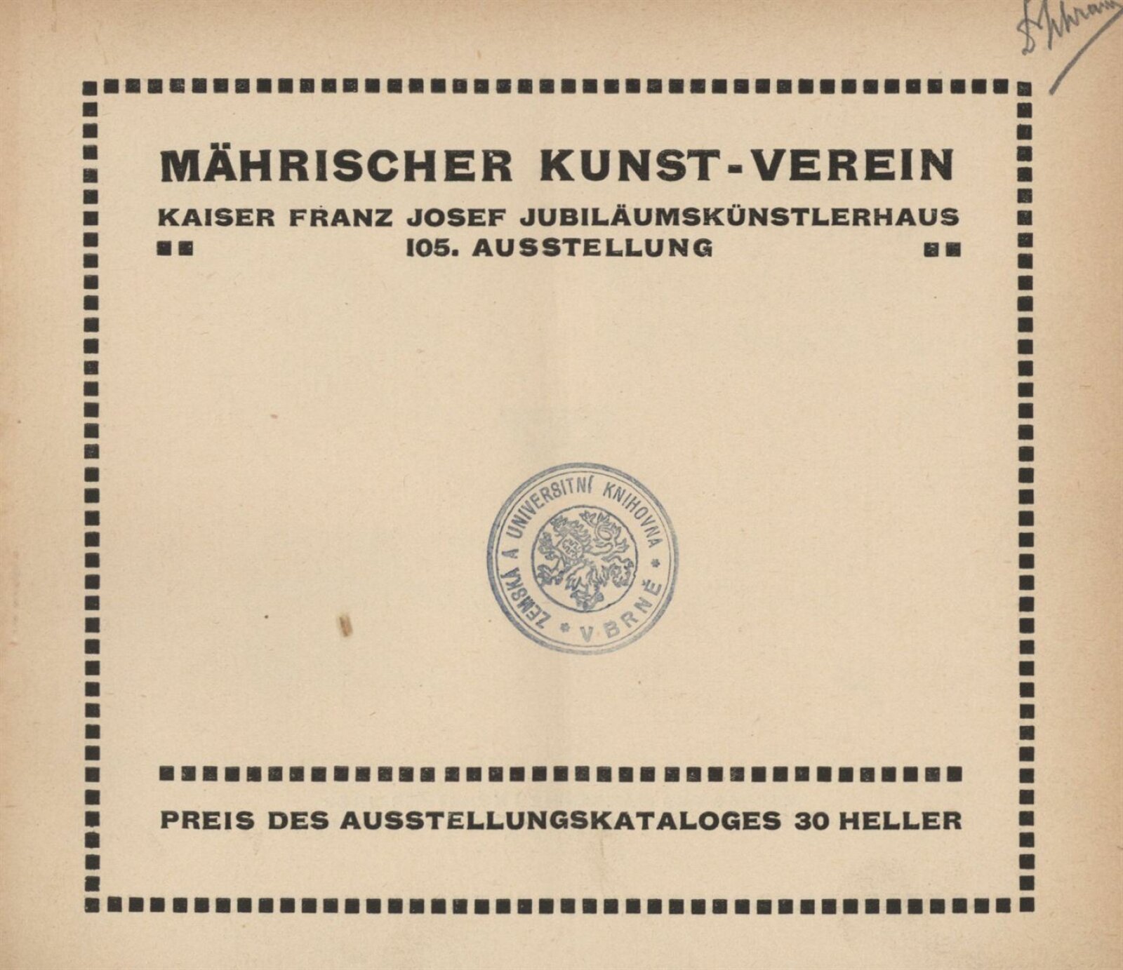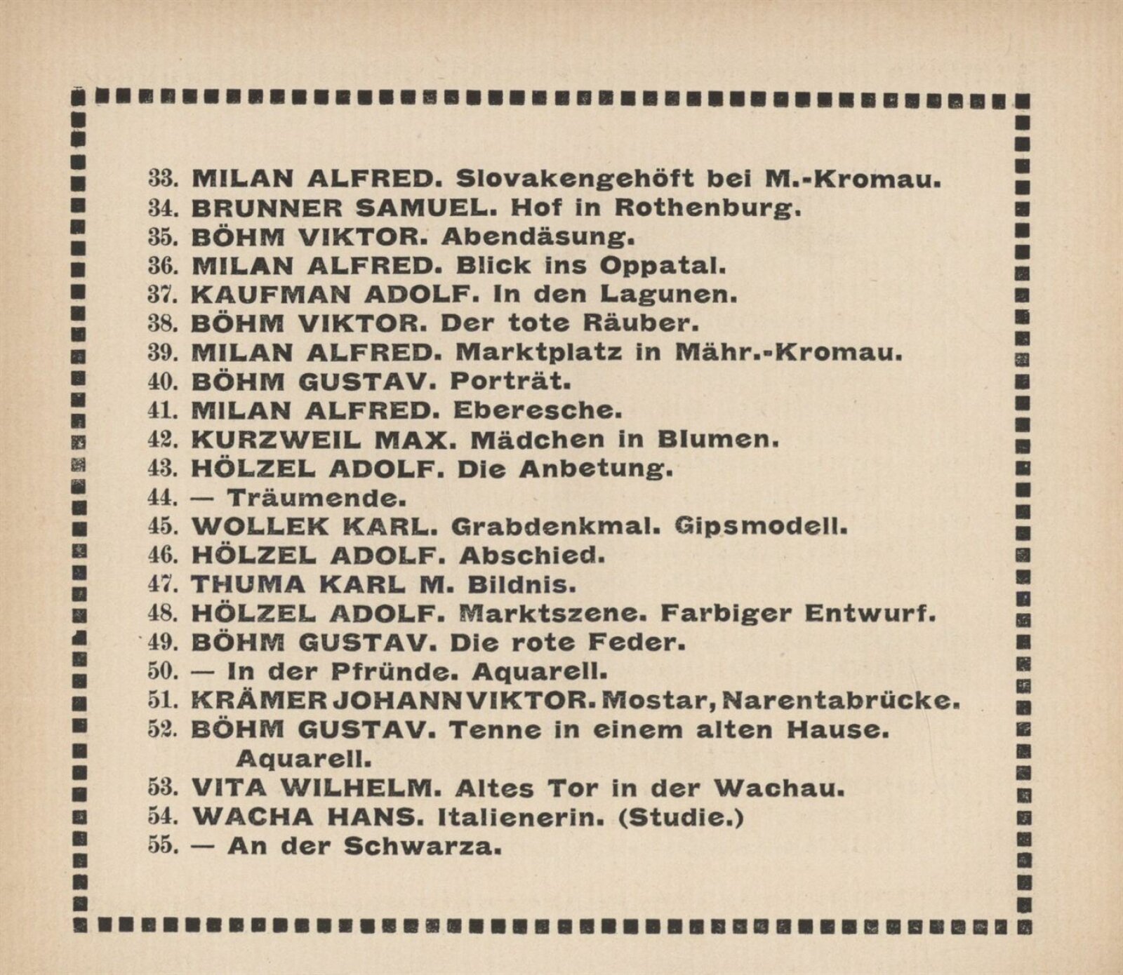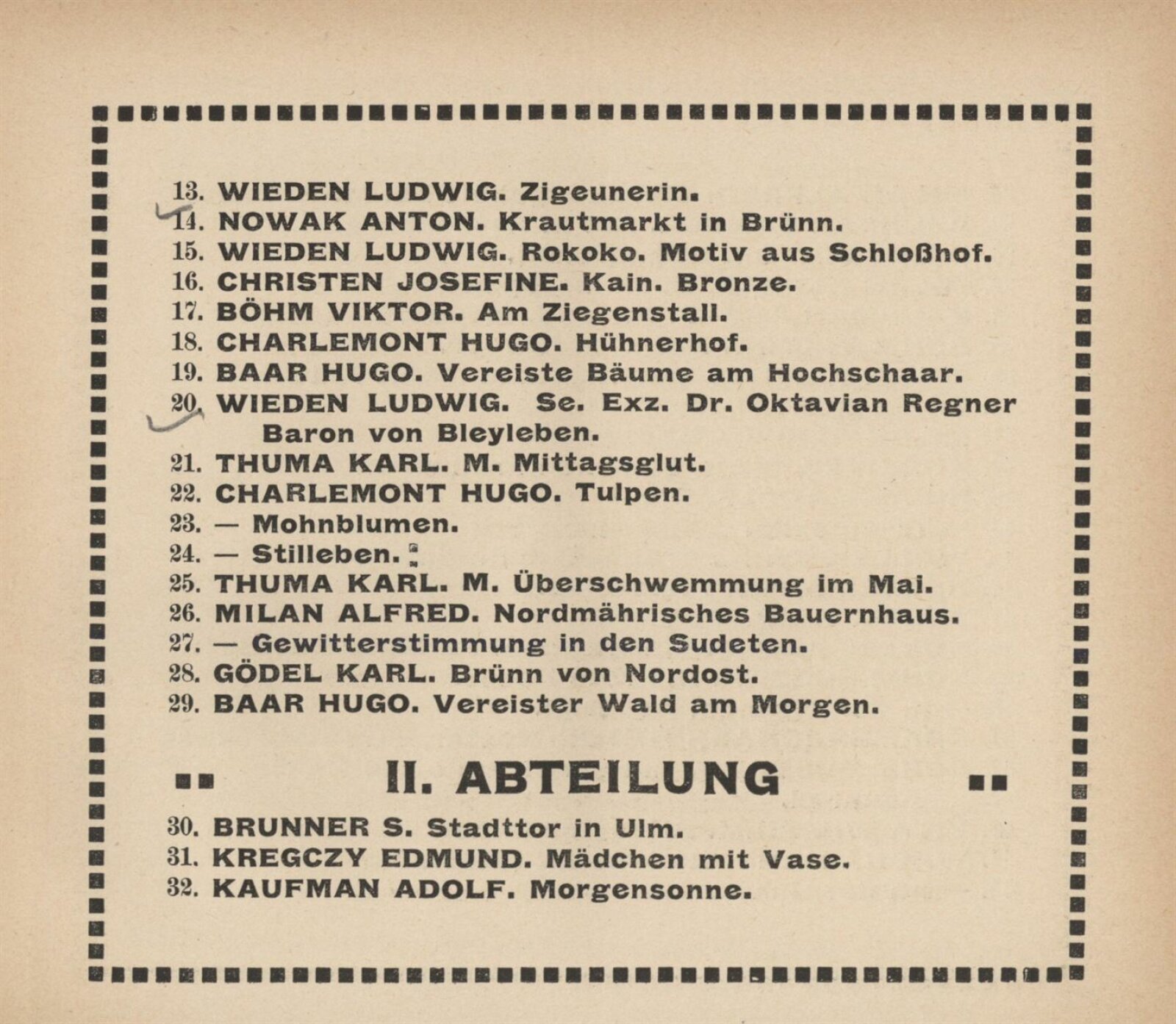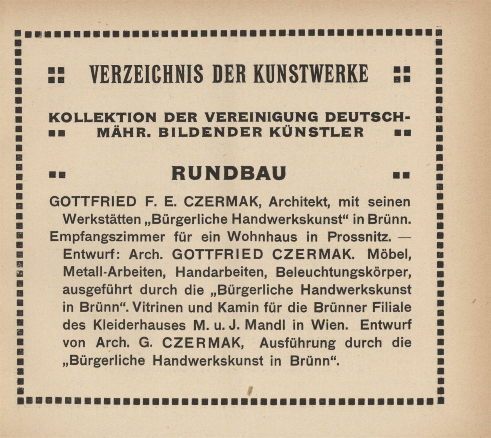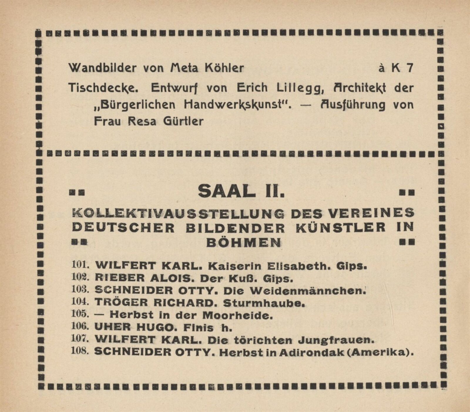Vereinigung deutsch–mährischer bildender Künstler, als Gast Verein deutscher bild. Künstler in Böhmen: 105. Ausstellung, Mährischer Kunstverein, Kaiser Franz Josef Jubiläumskünstlerhaus April–Mai 1912 / Brünn: Mährischer Kunstverein, 1912. – 24 s. Seznam členů spolku Vereinigung. – MZK; SVKOL; MG; UPM