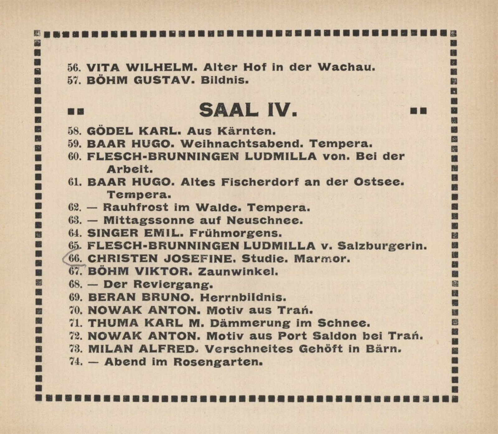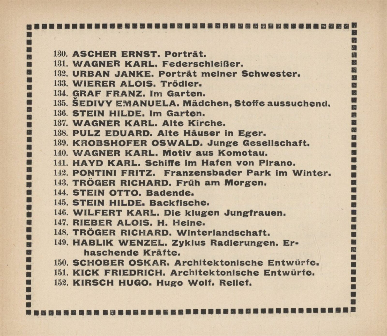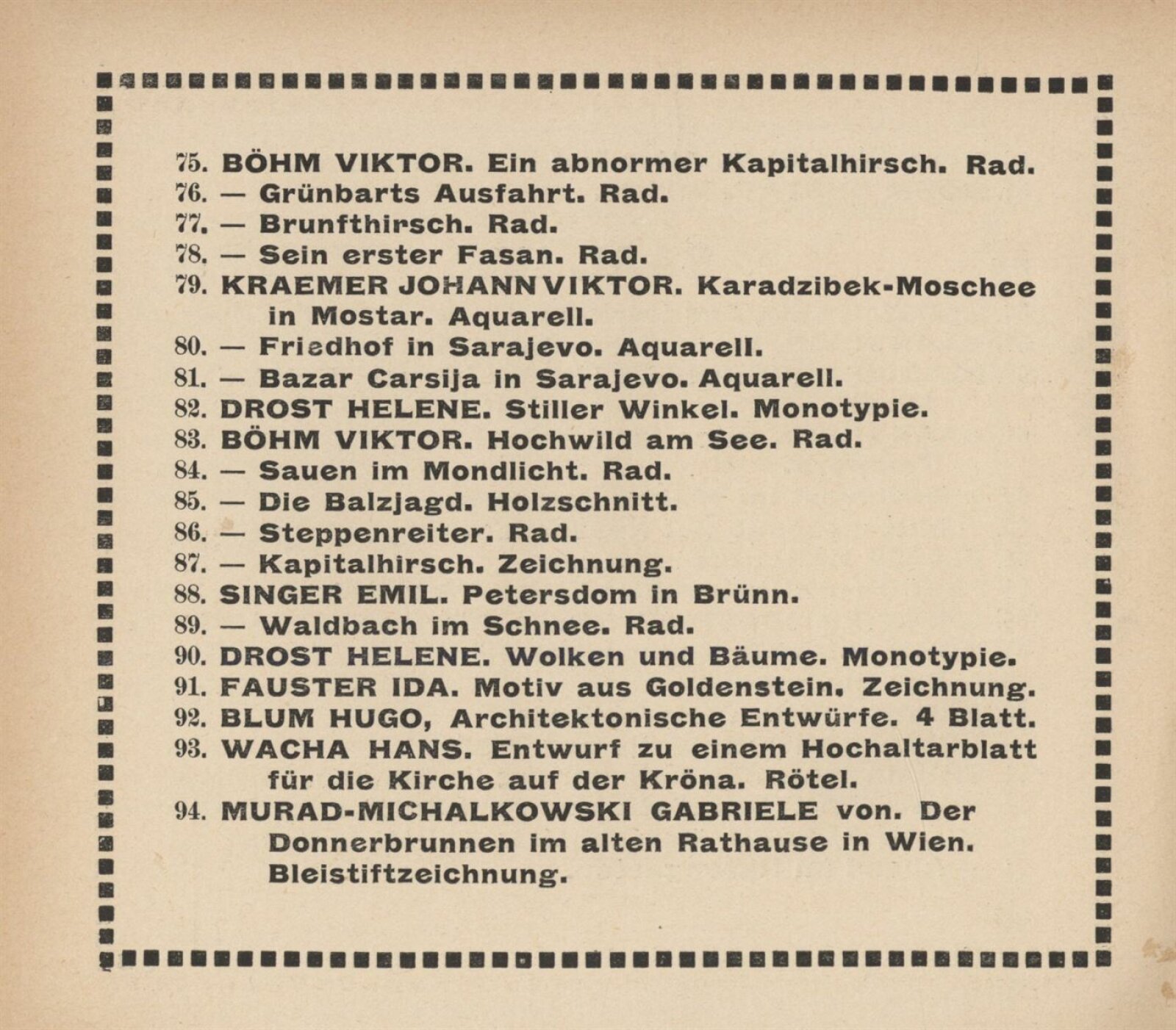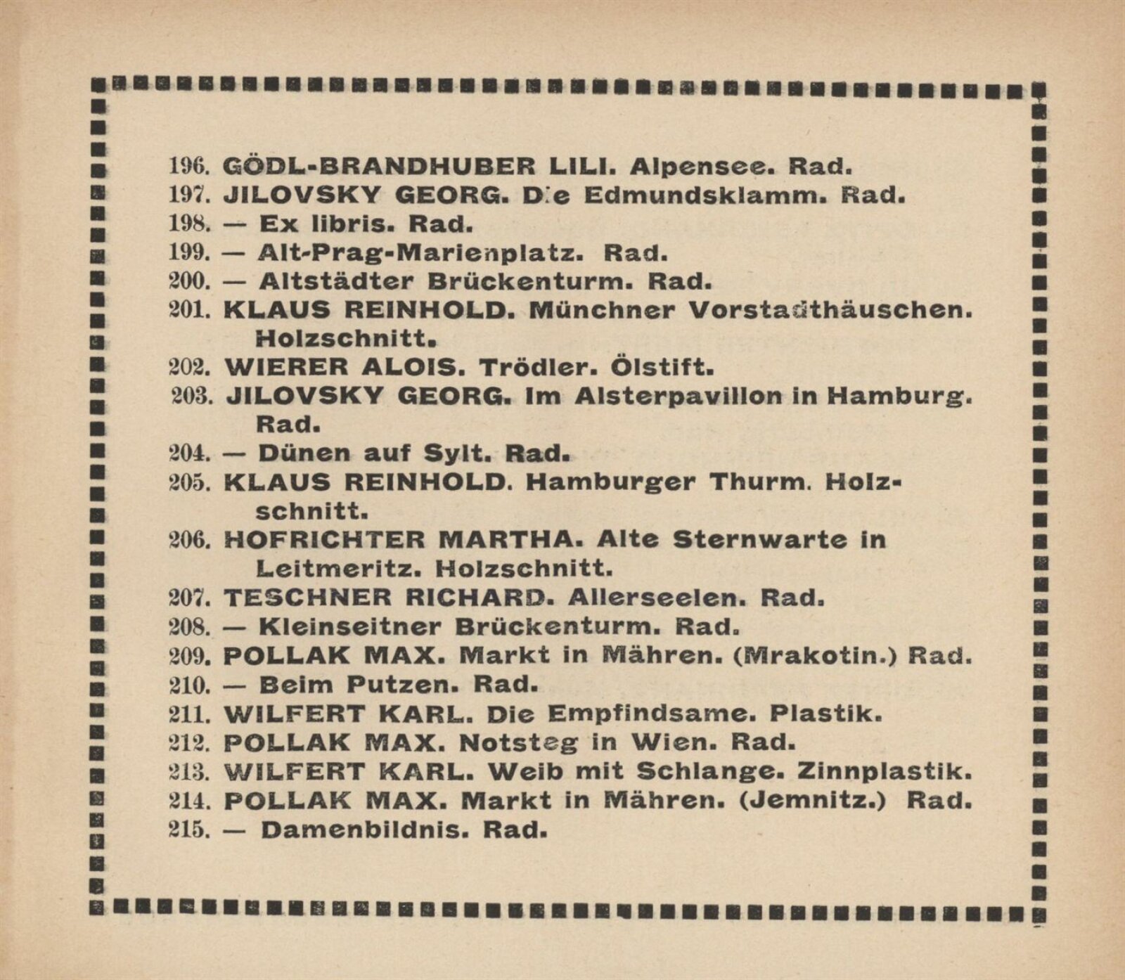 Vereinigung deutsch–mährischer bildender Künstler, als Gast Verein deutscher bild. Künstler in Böhmen: 105. Ausstellung, Mährischer Kunstverein, Kaiser Franz Josef Jubiläumskünstlerhaus April–Mai 1912 / Brünn: Mährischer Kunstverein, 1912. – 24 s. Seznam členů spolku Vereinigung. – MZK; SVKOL; MG; UPM