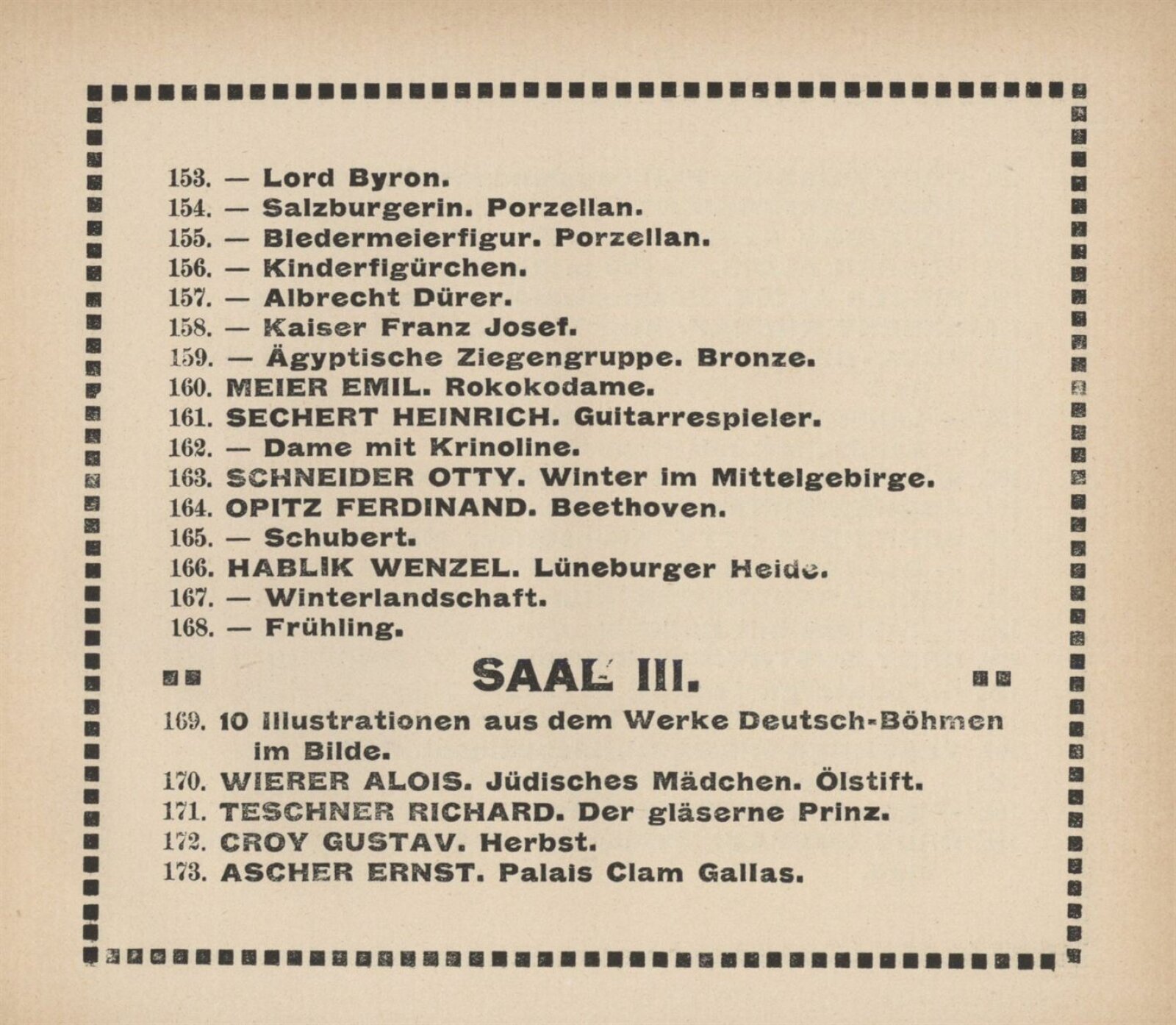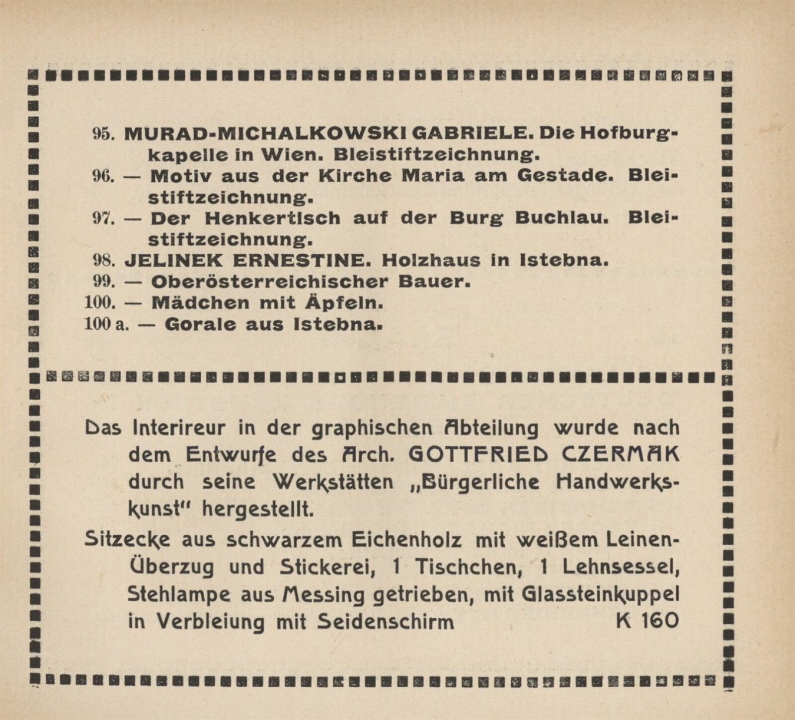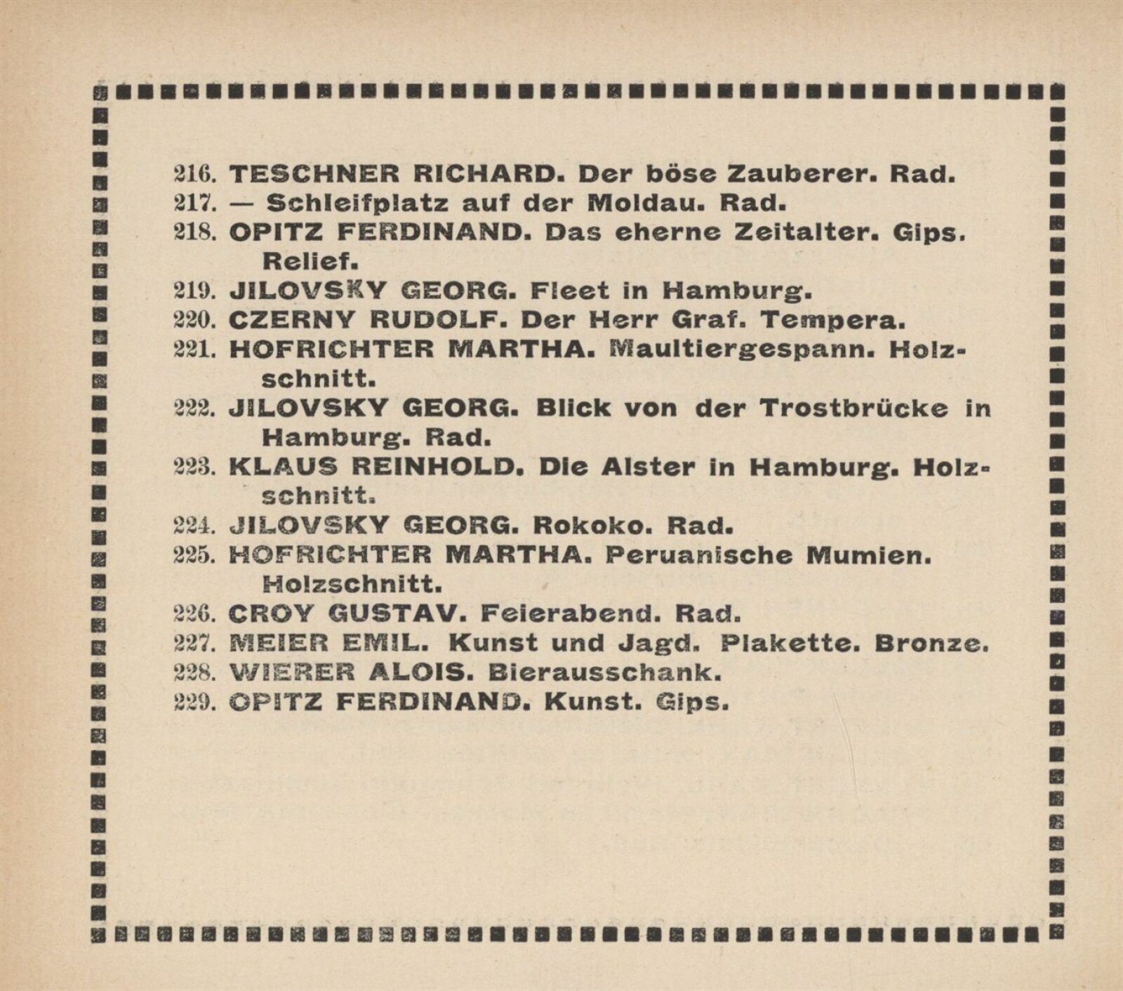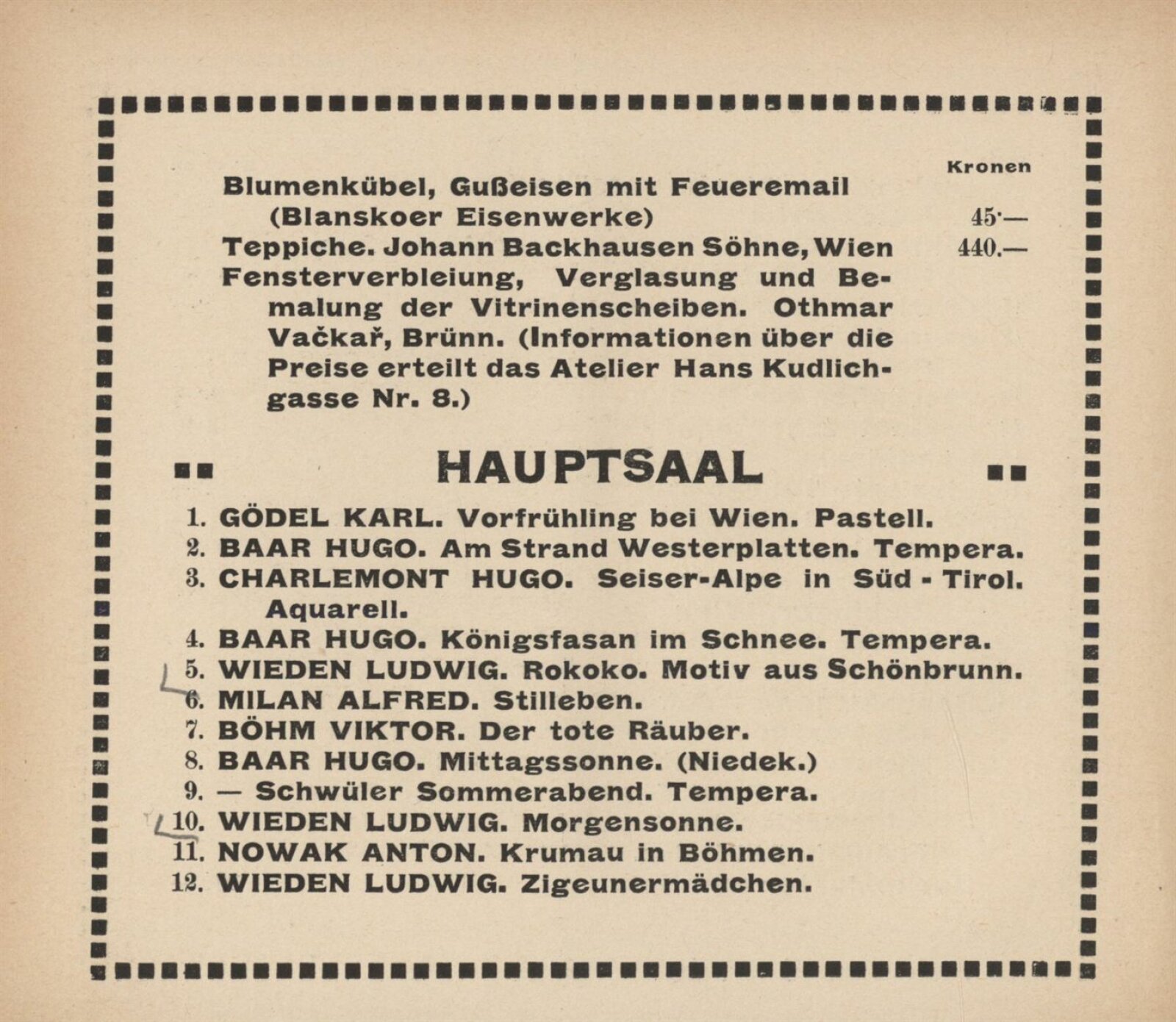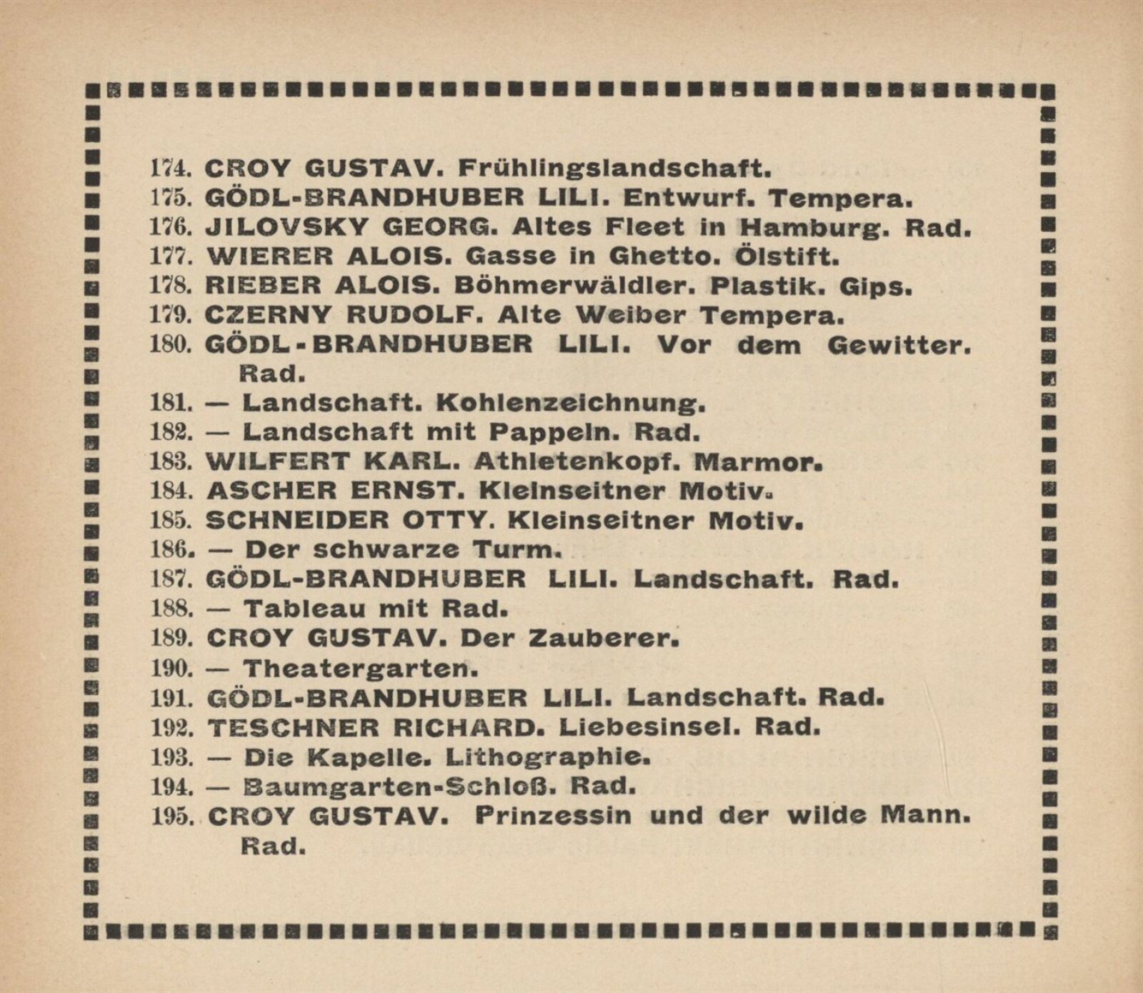 Vereinigung deutsch–mährischer bildender Künstler, als Gast Verein deutscher bild. Künstler in Böhmen: 105. Ausstellung, Mährischer Kunstverein, Kaiser Franz Josef Jubiläumskünstlerhaus April–Mai 1912 / Brünn: Mährischer Kunstverein, 1912. – 24 s. Seznam členů spolku Vereinigung. – MZK; SVKOL; MG; UPM