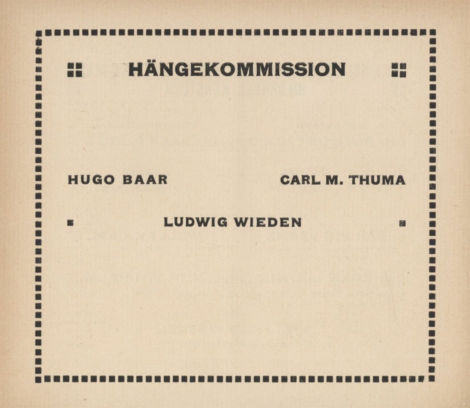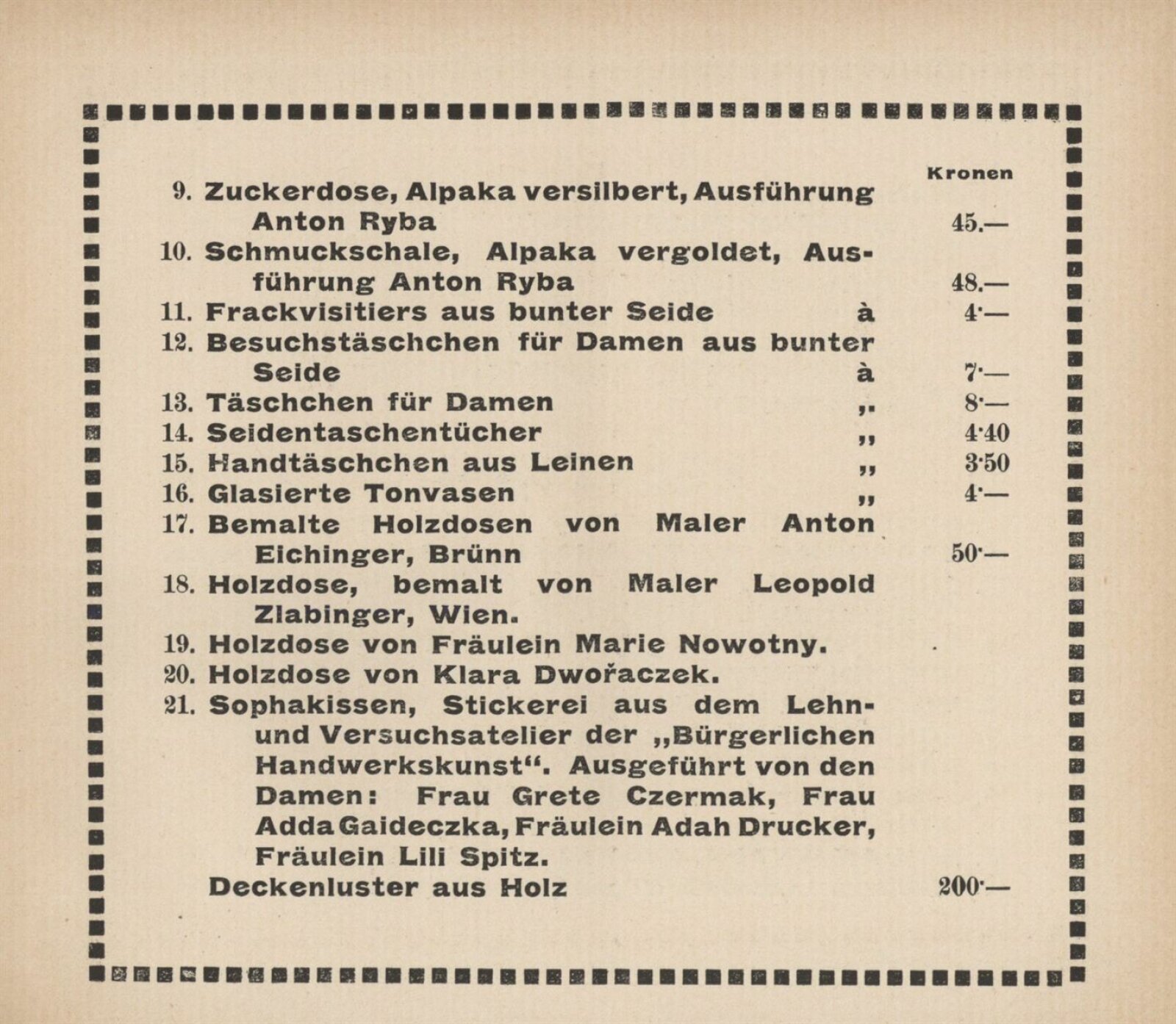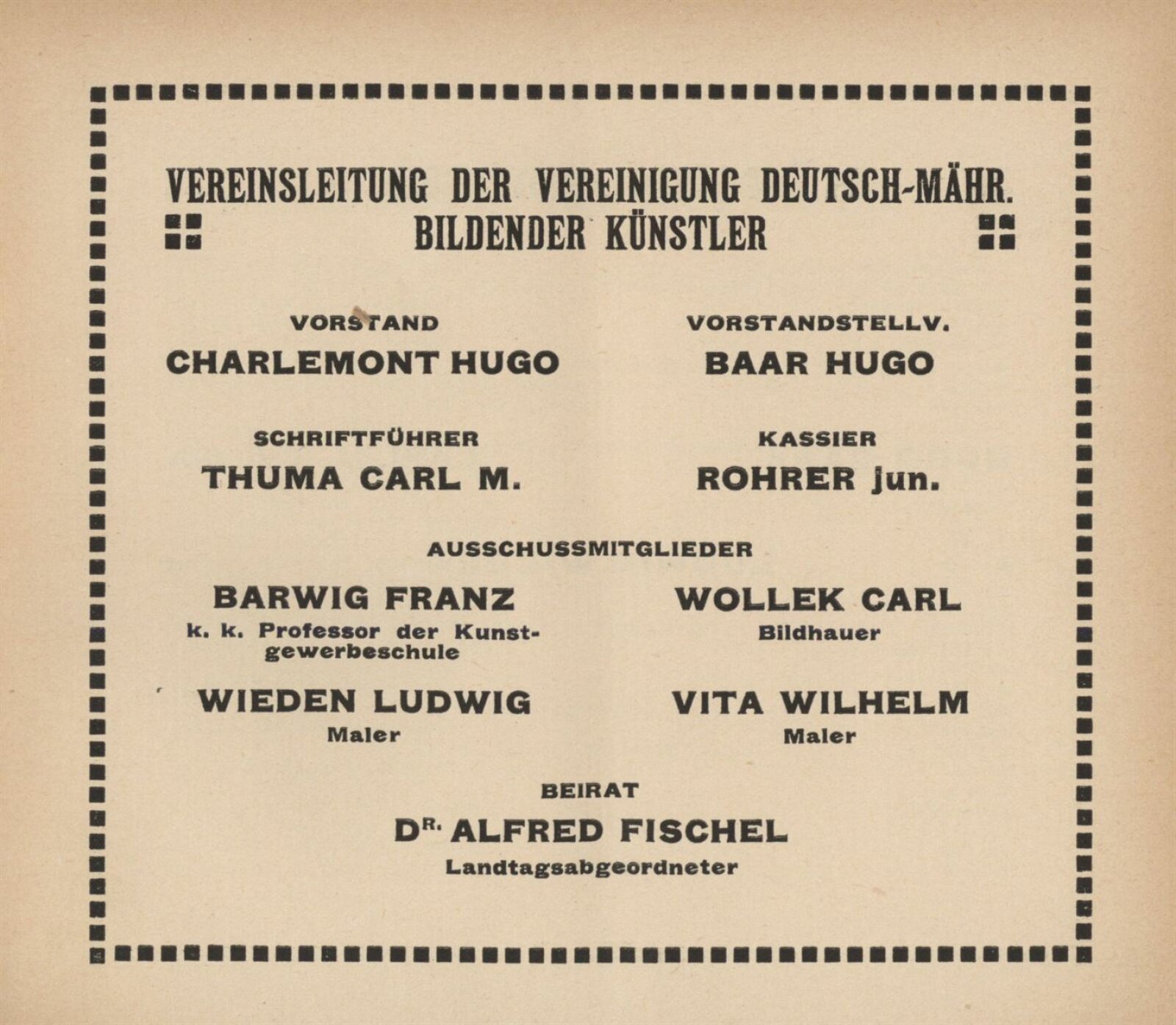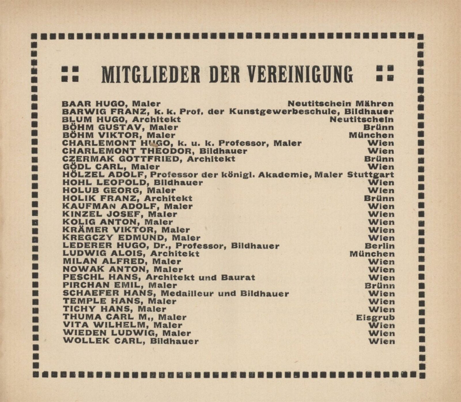 Ernst Ascher, Hugo Baar, Bruno Beran, Hugo Blum, Gustav Böhm, Viktor Böhm, Samuel Brunner, Gustav Croy, Gottfried Czermak, Rudolf Czerny, Helene Drost, Ludwig Ehrenhaft, Ida Fauster, Ludmilla Flesch-Brunningen, Karl Gödel, Lili Gödl-Brandhuber, Franz Graf, Wenzel Hablik, Karl Hayd, Martha Hofrichter, Adolf Hölzel, Hugo Charlemont, Josefine Christen, Enestine Jelinek, Georg Jilovsky, Fides Karny, S. Kars, Adolf Kaufmann, Friedrich Kick, Hugo Kirsch, Reinhold Klaus, Karl Kostial, Hubert Kovařik, Johann Viktor Krämer, Edmund Kregczy, Oswald Krobshofer, Max Kurzweil, Emil Meier, Alfred Milan, Gabriele Murad-Michalkowski, Anton Nowak, Ferdinand Opitz, Max Pollak, Fritz Pontini, Eduard Pulz, Alois Rieber, Heinrich Sechert, Oskar Seifart, Hans Schaefer, Otty Schneider, Oskar Schober, Leonhard Schuler, Emil Singer, Ferdinand Staeger, Hilde Stein, Otto Stein, Emanuela Šedivy, Richard Teschner, Carl M. Thuma, Richard Tröger, Hugo Uher, Janke Urban, Wilhelm Vita, Karl Wagner, Hans Wacha, Ludwig Wieden, Alois Wierer, Karl Wilfert, Maria Wilfert-Waltl, Adolf Wolf-Rotenhan, Karl Wollek