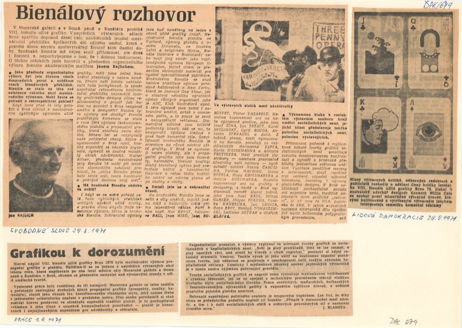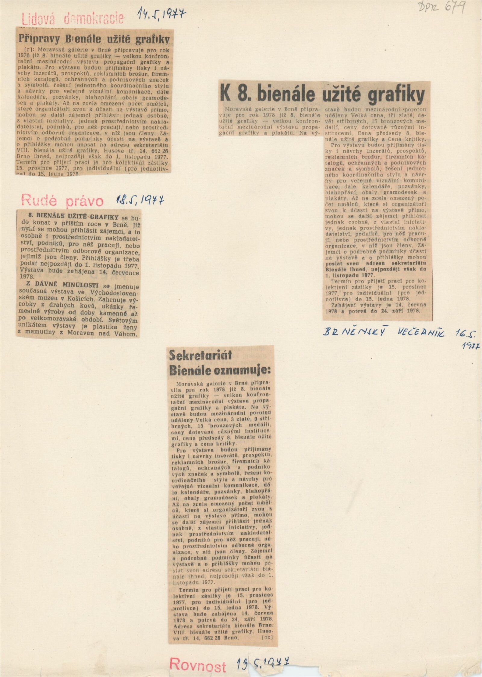 Mezinárodní výstava propagační grafiky a plakátu. VIII. bienále užité grafiky Brno 1978: Moravská galerie a Dům pánů z Kunštátu 14. 6. – 24. 9. 1978 / Text Jiří Hlušička. - Brno: Moravská galerie, 391 s., obr. Název a text též francouzsky DPK 679; MZK
