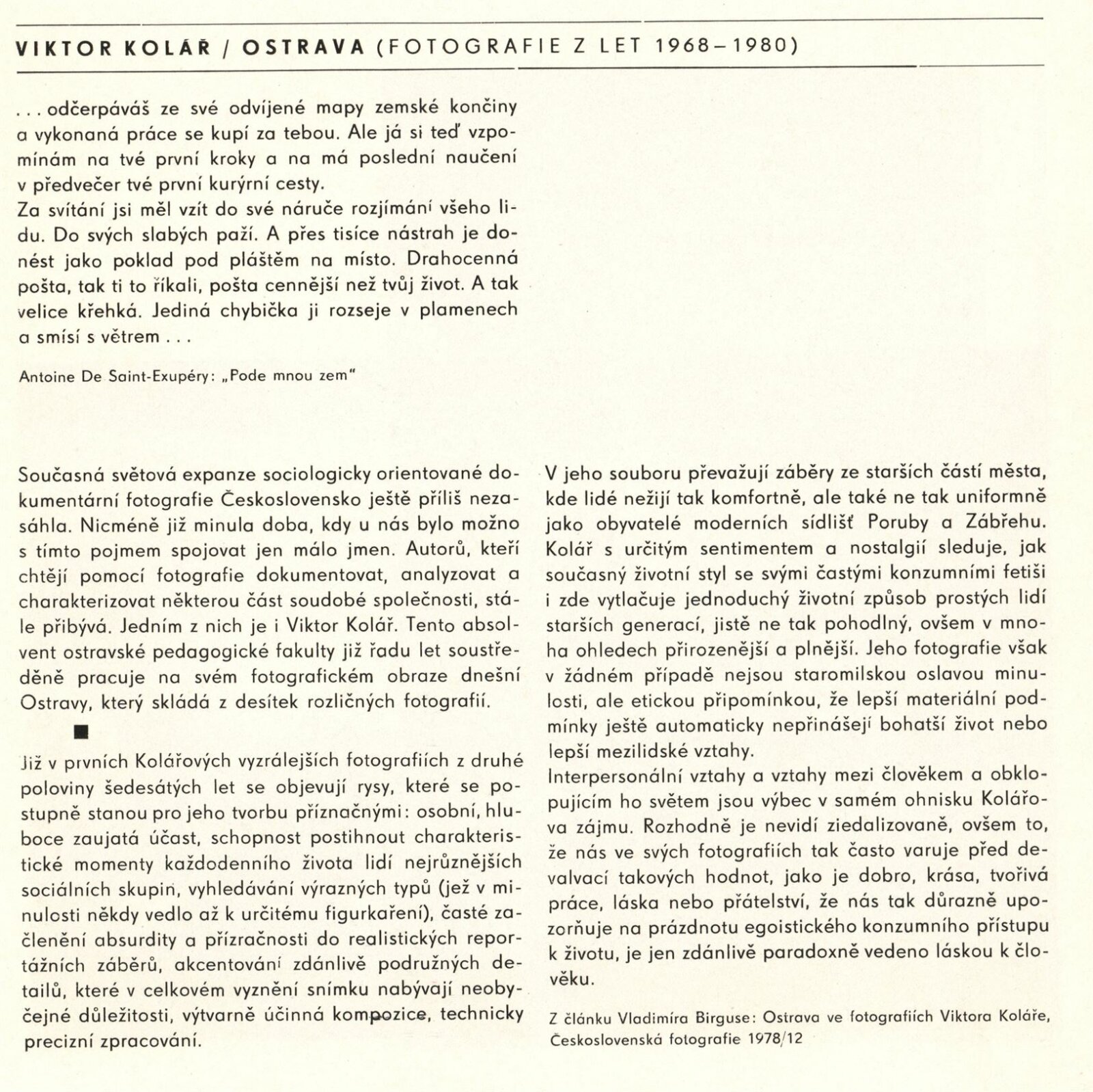 Viktor Kolář. Ostrava – fotografie z let 1968–1980: Dům umění / Dům pánů z Kunštátu, Kabinet fotografie J. Funka, 180. výstava, Dům pánů z Kunštátu 12. 12. 1980 – 11. 1. 1981 / text Vladimír Birgus. – Brno: DUmB, 1980. – 9 s., obr., životní data, výstavy, DPK 748. – MZK; MG