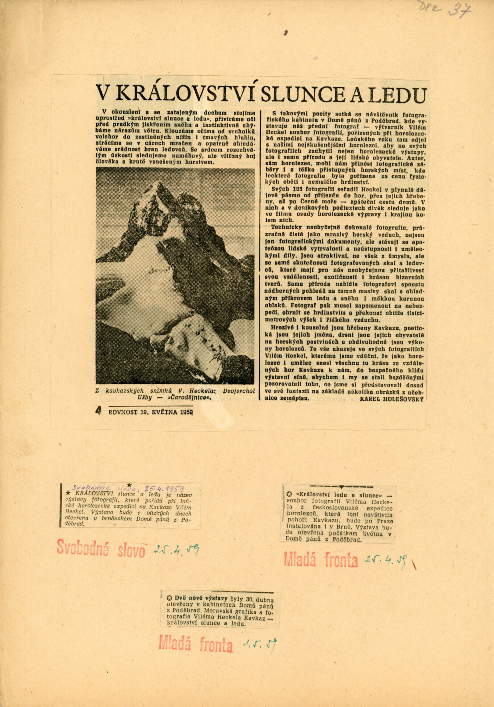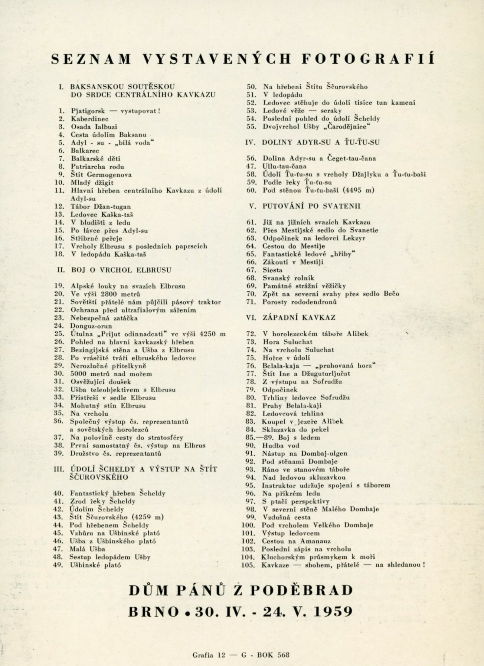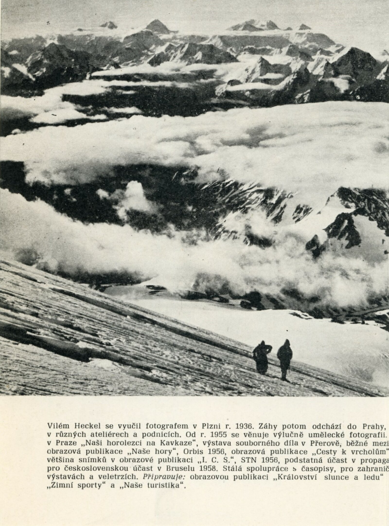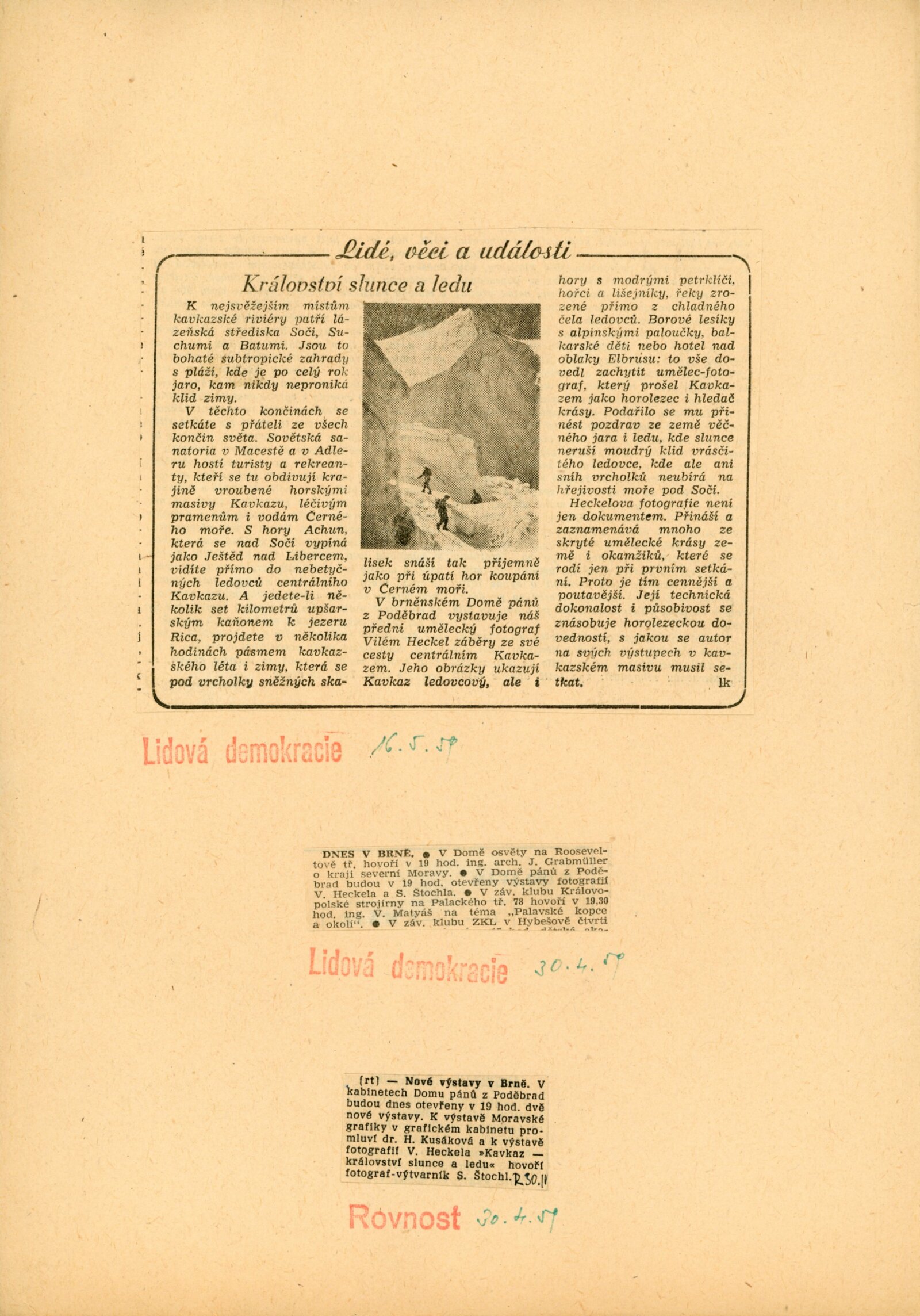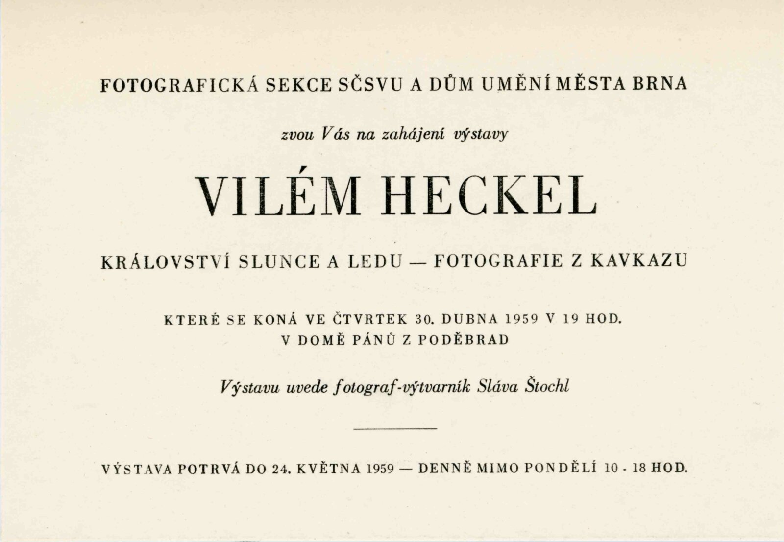 Vilém Heckel. Království slunce a ledu. Fotografie z Kavkazu: Dům umění města Brna / Dům pánů z Poděbrad, Kabinet fotografie J. Funka, 7. výstava, 30. 4. – 24. 5. 1959 / Text: Sláva Štochl. – Brno: DUmB, 1959. – skládačka, 6 s., obr., životopis, DPK 37. – MG