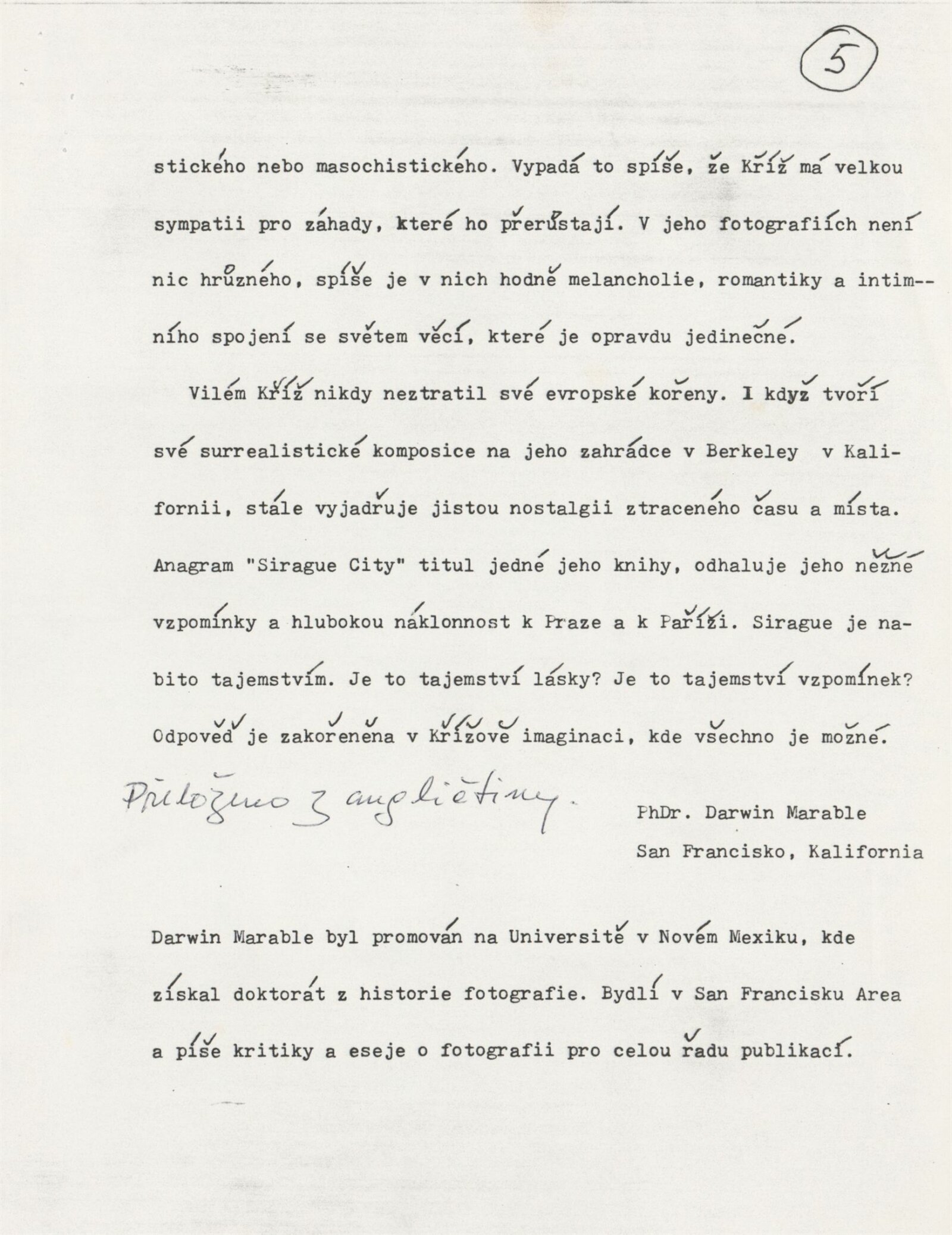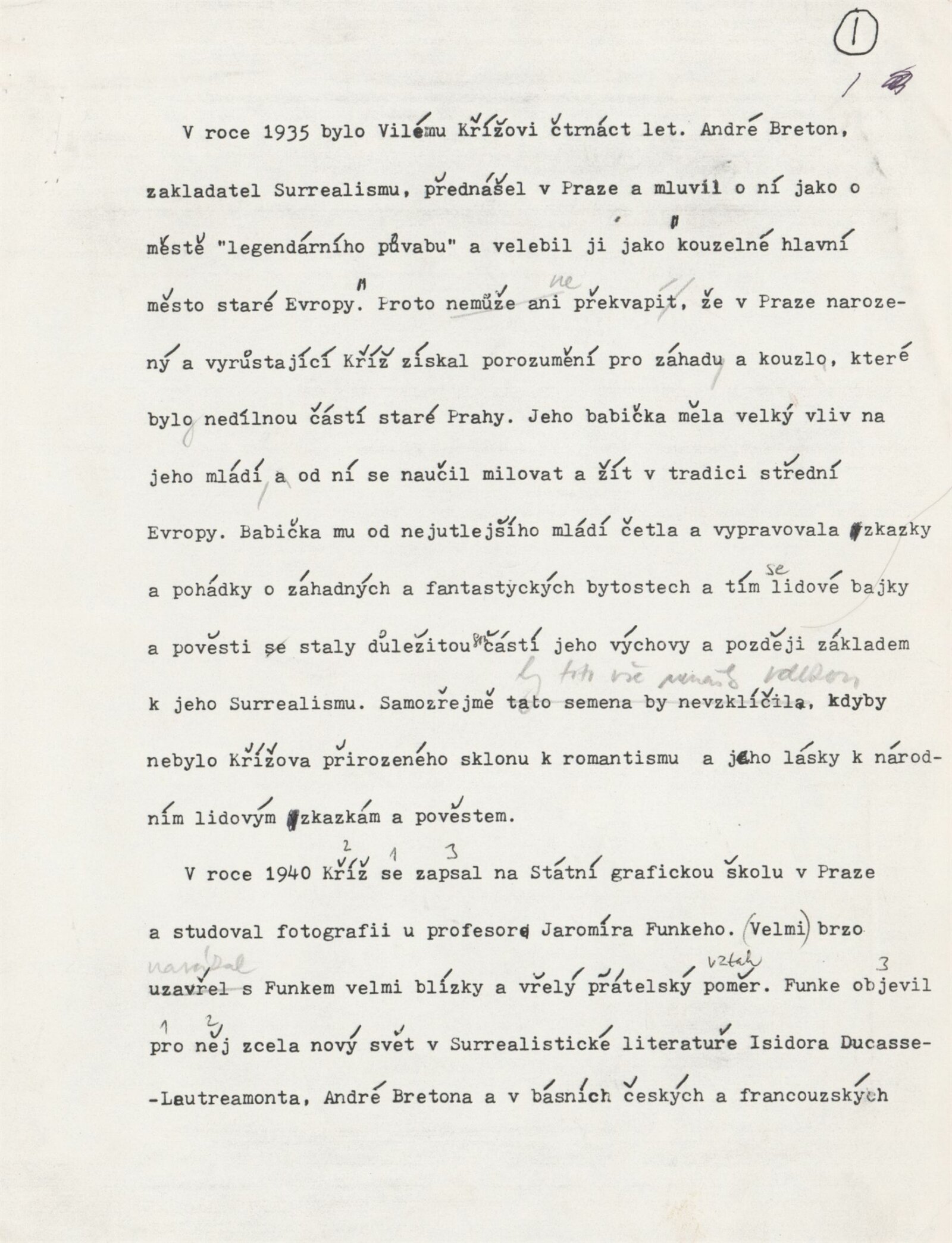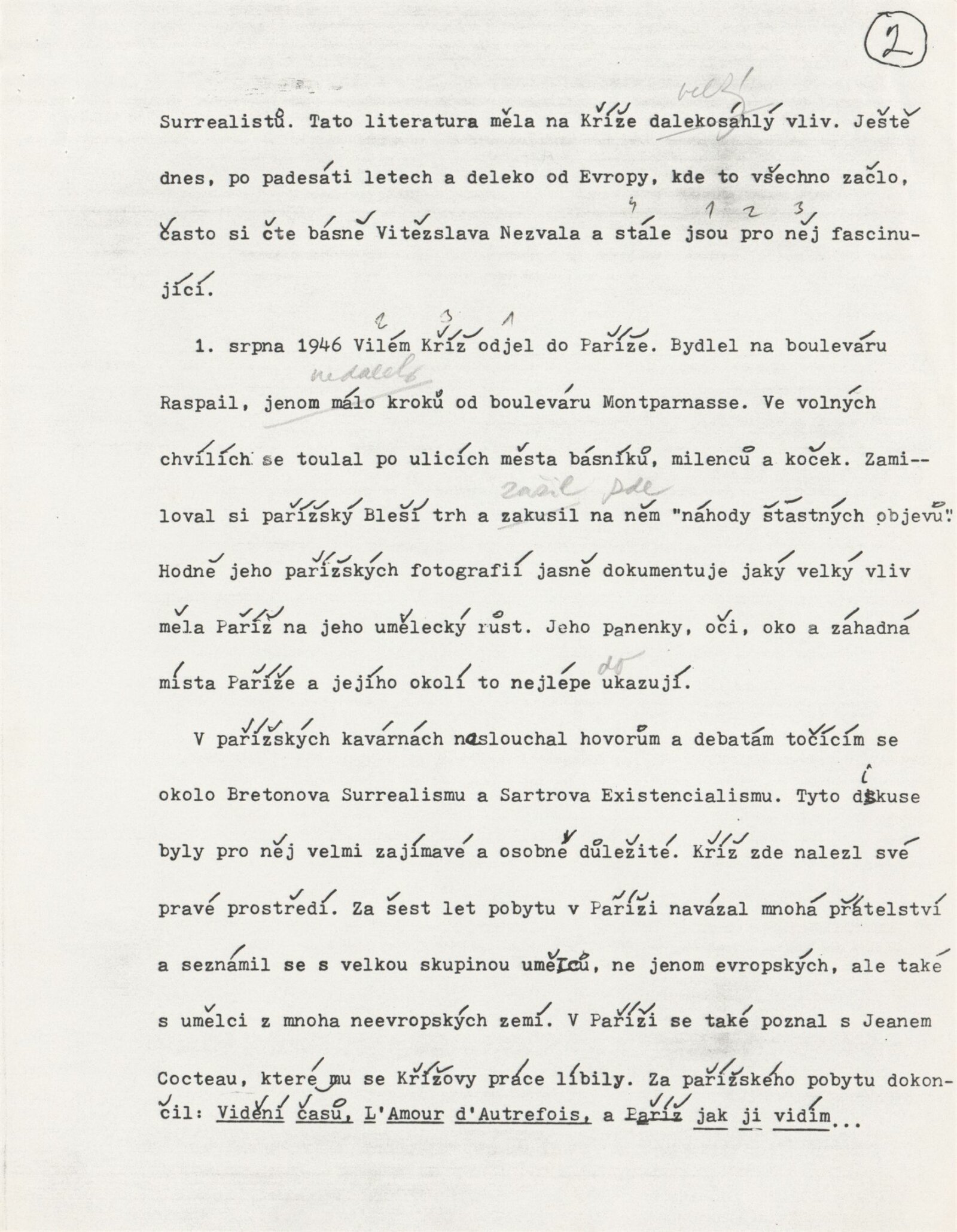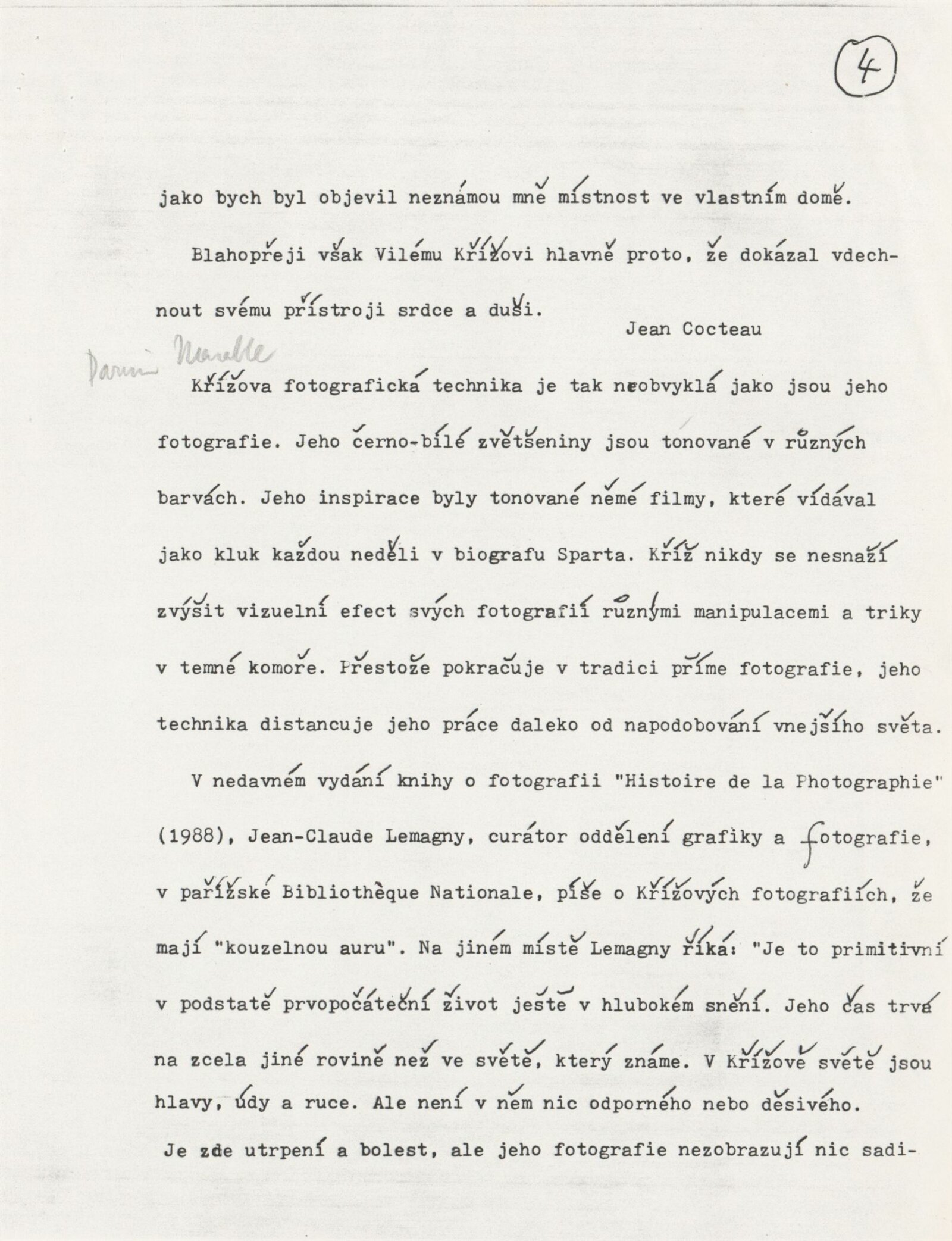 katalog, strojopis a podklady pro katalog, fotografie instalace výstavy, korespondence DU a autor, provozní korespondence, adresa umělce, katalog (Vilém Kříž, Bibliothèque nationale, Paris)