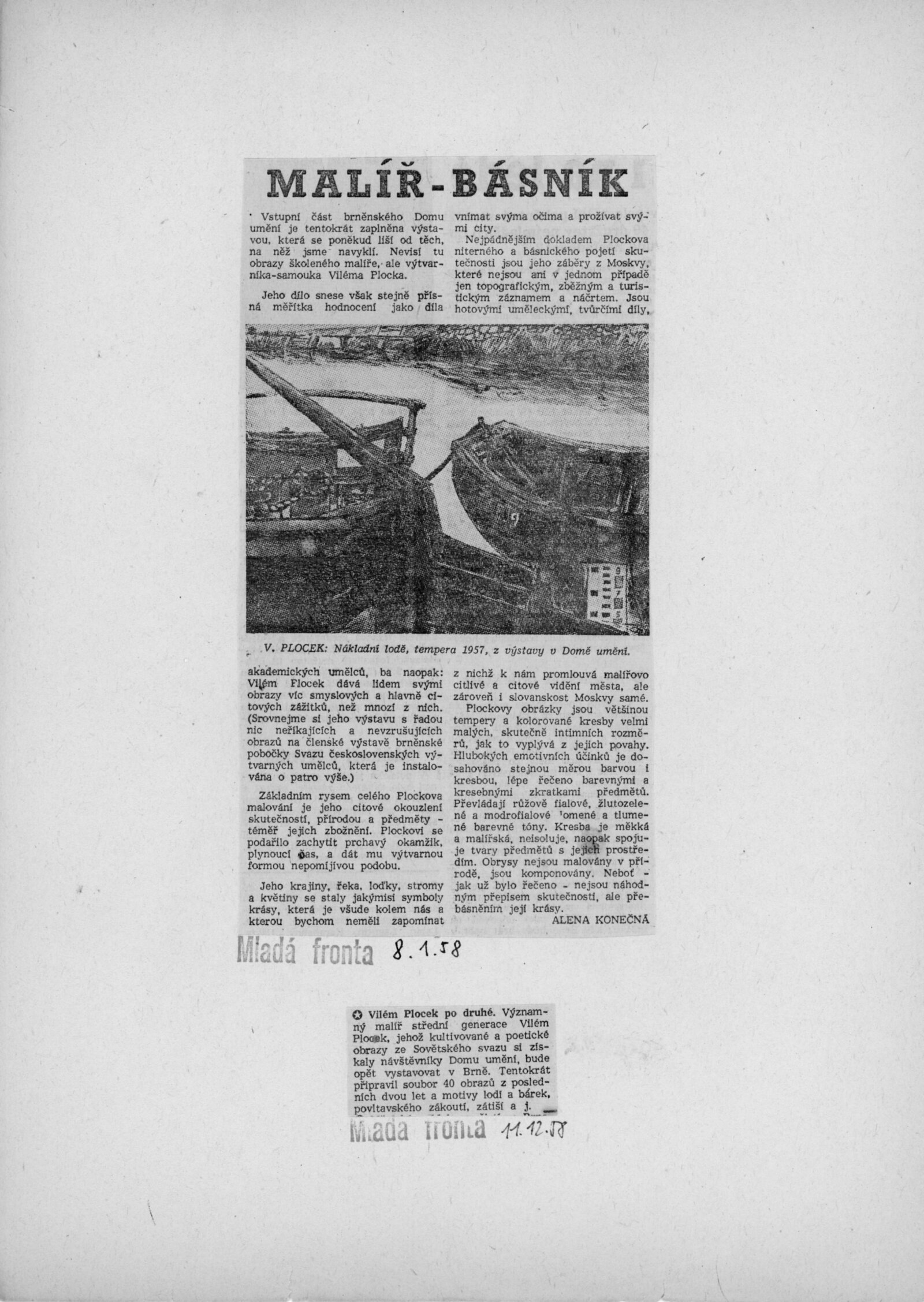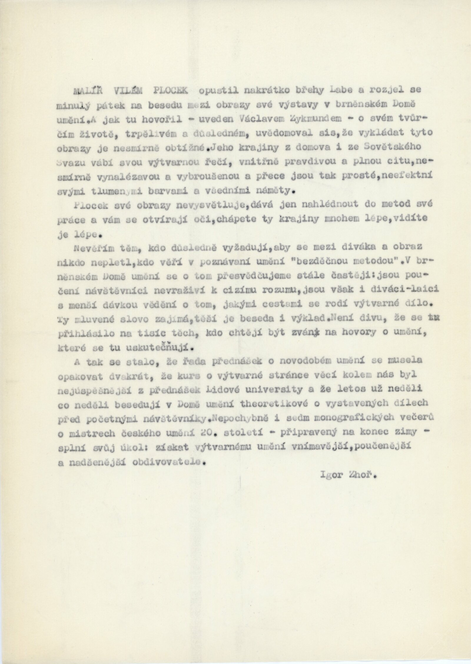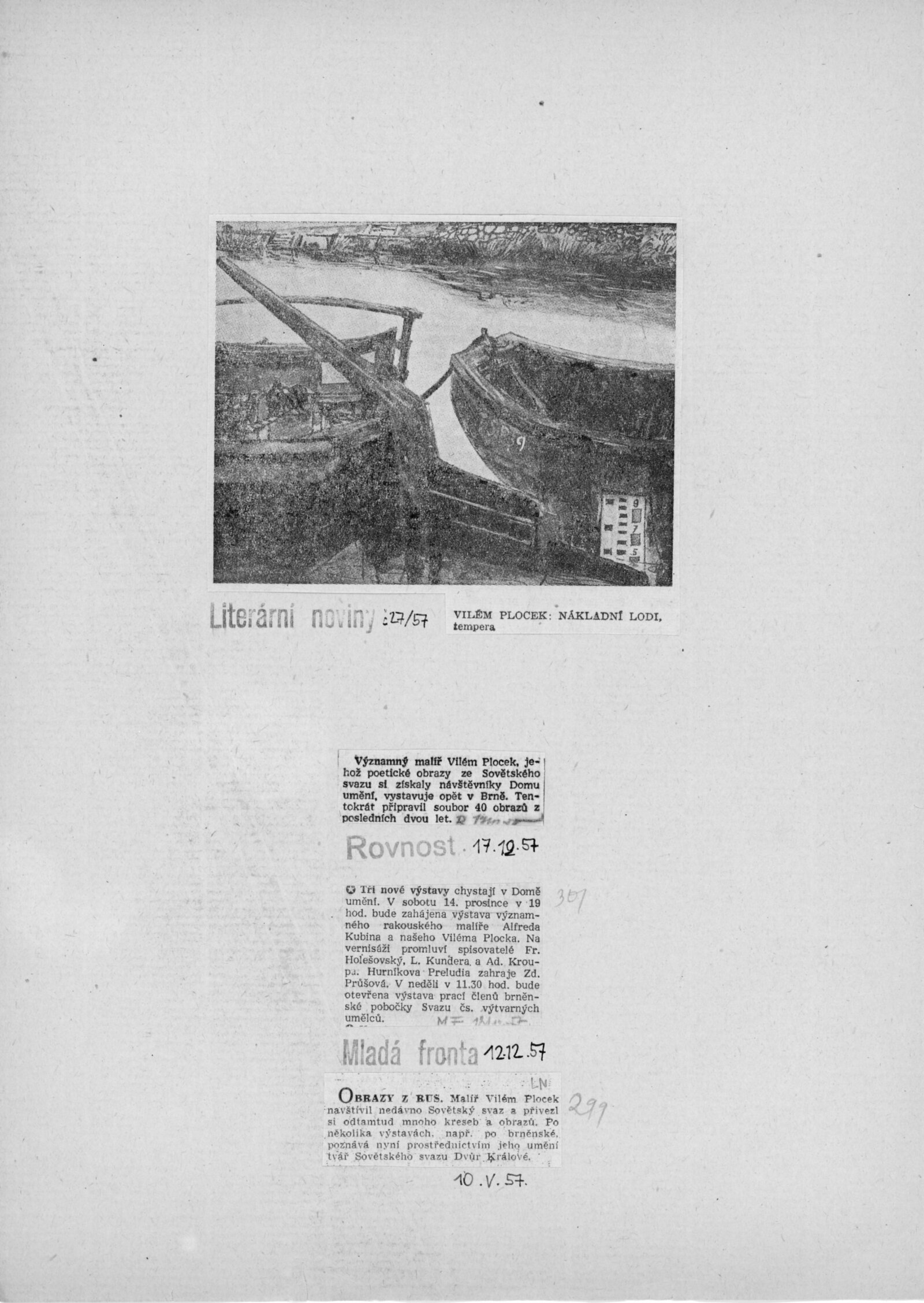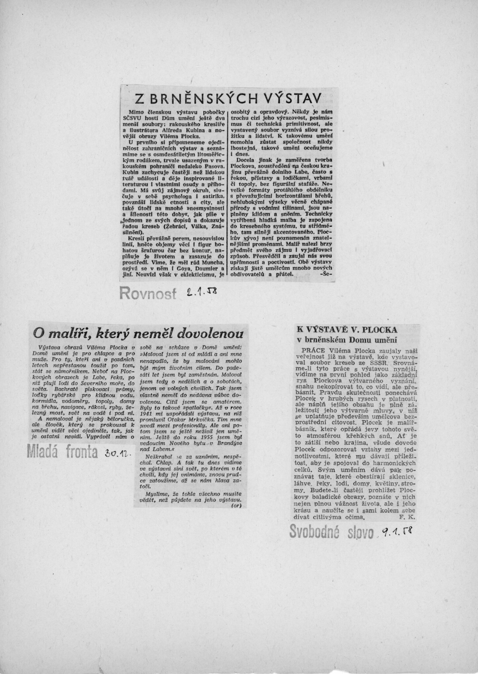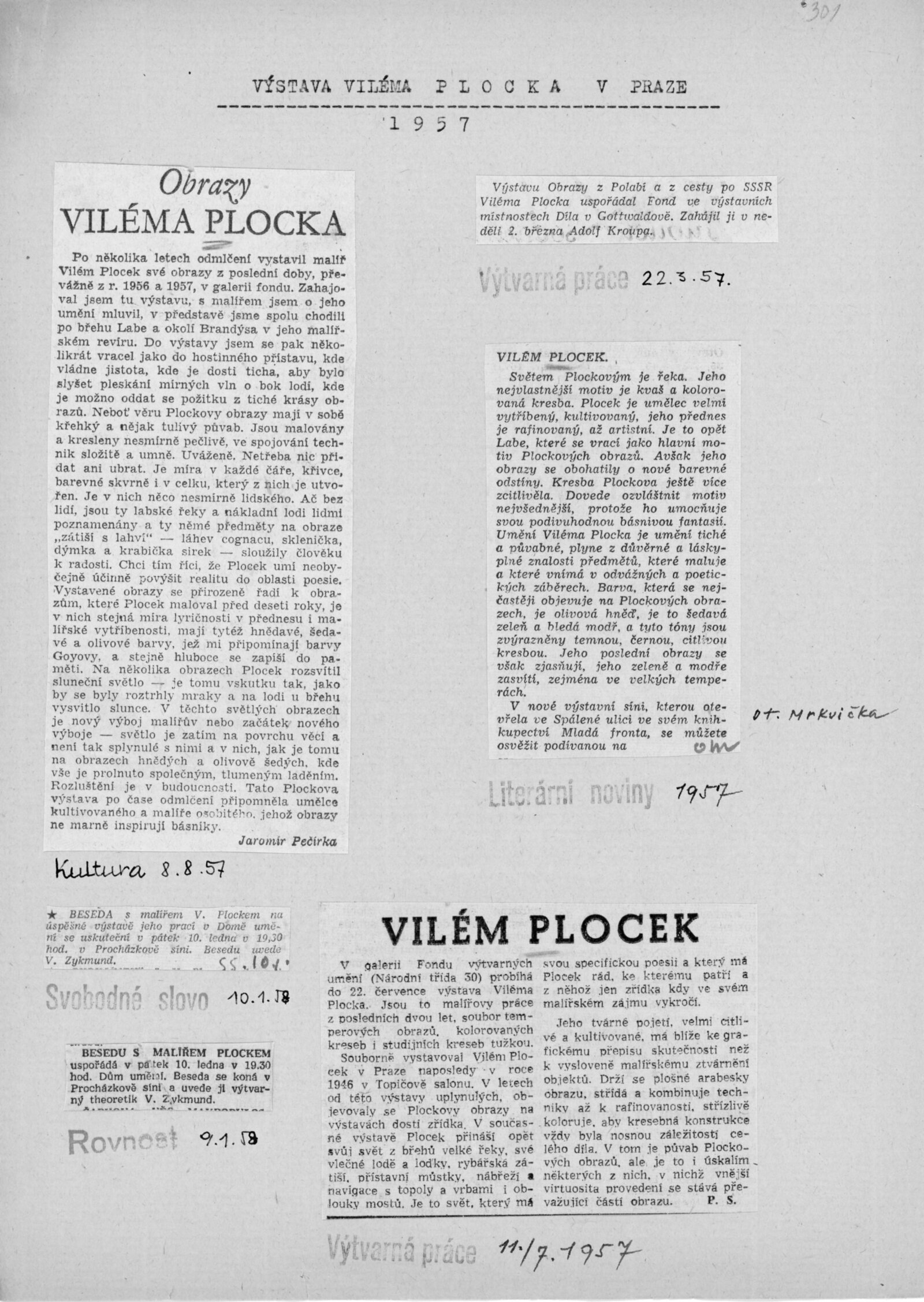 Vilém Plocek. Obrazy z posledních let: Dům umění, 14. 12. 1957 – 12. 1. 1958 / Převzatý katalog. Vilém Plocek: Galerie Českého fondu výtvarných umění Praha II, Národní tř. 30, 28. 6. – 22. 7. 1957 / Text: Jaromír Pečírka. – Praha: Český fond výtvarných umění, 1957. – 12 s., obr., báseň Jindřicha Hilčra, výstavy, reprodukce, básně, ilustrace, obálky, frontispice, DU 301. – MG