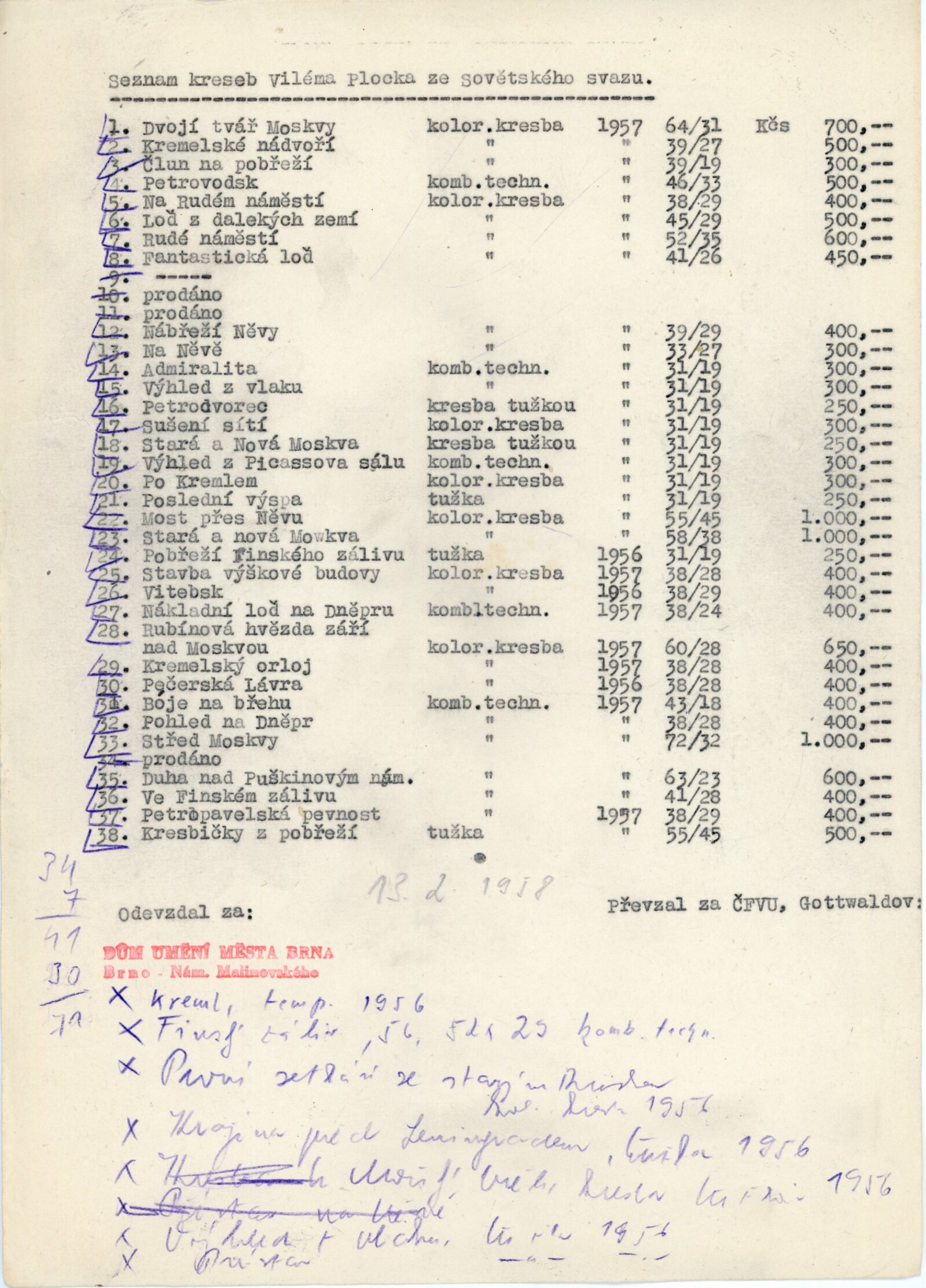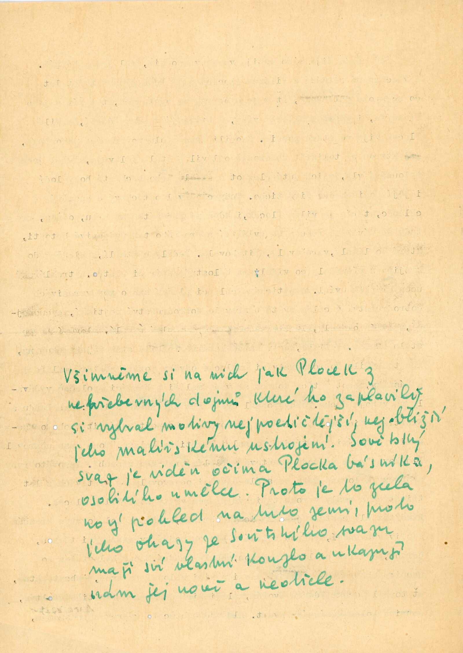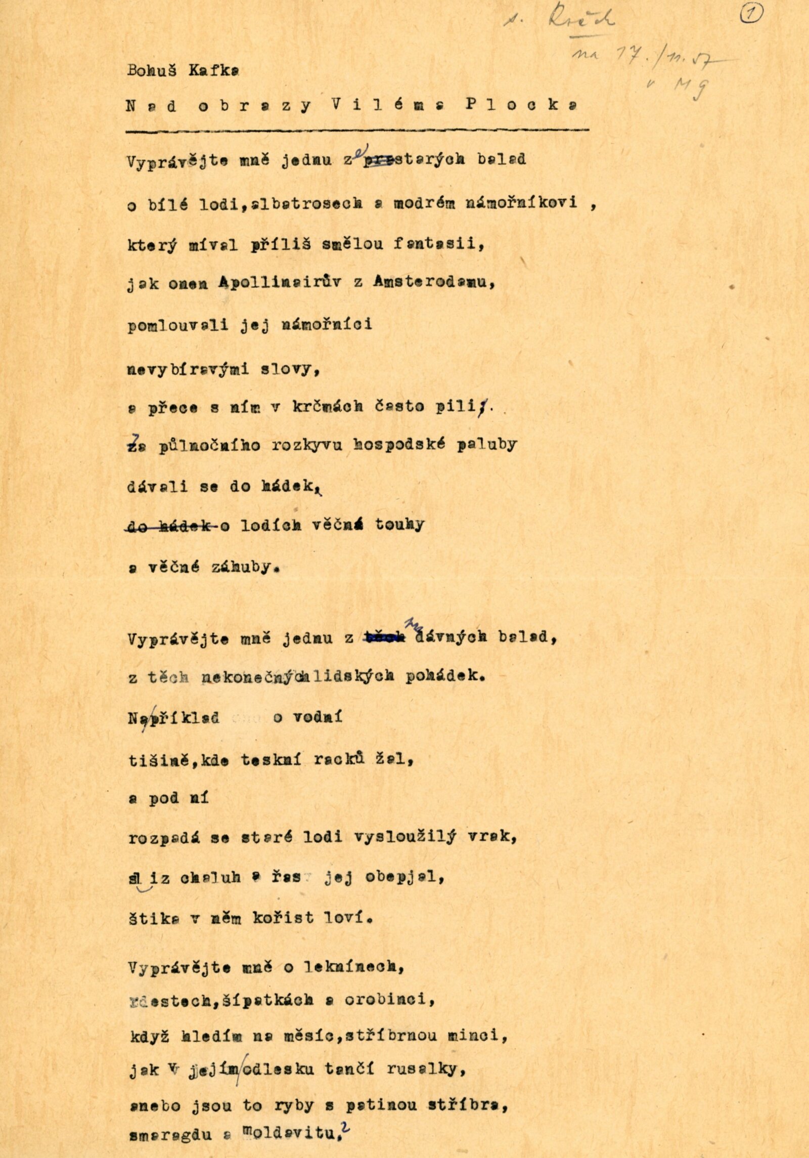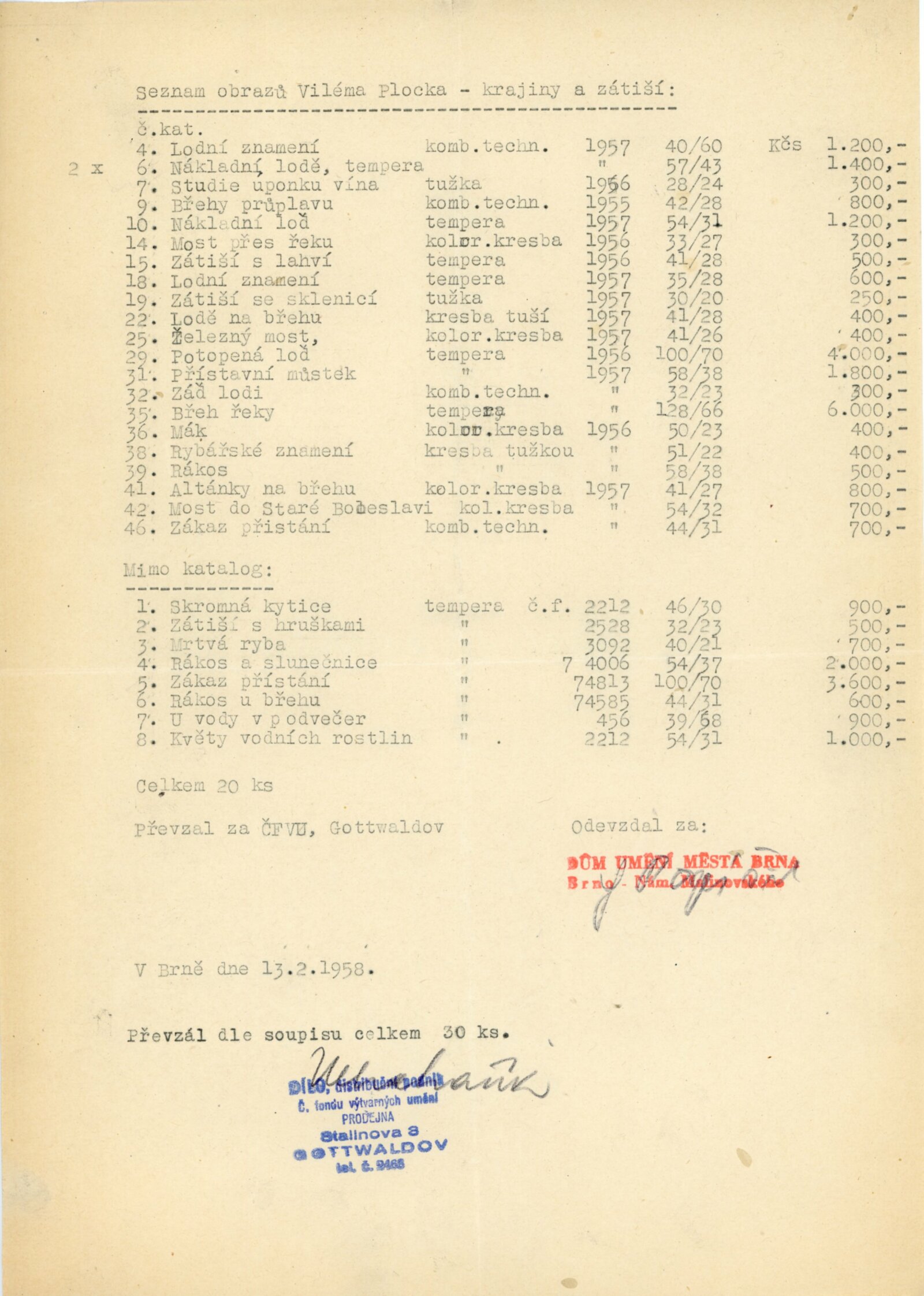 Vilém Plocek. Obrazy z posledních let: Dům umění, 14. 12. 1957 – 12. 1. 1958 / Převzatý katalog. Vilém Plocek: Galerie Českého fondu výtvarných umění Praha II, Národní tř. 30, 28. 6. – 22. 7. 1957 / Text: Jaromír Pečírka. – Praha: Český fond výtvarných umění, 1957. – 12 s., obr., báseň Jindřicha Hilčra, výstavy, reprodukce, básně, ilustrace, obálky, frontispice, DU 301. – MG