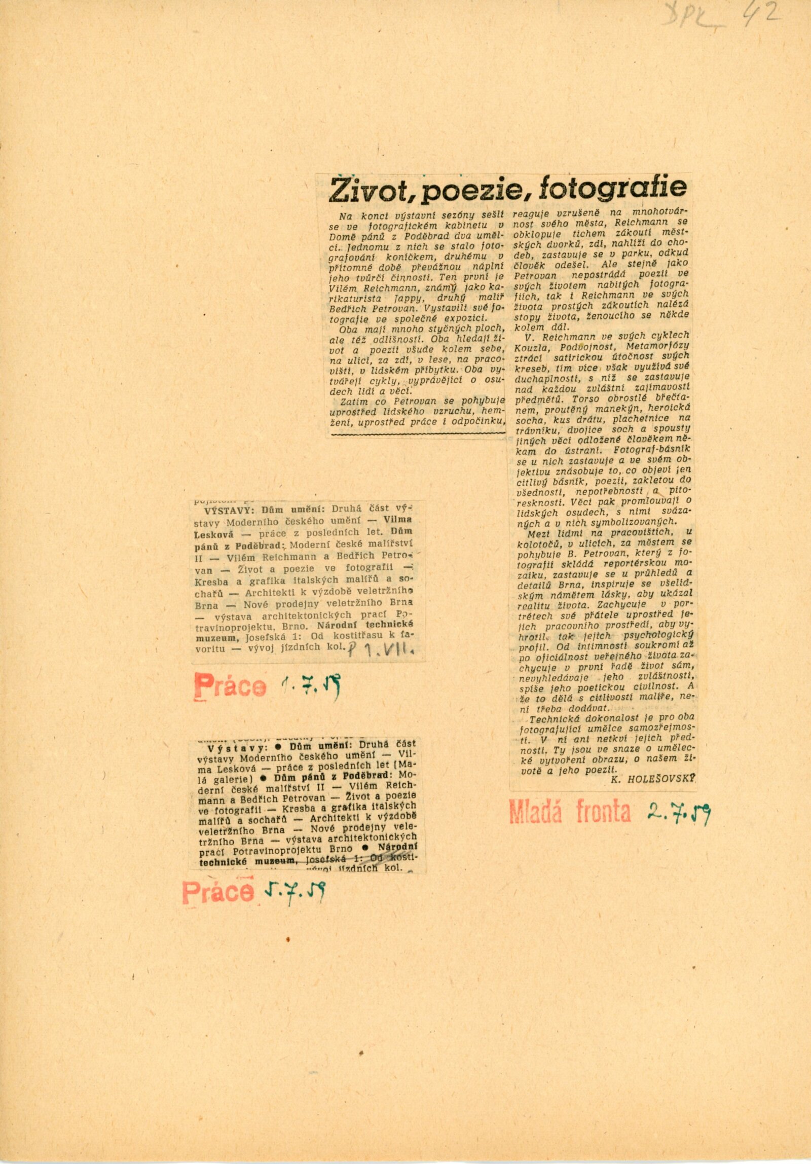 pozvánka, úvodní slovo na zahájení výstavy (Ludvík Kundera), báseň „Fotografie z Pavlova“ (Jan Skácel), fotografie z vernisáže, provozní korespondence, recenze v tisku