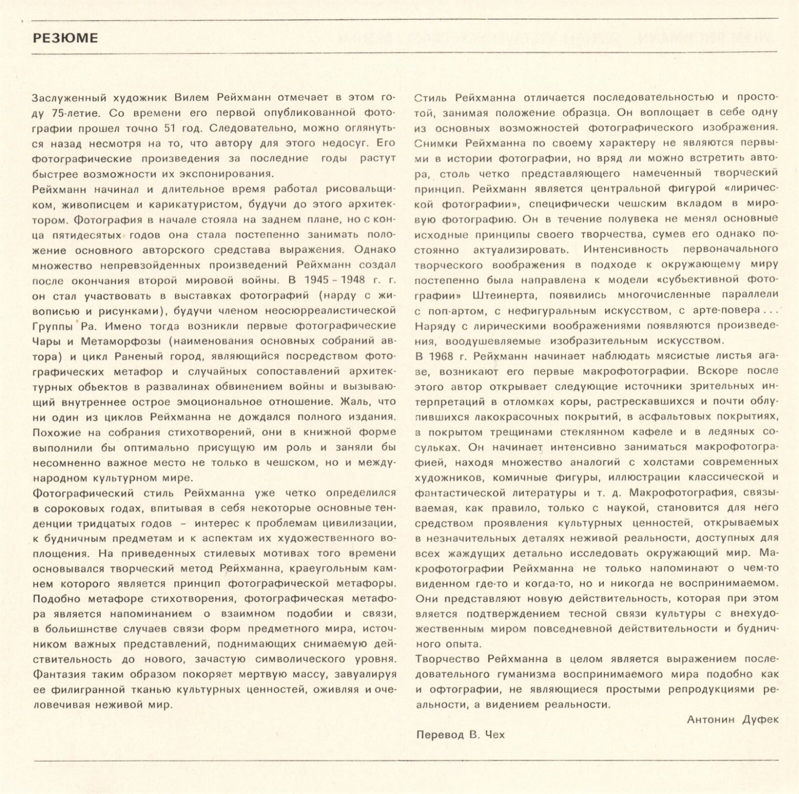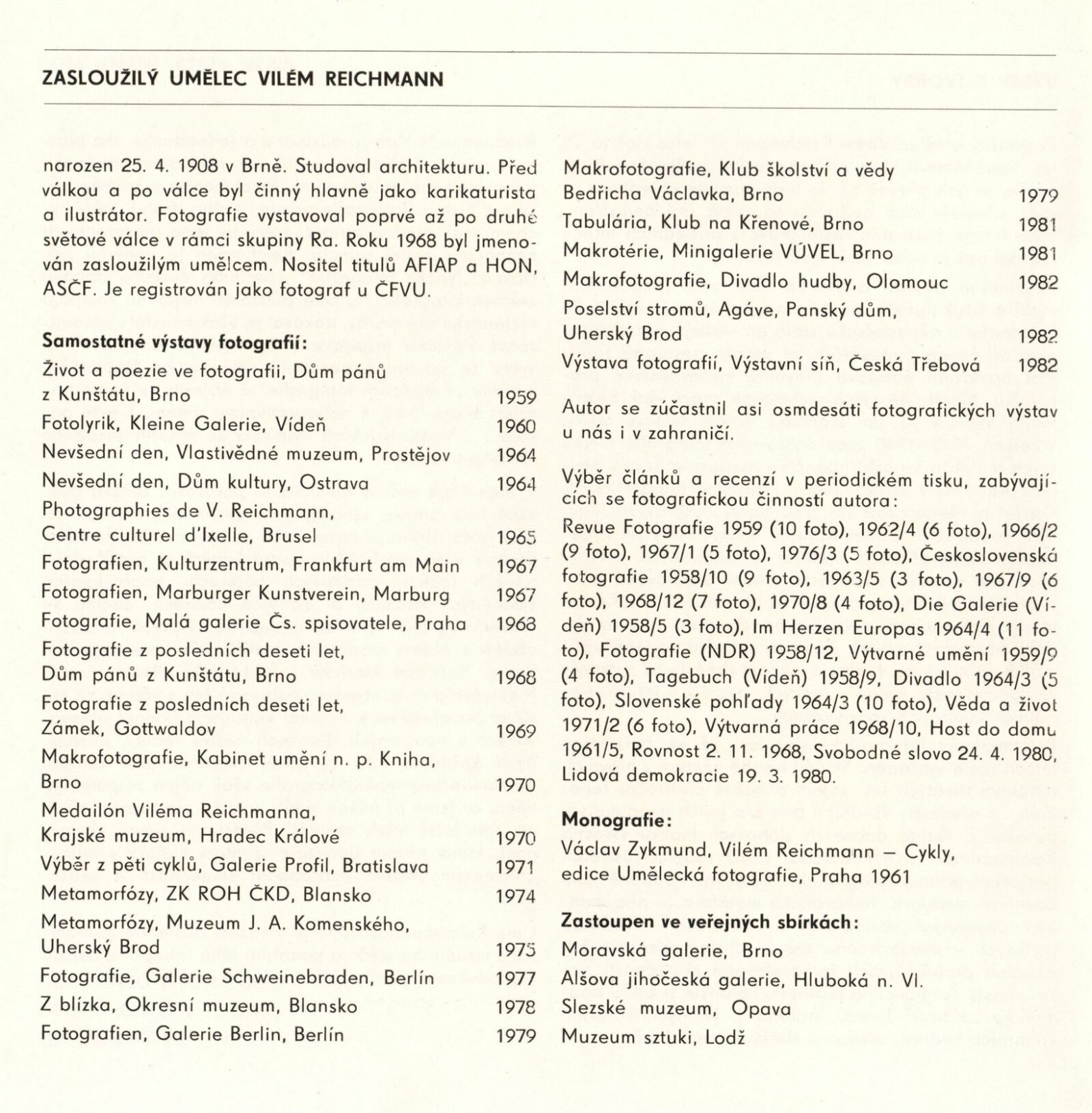 Vilém Reichmann. Fotografie. Výběr z tvorby: Dům umění / Dům pánů z Kunštátu, Kabinet fotografie Jaromíra Funka, 25. 1. – 20. 2. 1983 / Text: Antonín Dufek. – Brno: DUmB, 1983. – 20 s., obr., seznam vystavených prací, skládačka 6. s., životní data, výstavy, zastoupení ve sbírkách, DPK 792 – MZK; MG; MMB