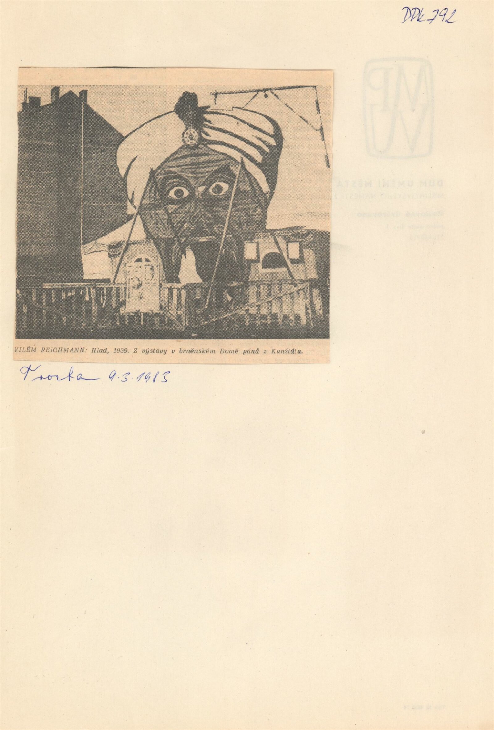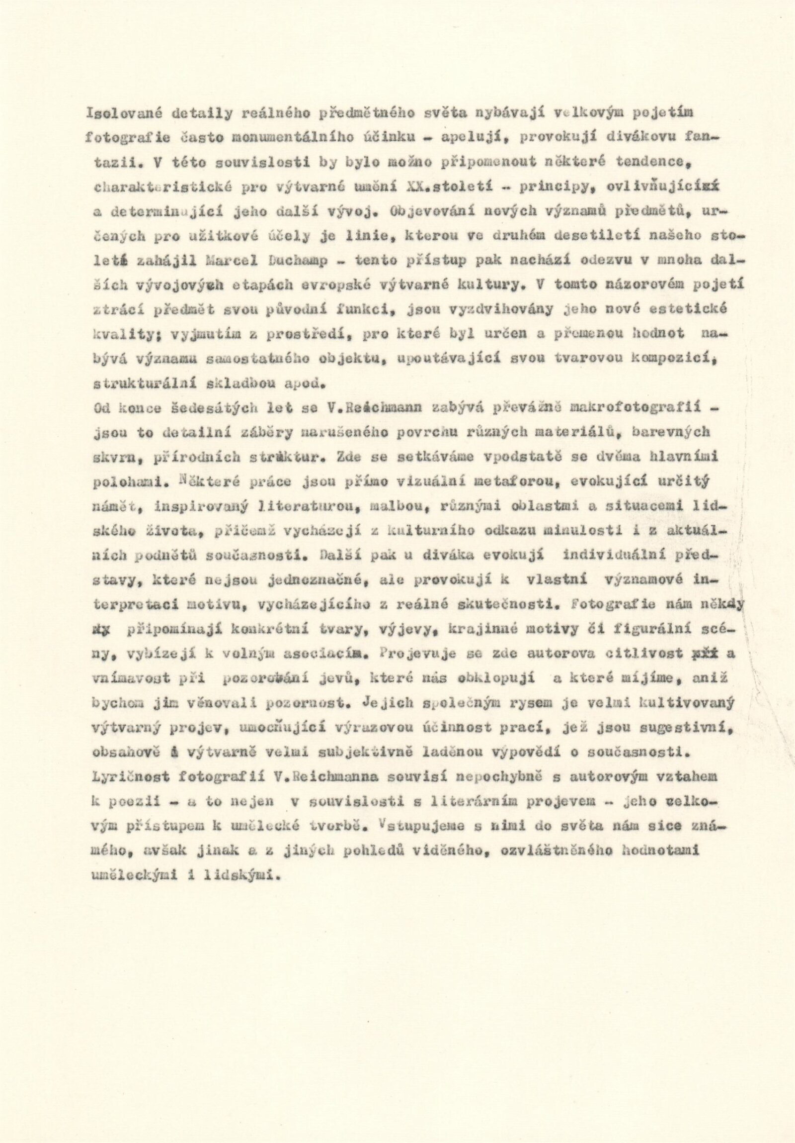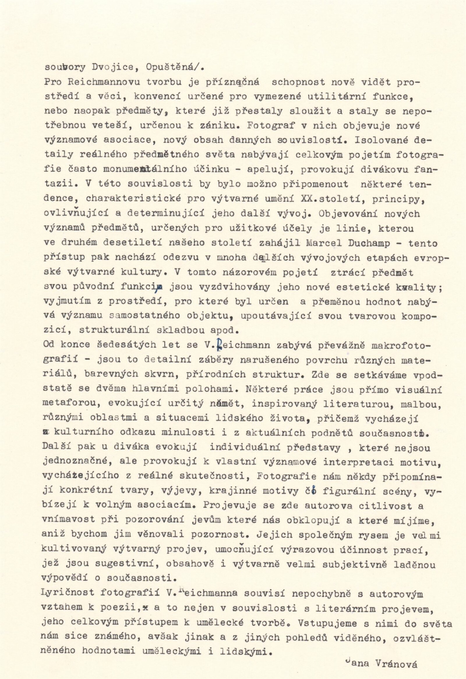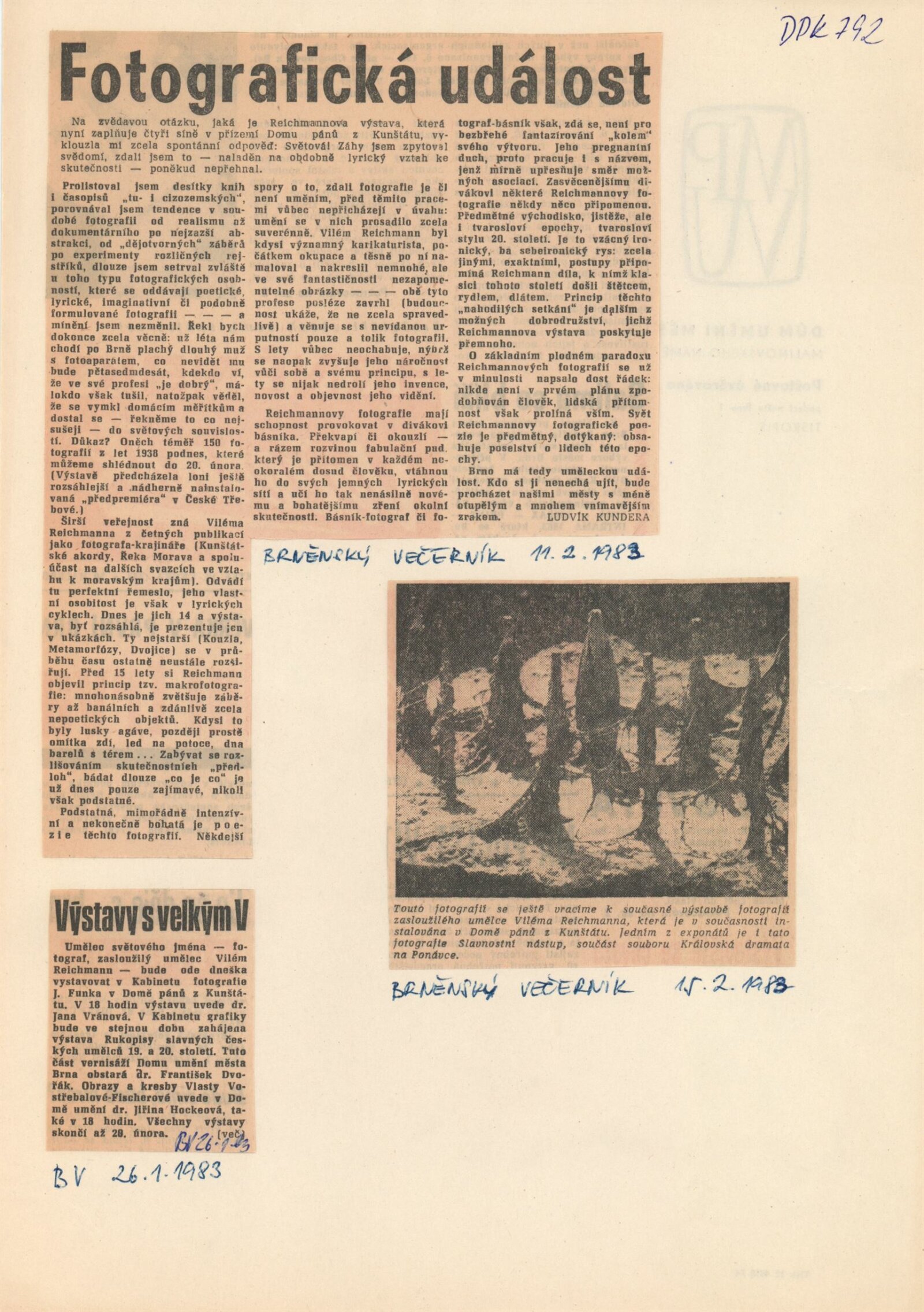 pozvánka, katalog, strojopis, fotografie k výstavě, provozní korespondence, žádost Viléma Reichmanna o výstavu v Kabinetu fotografie, text o výstavě (Jana Vránová), žádost o povolení výstavy, recenze v tisku, katalog z předešlé výstavy v Blansku (1978)