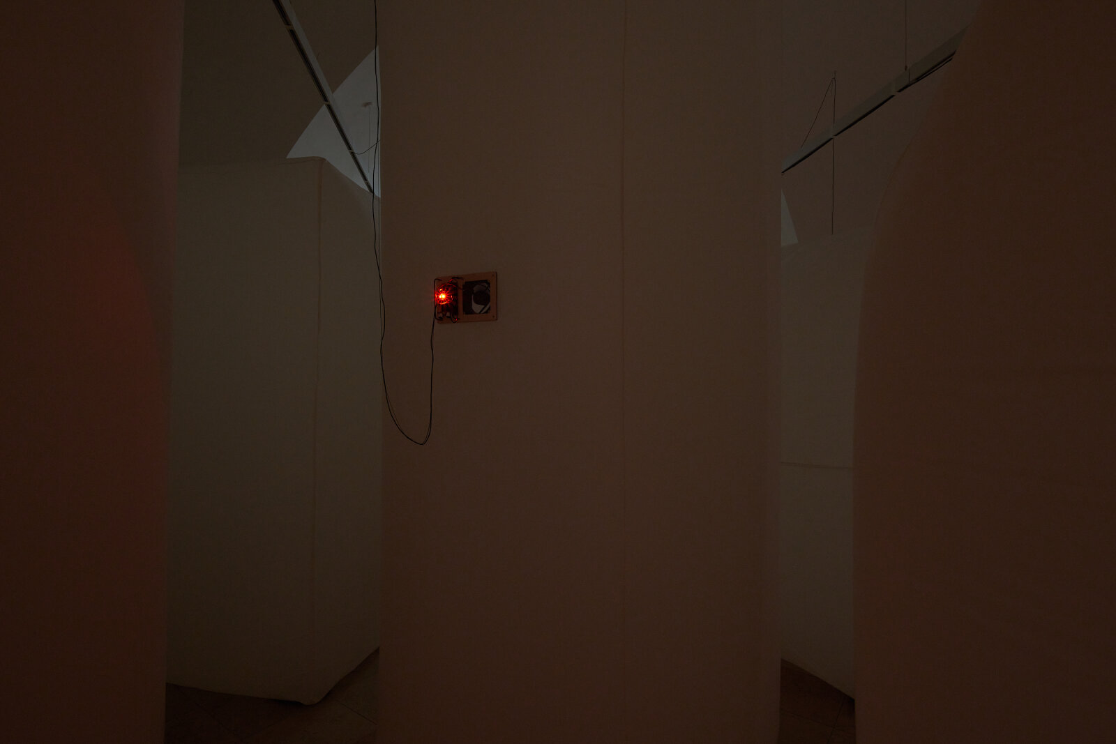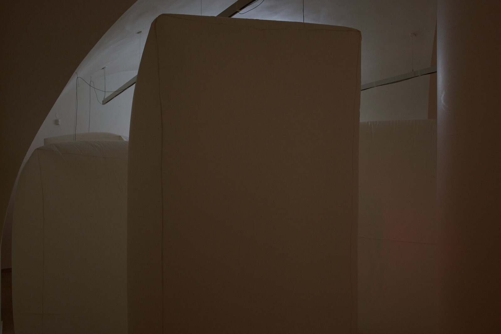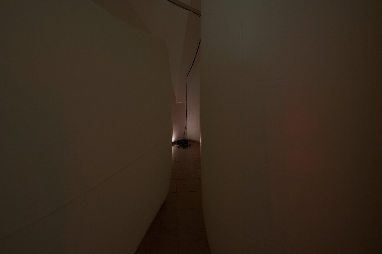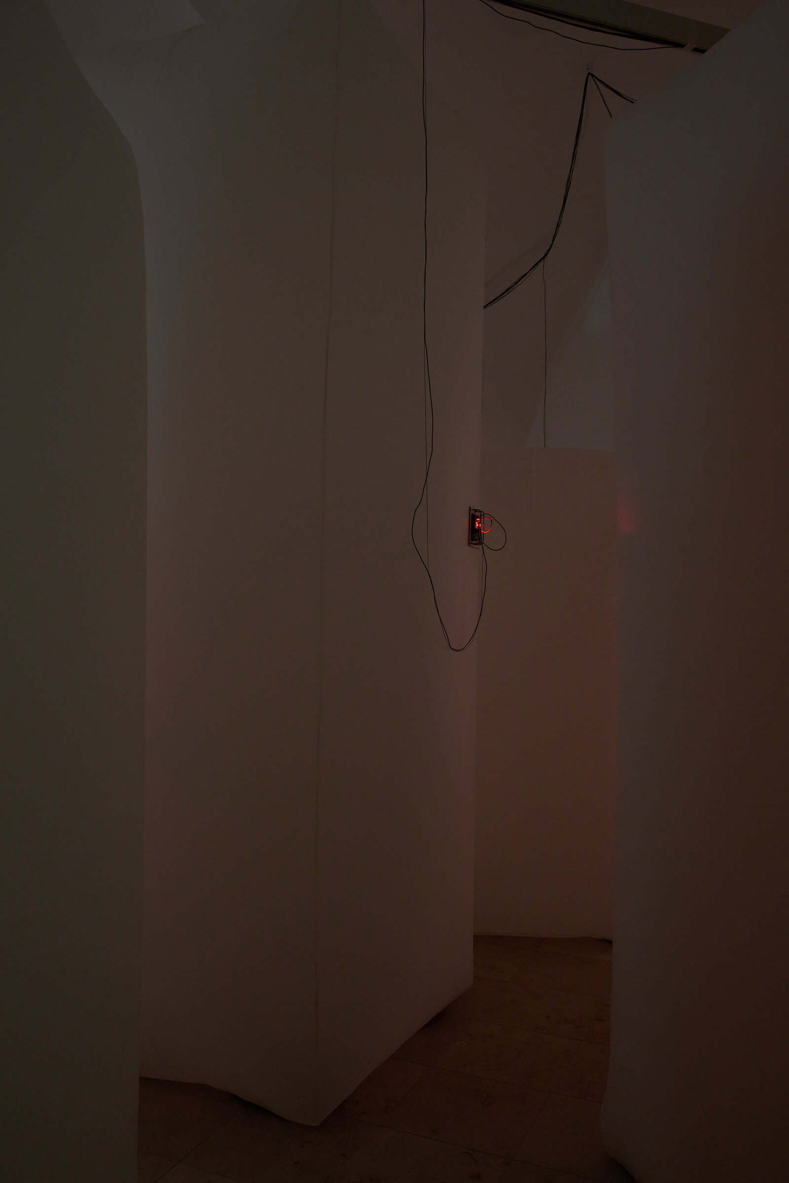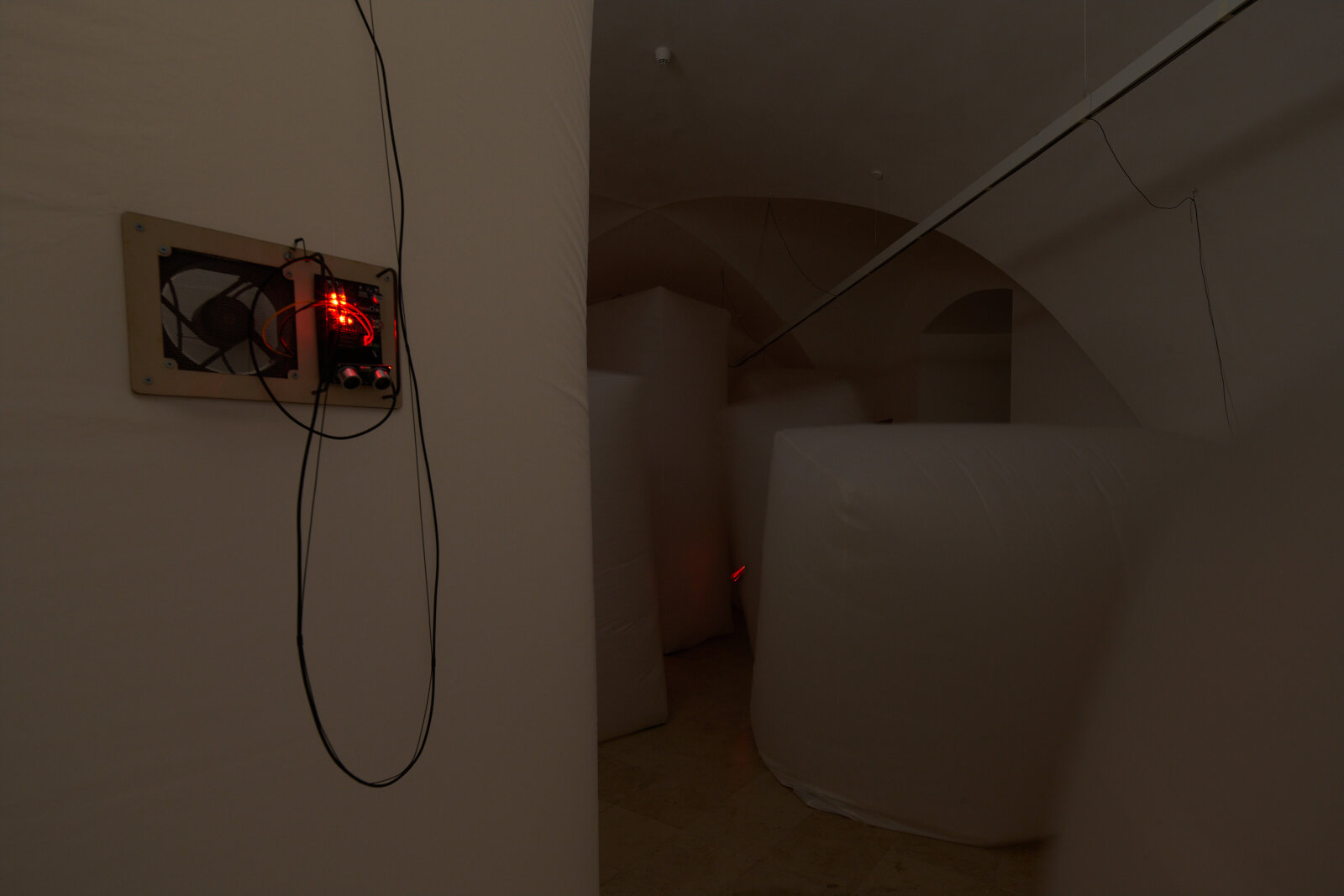 Stěny a sloupy labyrintu těžce oddechují. Jejich sonické uši sledují naše pohyby, jejich blikající oči naslouchají našim krokům. Někde mezi orientací a pozorováním se spojují, obsahují a uchovávají nekonečná těla a intimní informace. Jako přeludy nám blokují cestu, než se rozplynou, a představují si budoucnost tím, že skrývají minulost.
