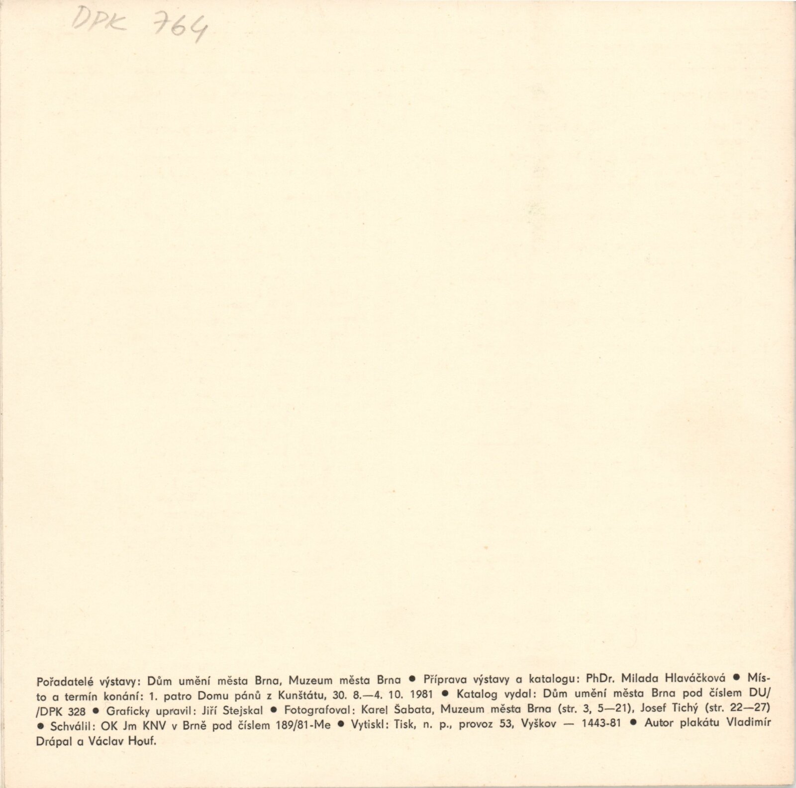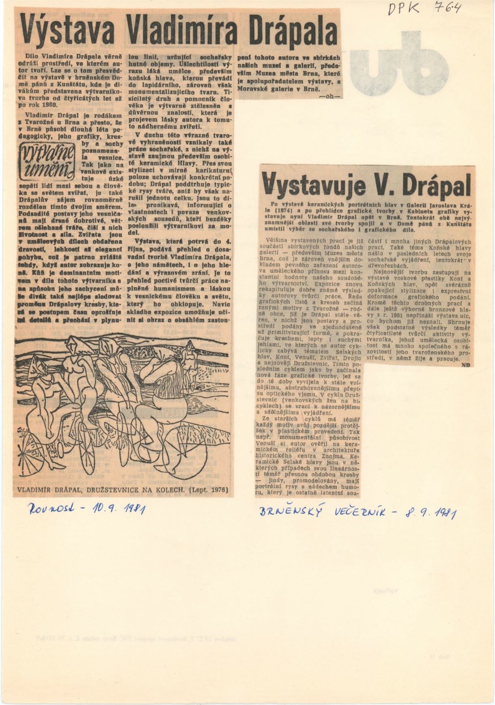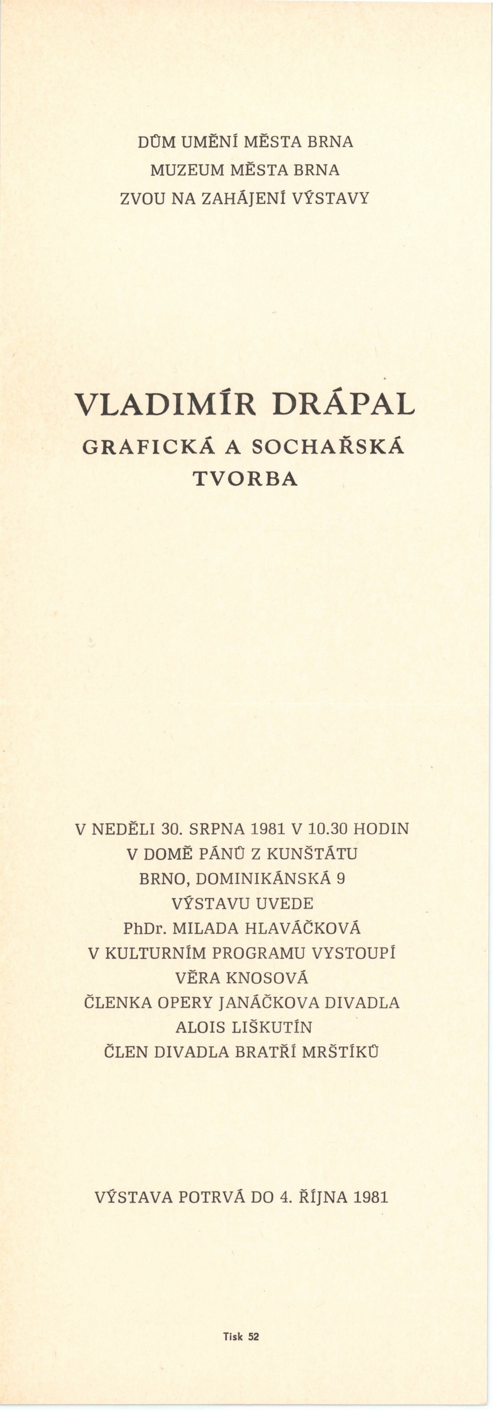 Vladimír Drápal. Grafická a sochařská tvorba: Dům umění / Dům pánů z Kunštátu, 1. patro, 30. 8. – 4. 10. 1981 / Text: Milada Hlaváčková. – Brno: DUmB, 1980. – 29 s., obr., DPK 764. – MZK; MG