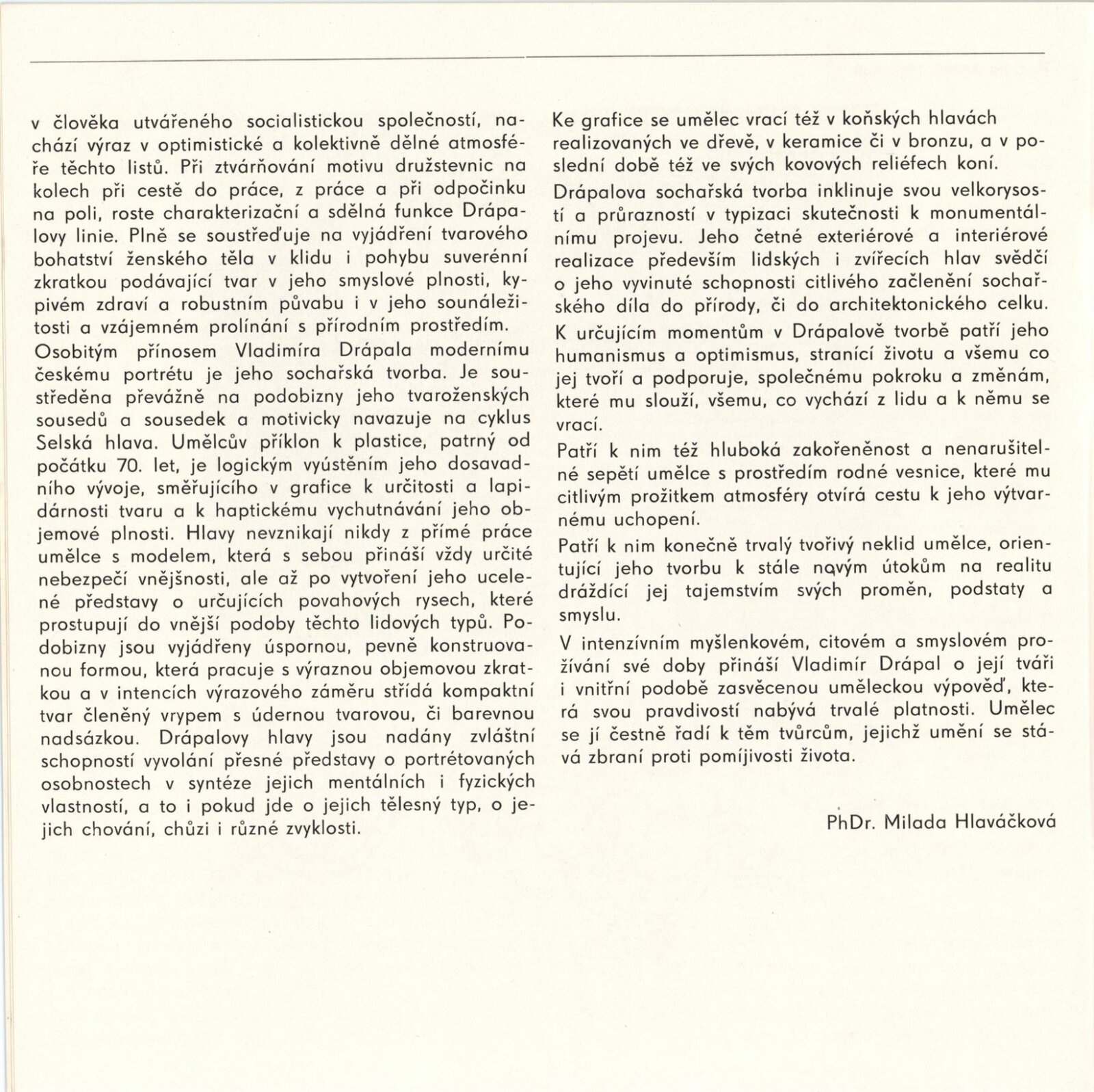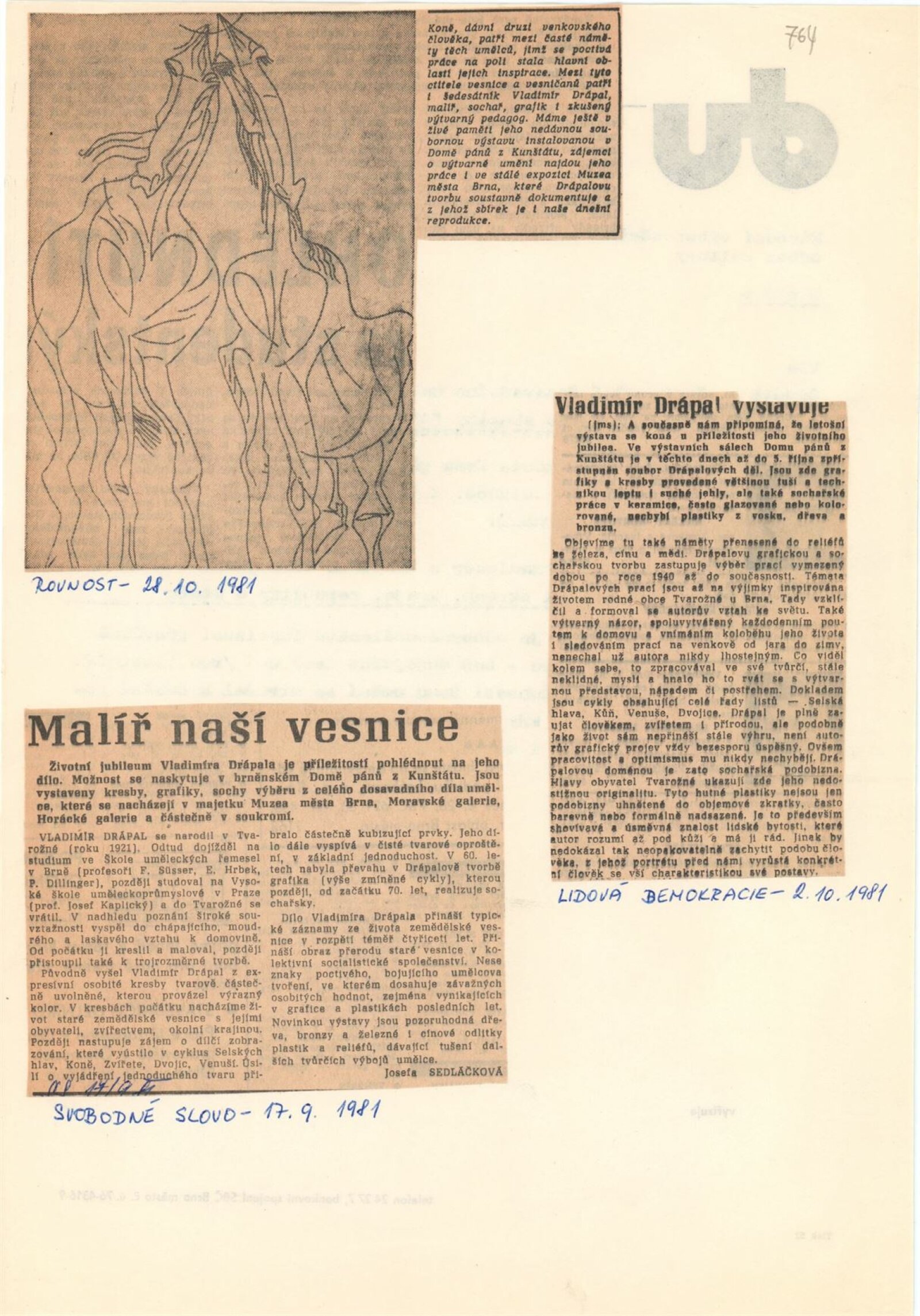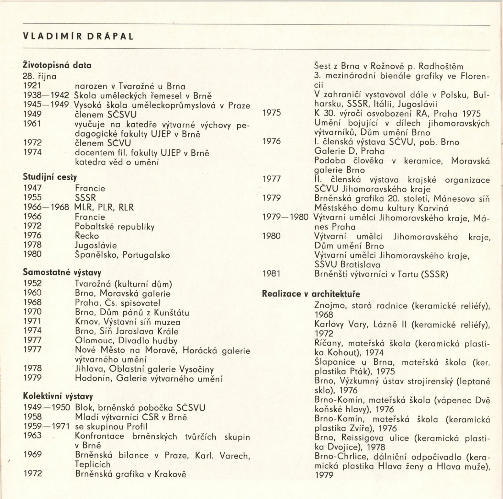 Vladimír Drápal. Grafická a sochařská tvorba: Dům umění / Dům pánů z Kunštátu, 1. patro, 30. 8. – 4. 10. 1981 / Text: Milada Hlaváčková. – Brno: DUmB, 1980. – 29 s., obr., DPK 764. – MZK; MG