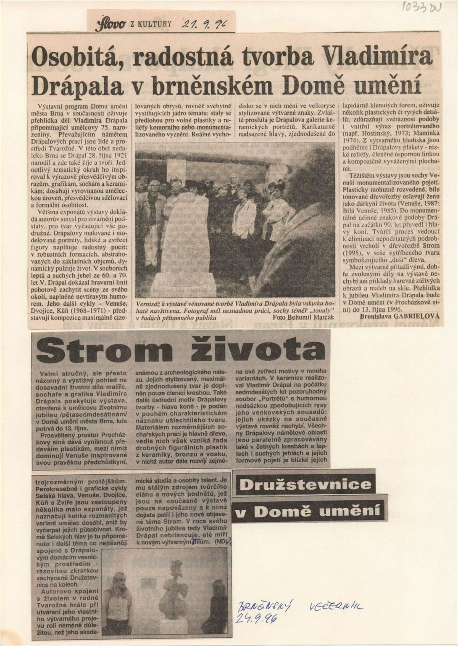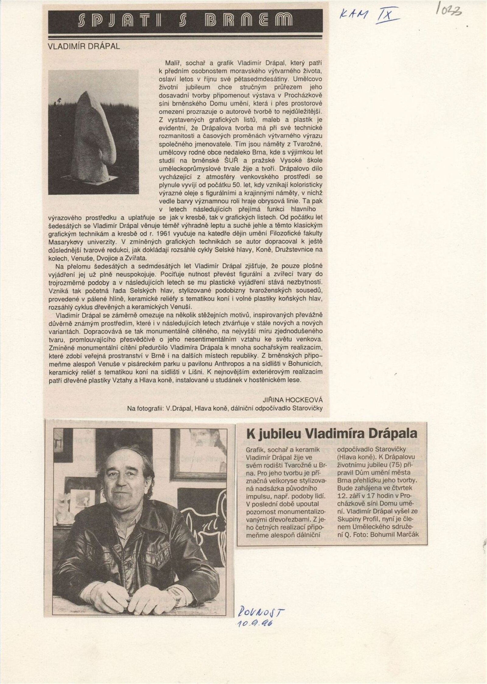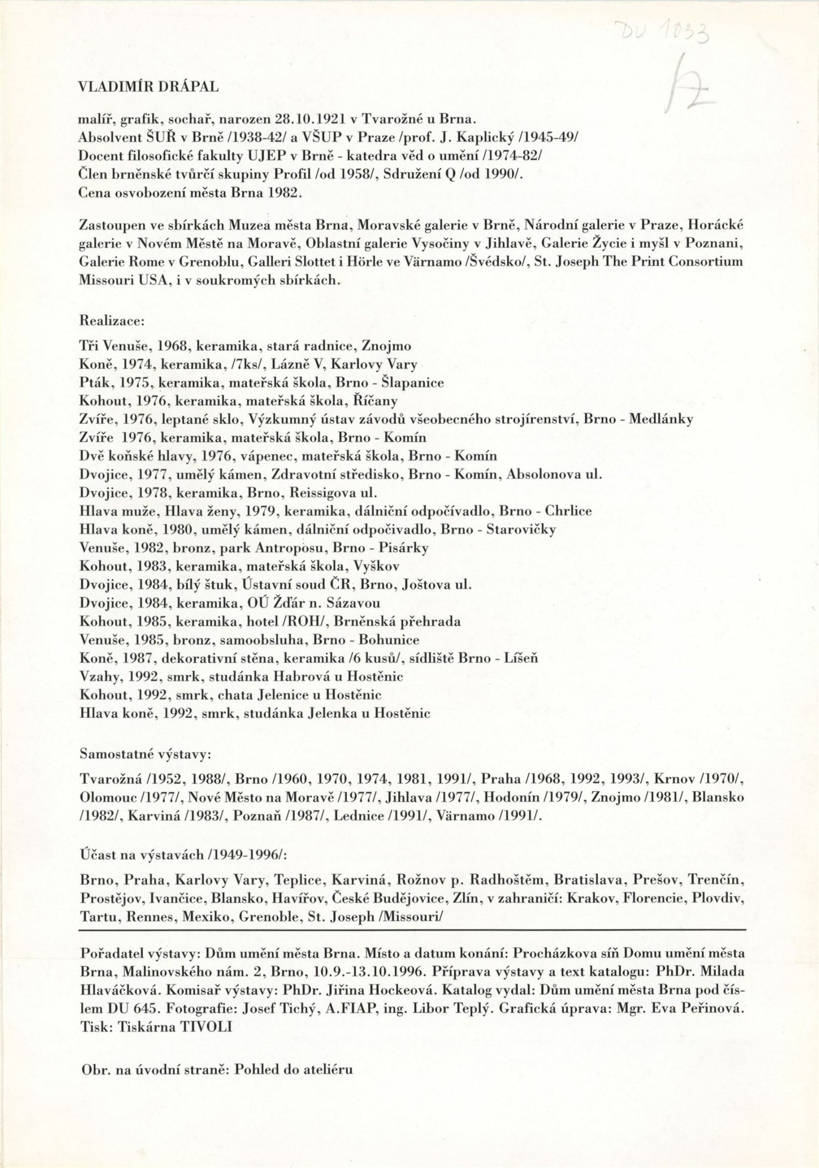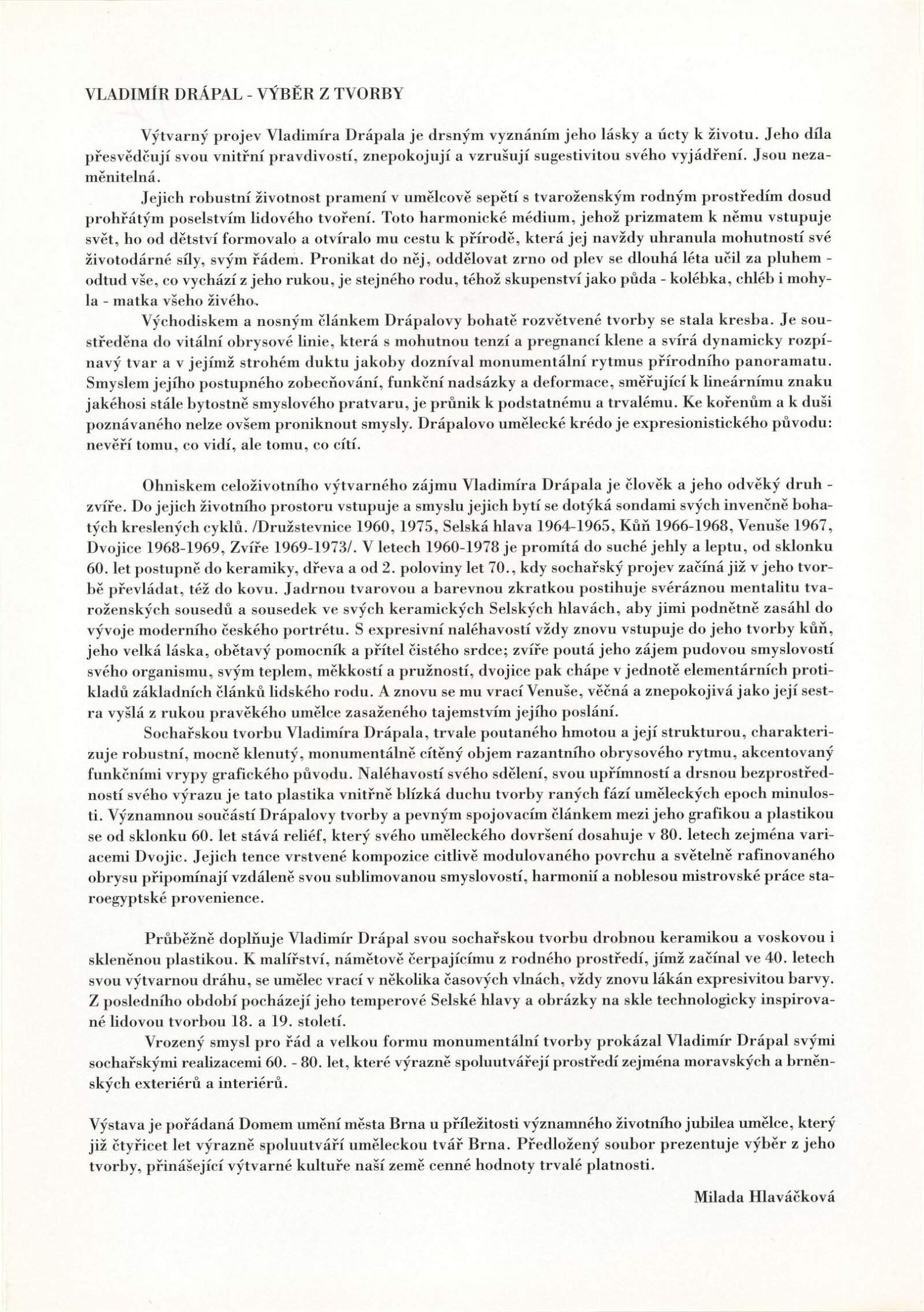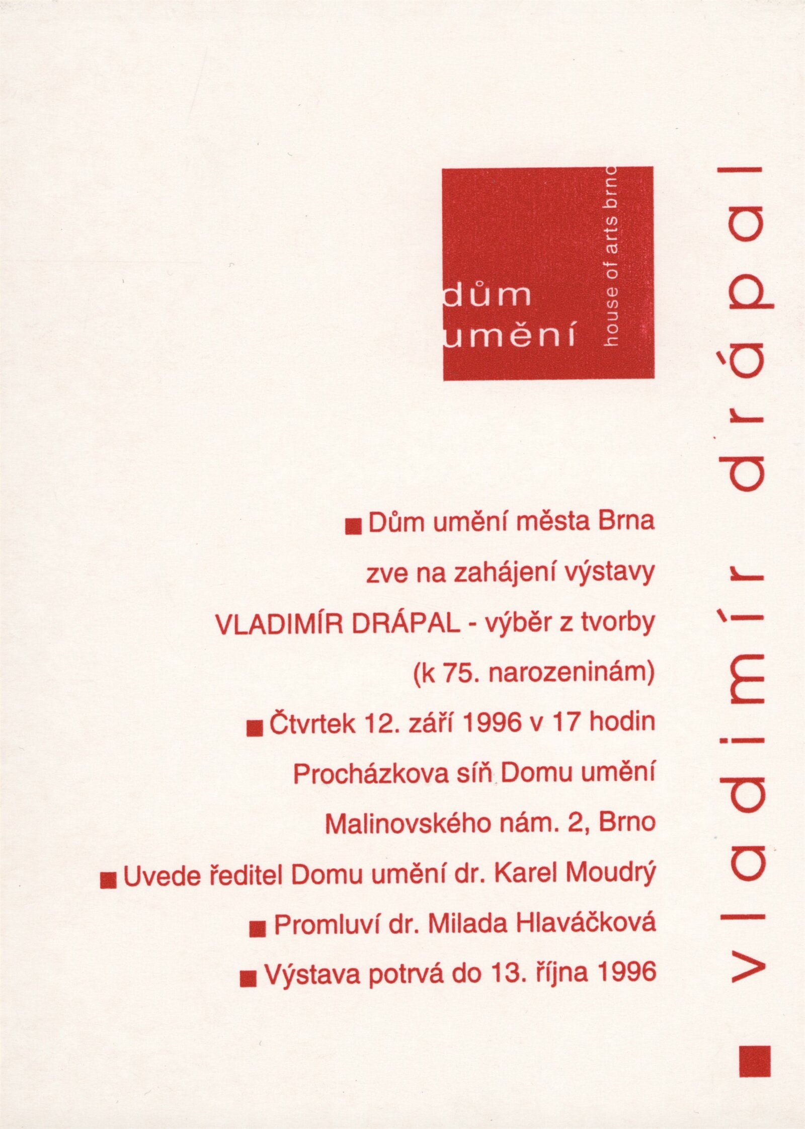 Vladimír Drápal. Výběr z tvorby (k 75. nározeninám): Dům umění města Brna, Procházkova síň, 10. 9. – 13. 10. 1996 / Text: Milada Hlaváčková. – Brno: DUmB, 1996. – skládačka (6 s., obr.), životní data, výstavy, realizace, DU 1033. – MZK; MG