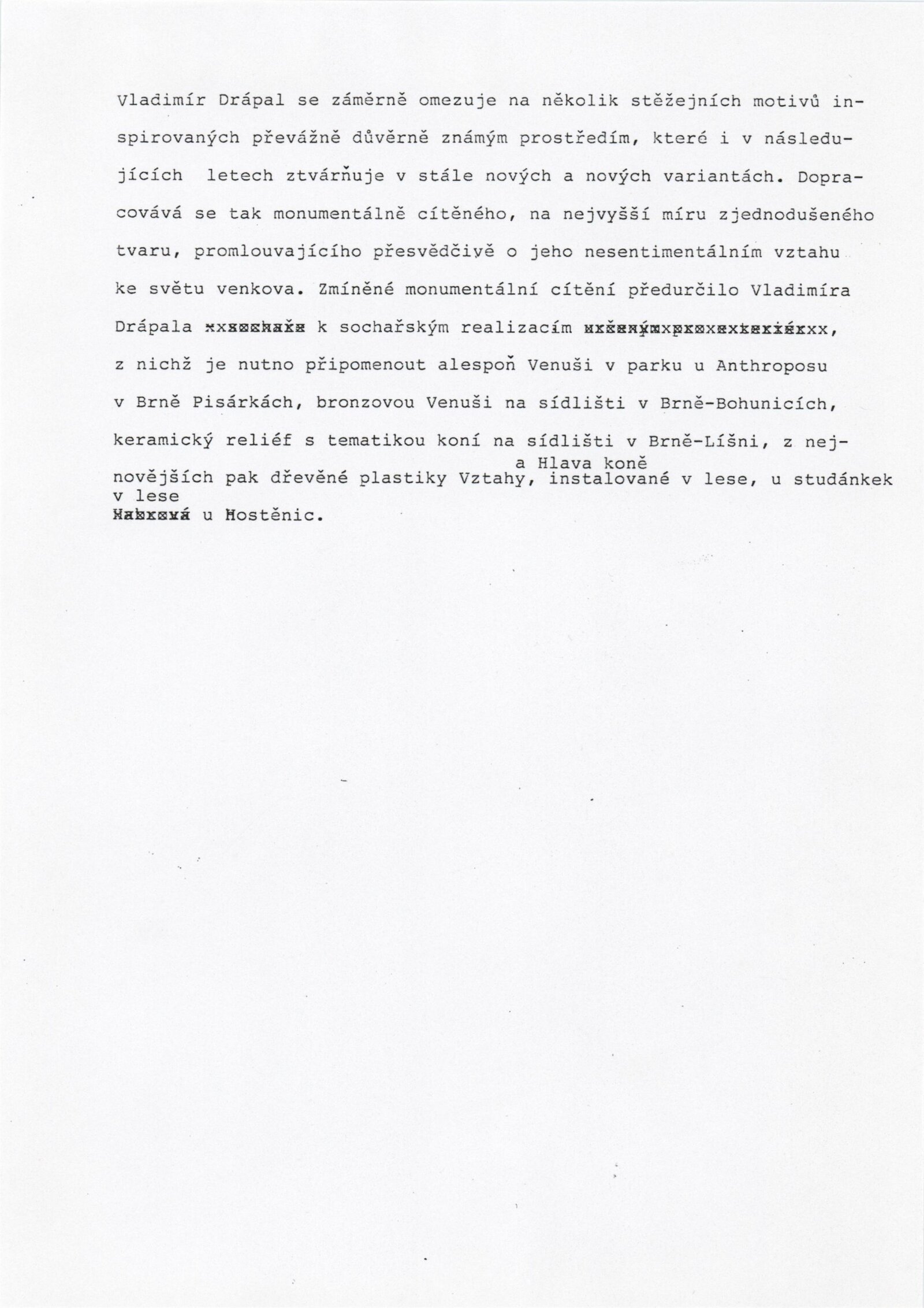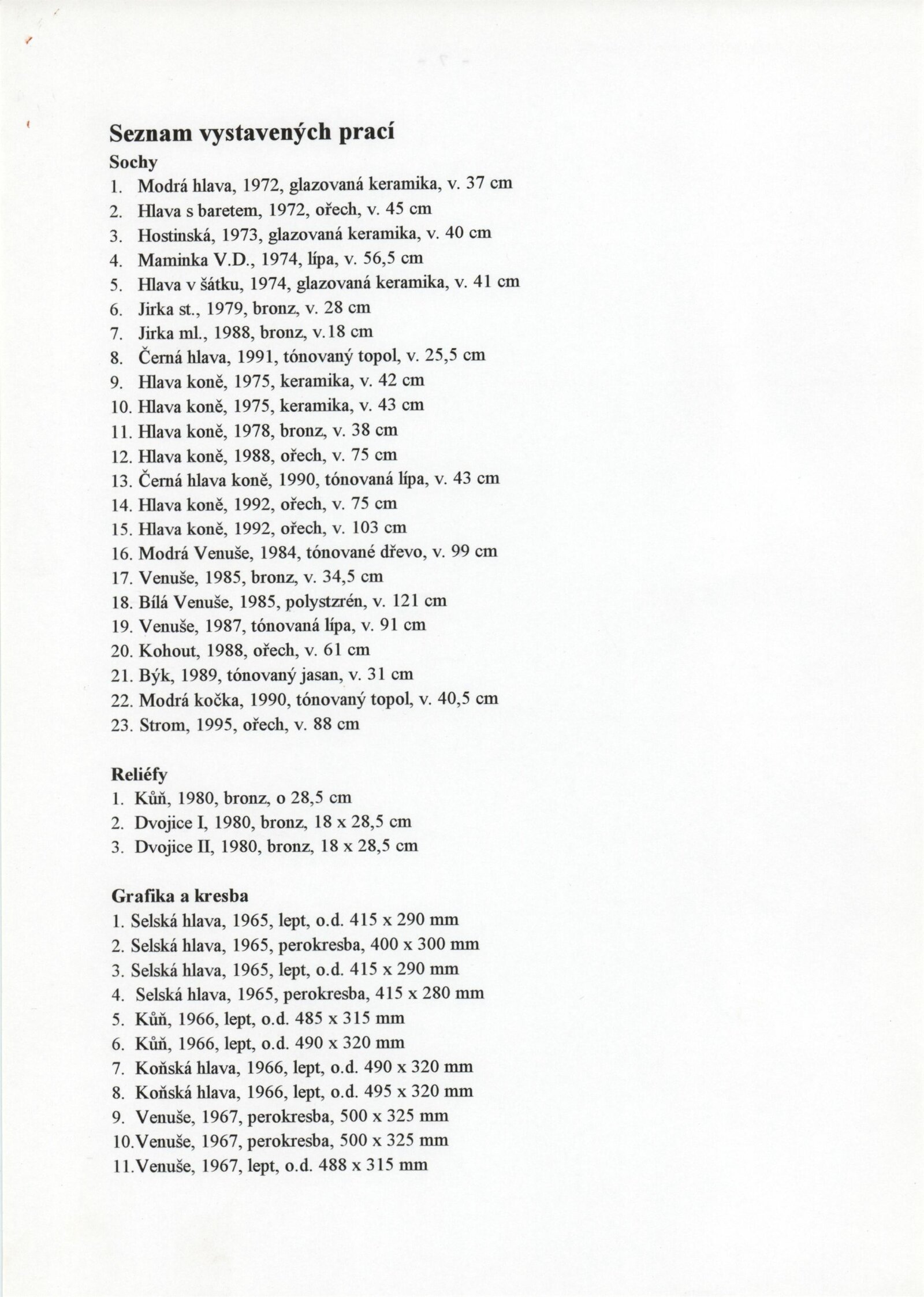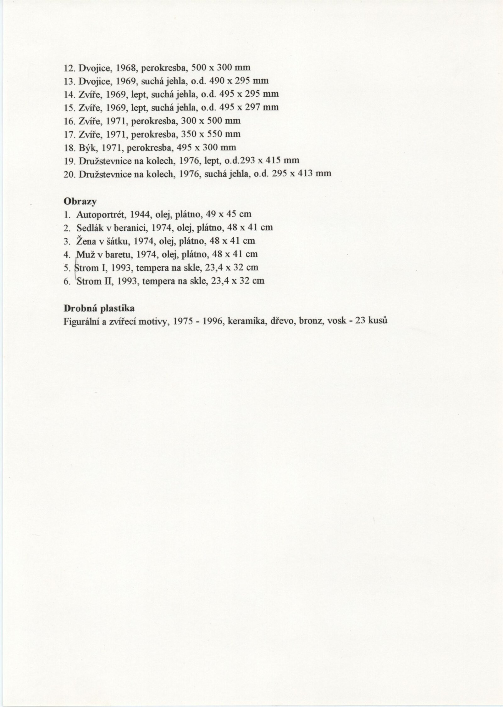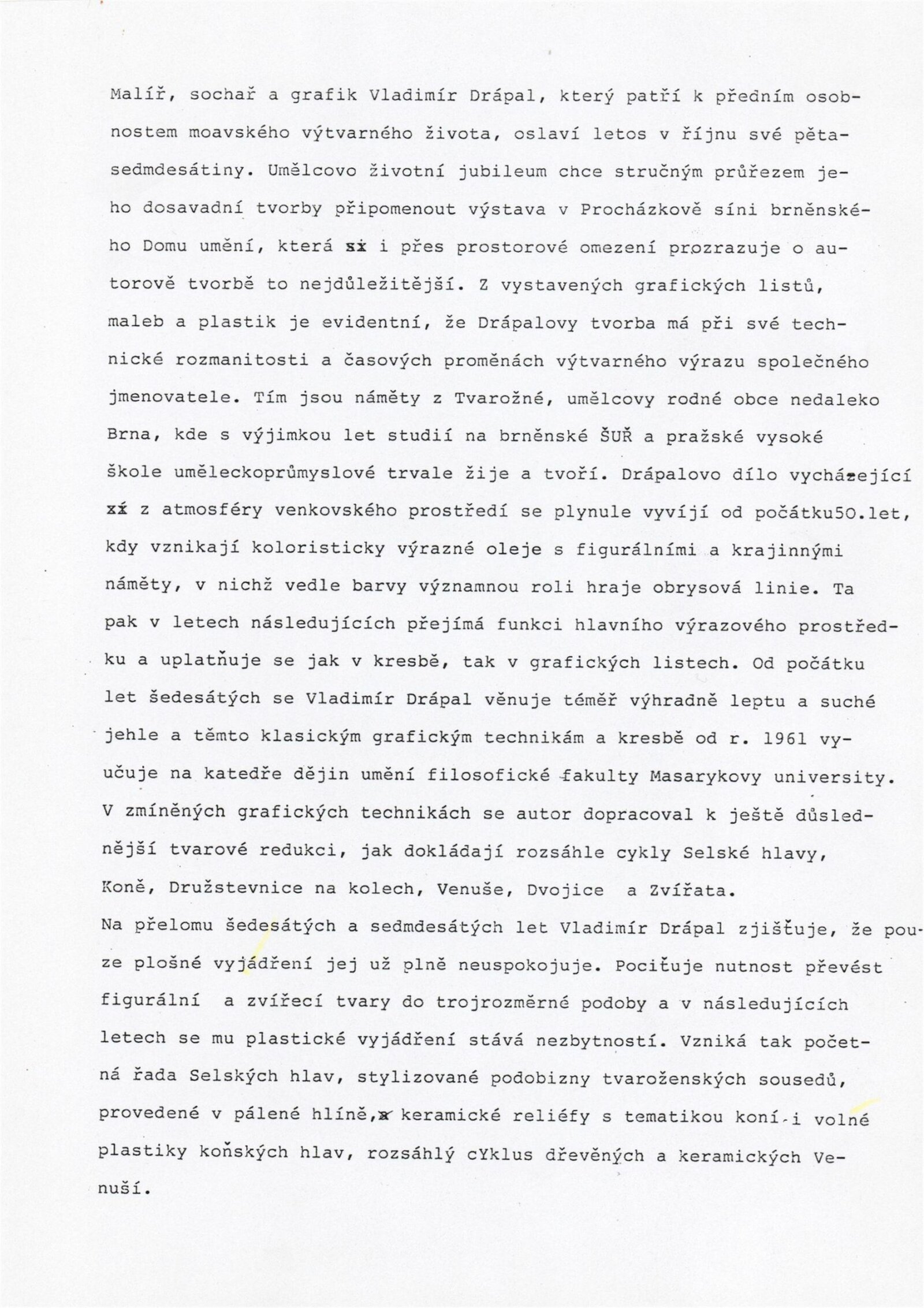 pozvánka, katalog, podklady pro katalog, seznam vystavených děl, text o autorovi, pojistný seznam, žádost o výstavu, recenze v tisku, katalog (V. Drápal, GSR 1991)
