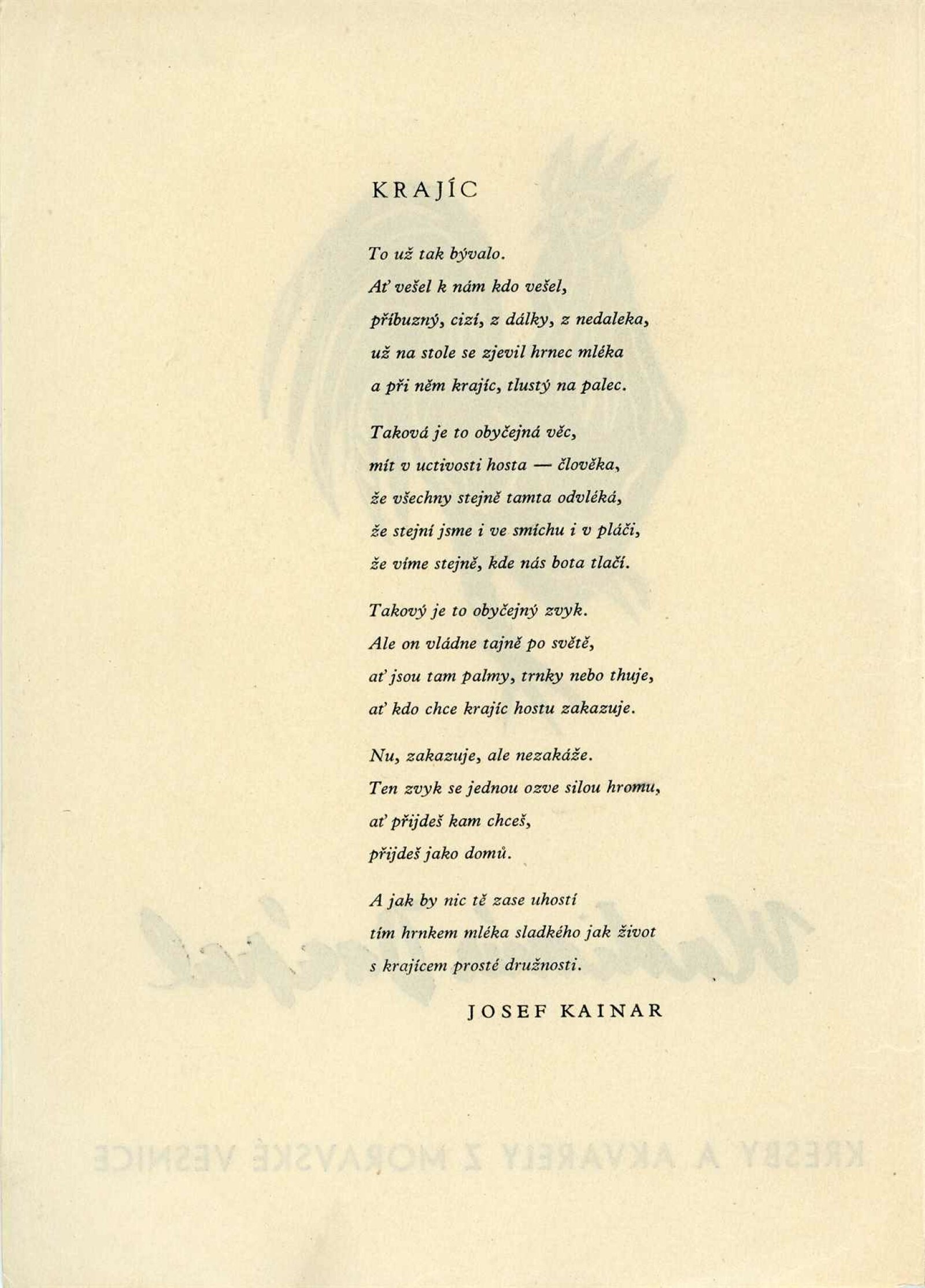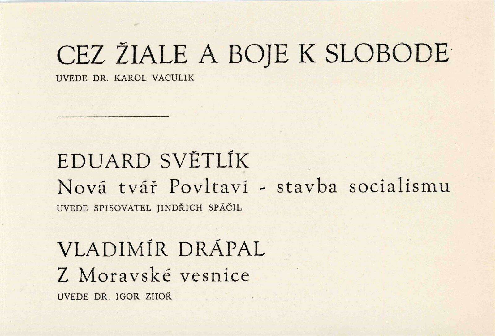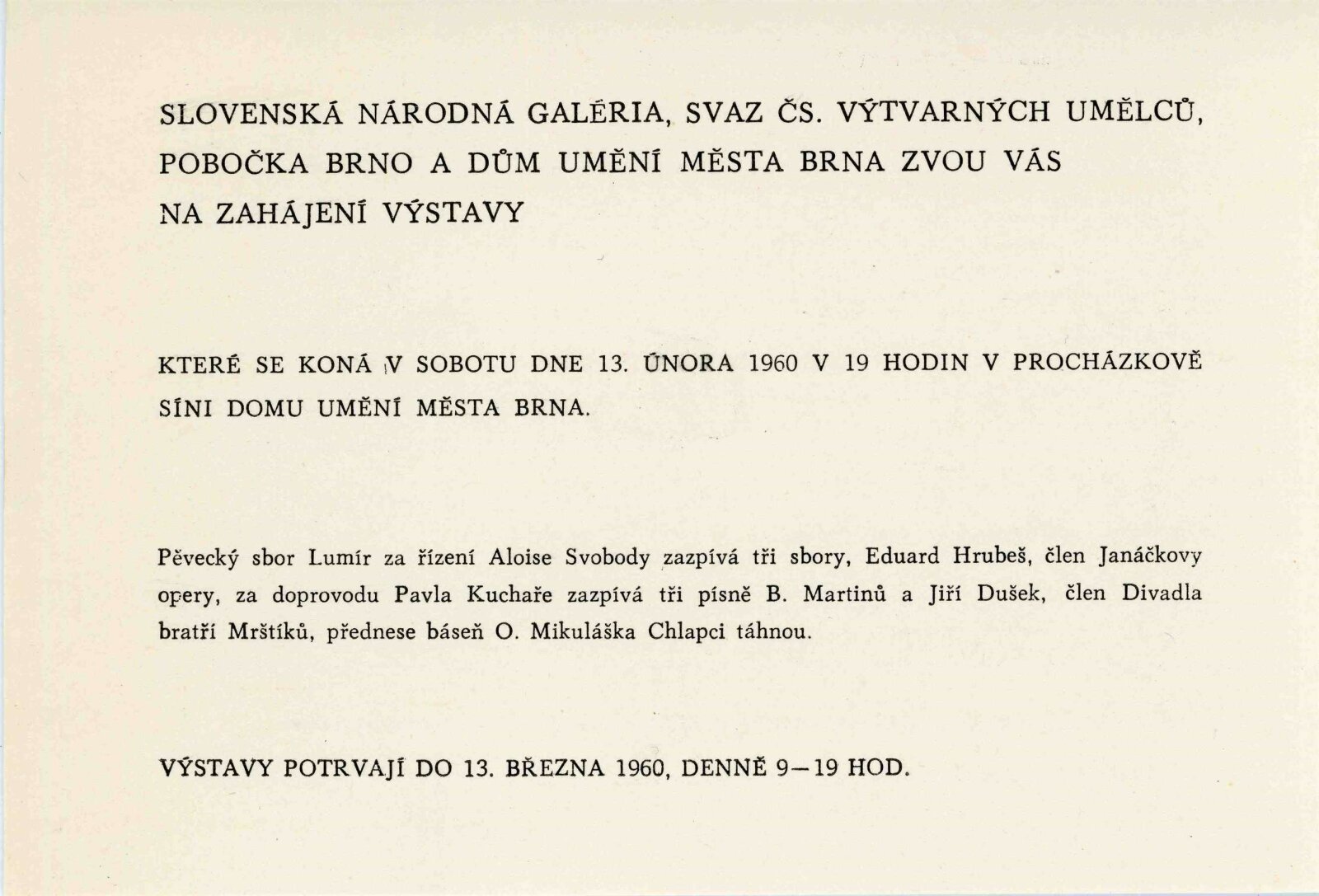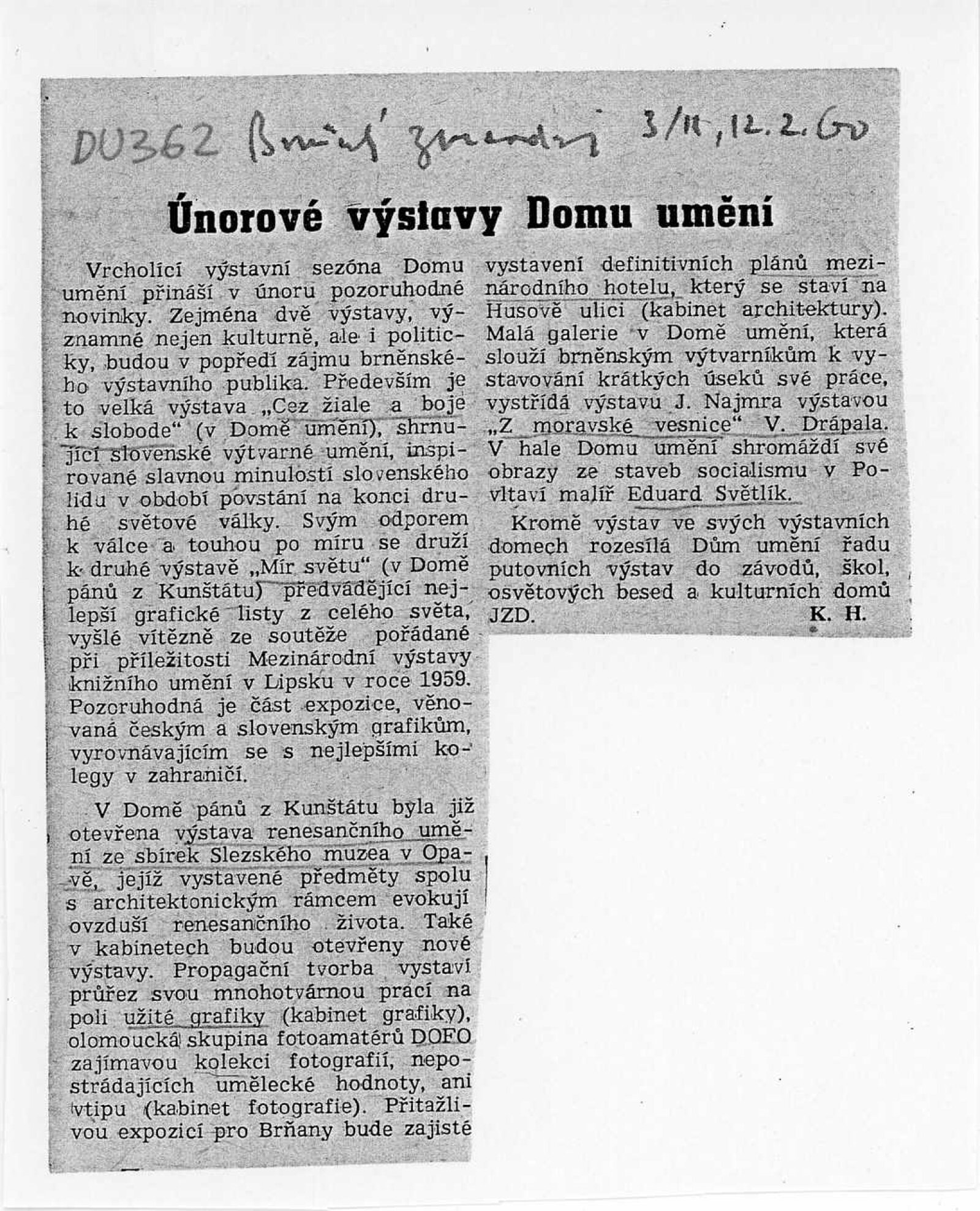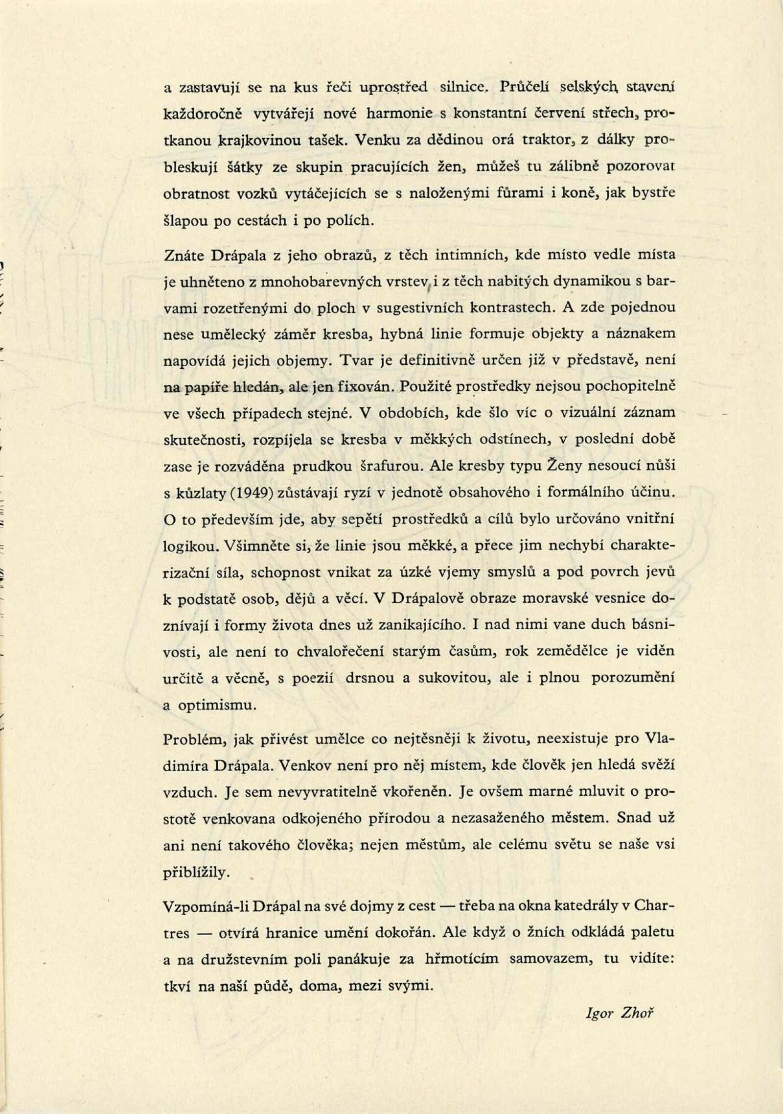 Vladimír Drápal. Kresba a akvarely z moravské vesnice: Dům umění, Malá galerie, 13. 2. – 6. 3. 1960 / Text: Igor Zhoř. – Brno: DUmB, 1960. – skládačka, 6 s., obr., báseň Josefa Kainara, DU 362. – MZK; MG; MMB