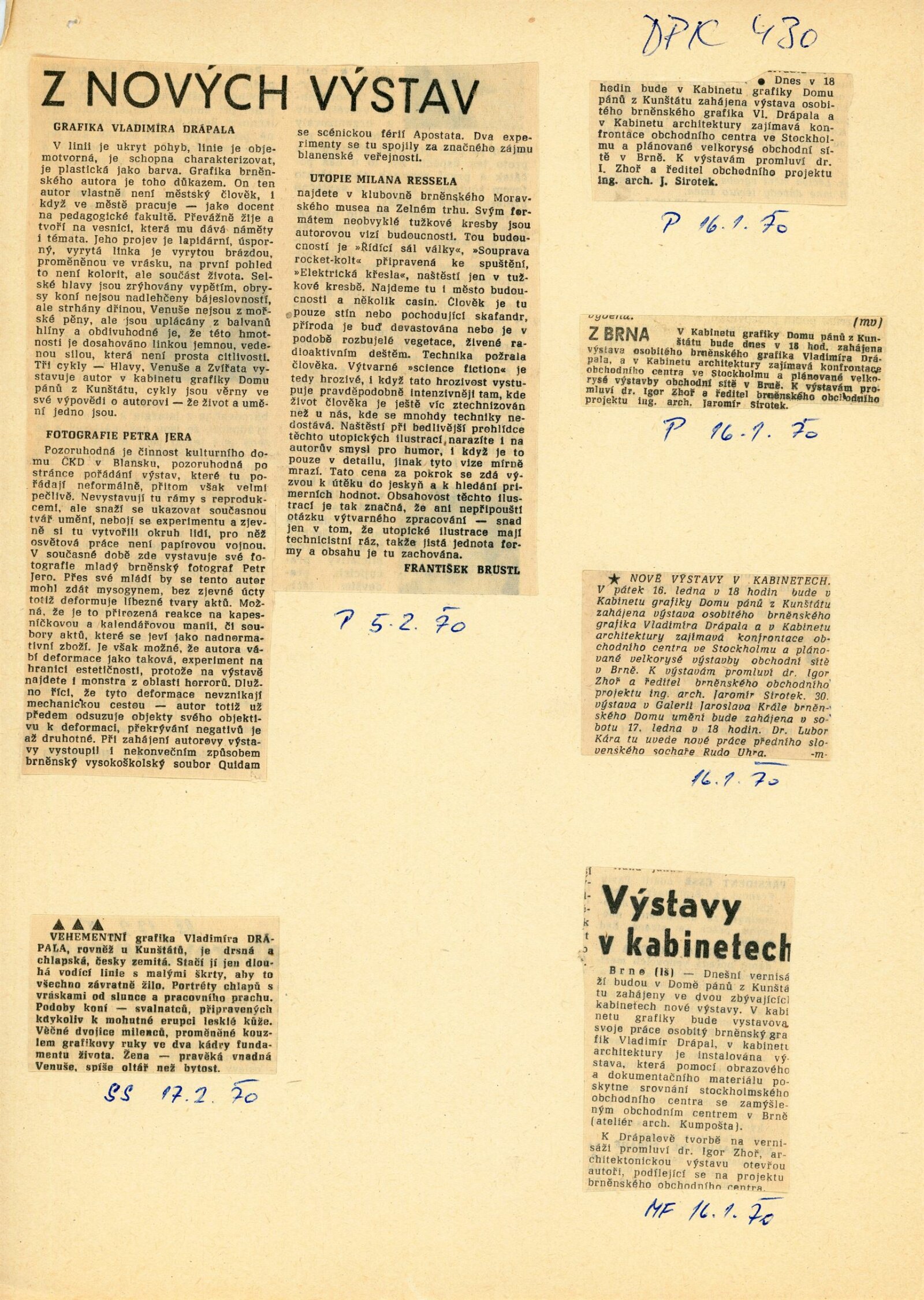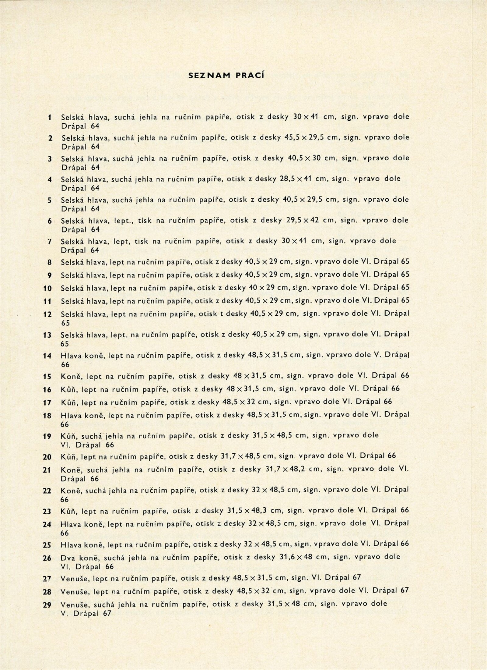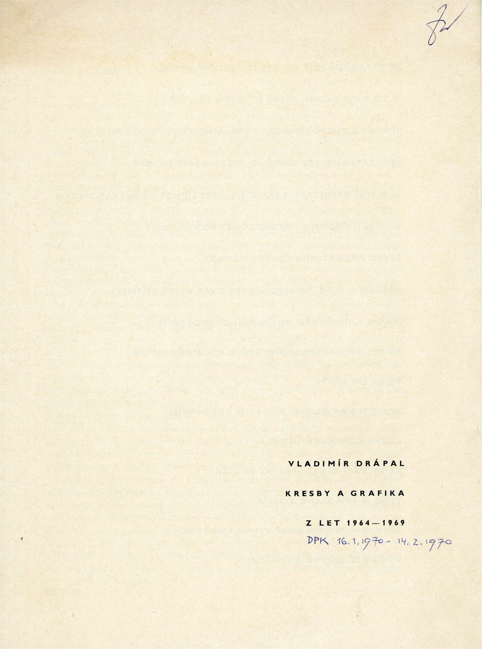 Vladimír Drápal. Kresby a grafika z let 1964–1969: Dům umění města Brna / Dům pánů z Kunštátu, Kabinet grafiky, 11. 1. – 22. 2. 1970 / Texty: Igor Zhoř a autor. – Brno: DUmB, 1970. – 13 s., životní data, DPK 430. – MZK; MG; MMB