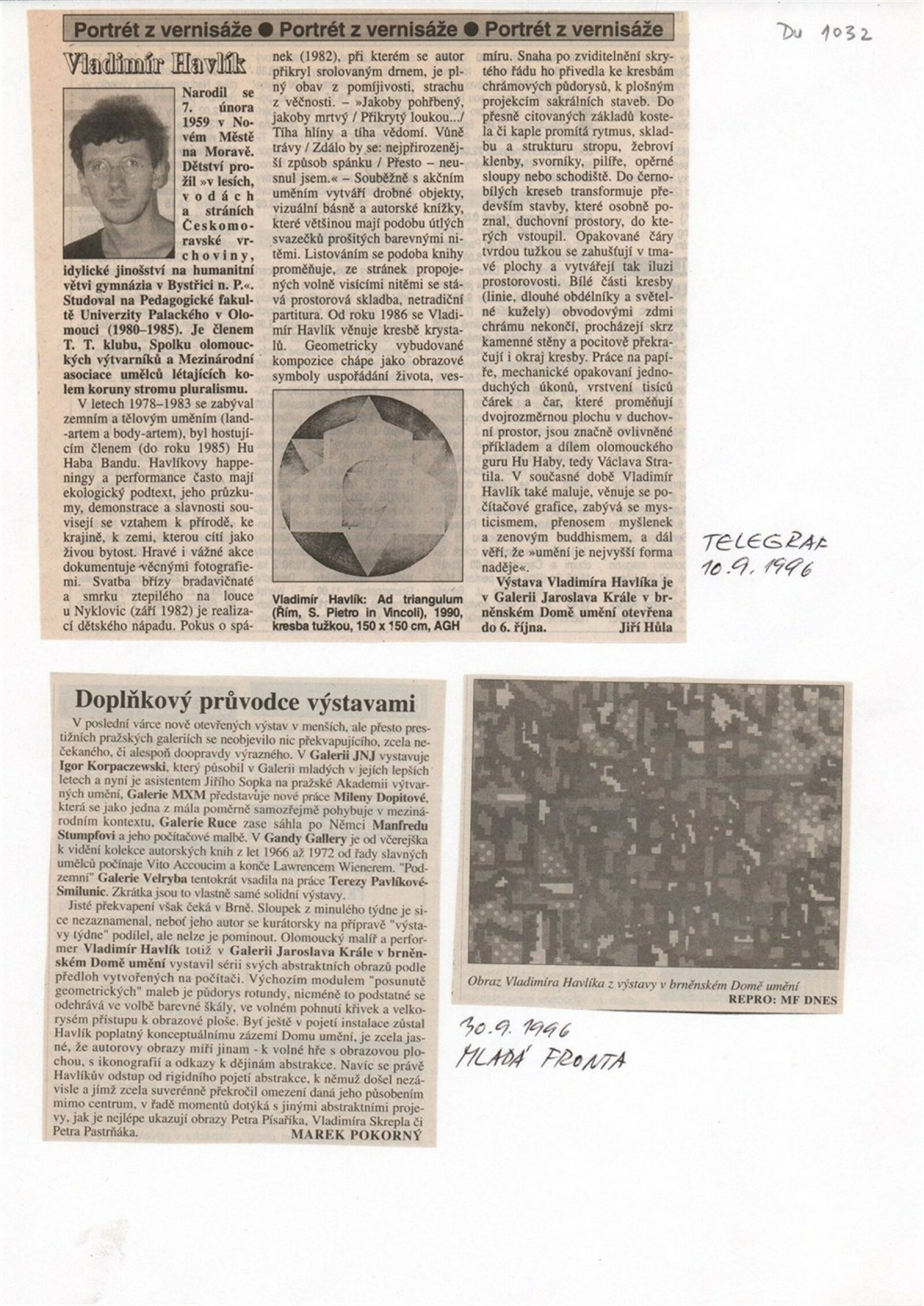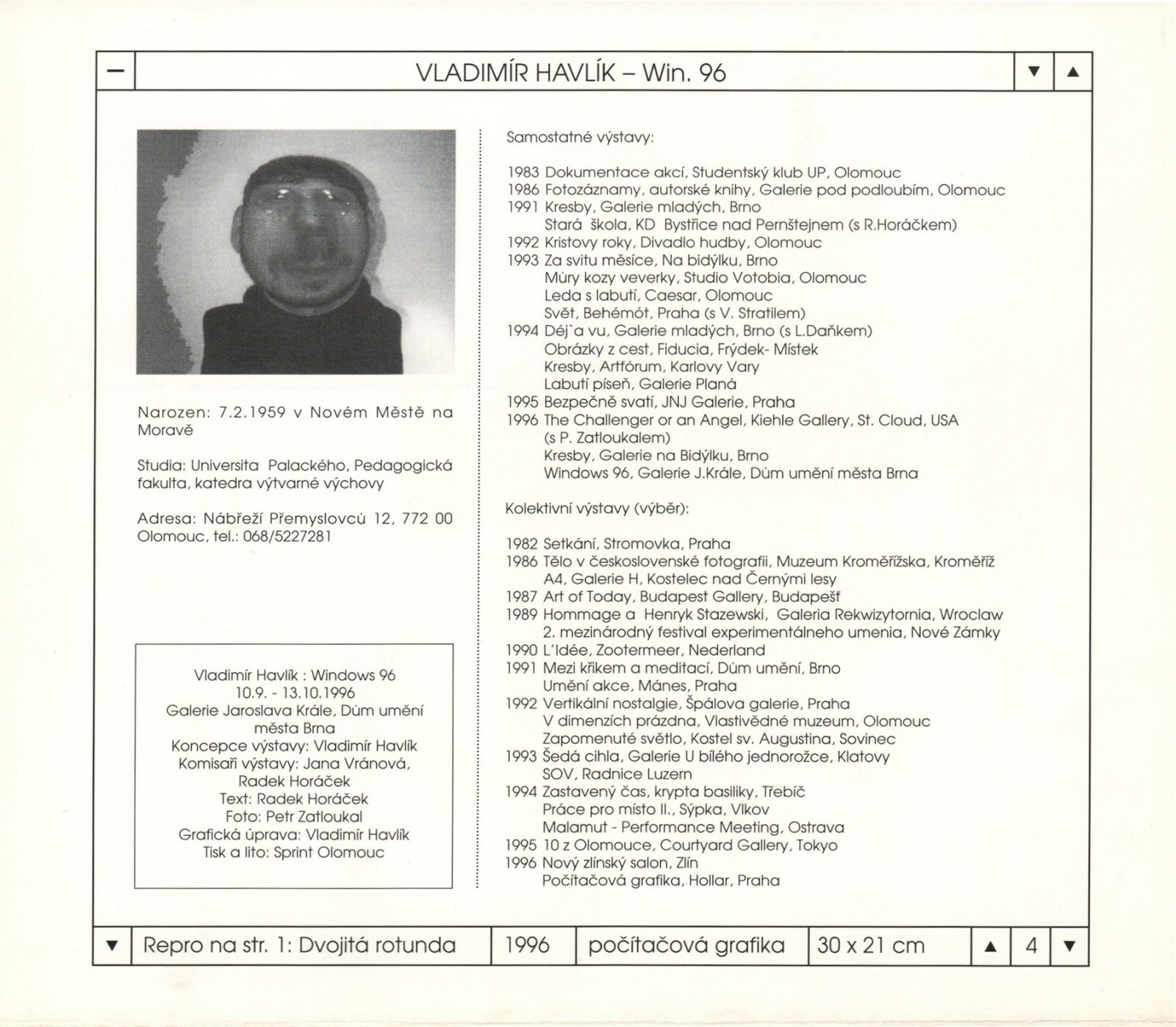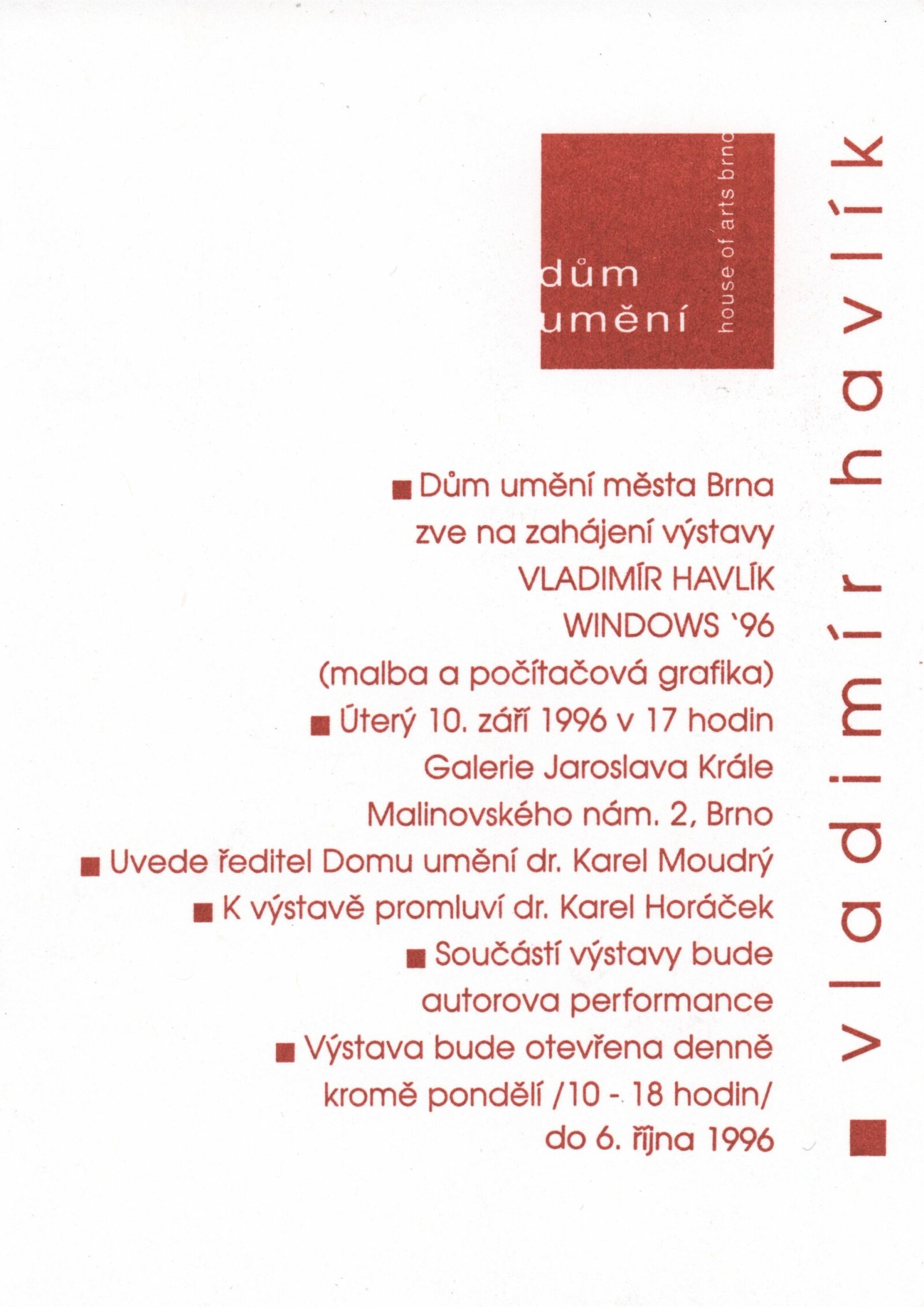 Vladimír Havlík. Windows 96: Dům umění města Brna, Galerie Jaroslava Krále, 10. 9. – 13. 10. 1996 / Tex: Radek Horáček. – Brno: DUmB, 1996. – 4 s., obr., životní data, výstavy, DU 1032