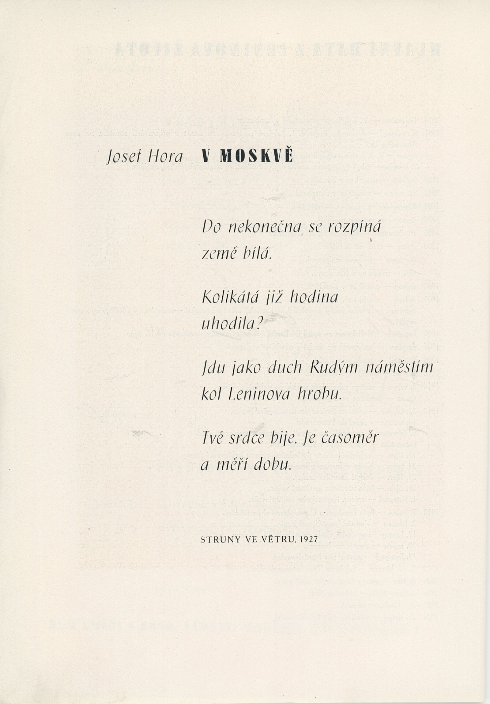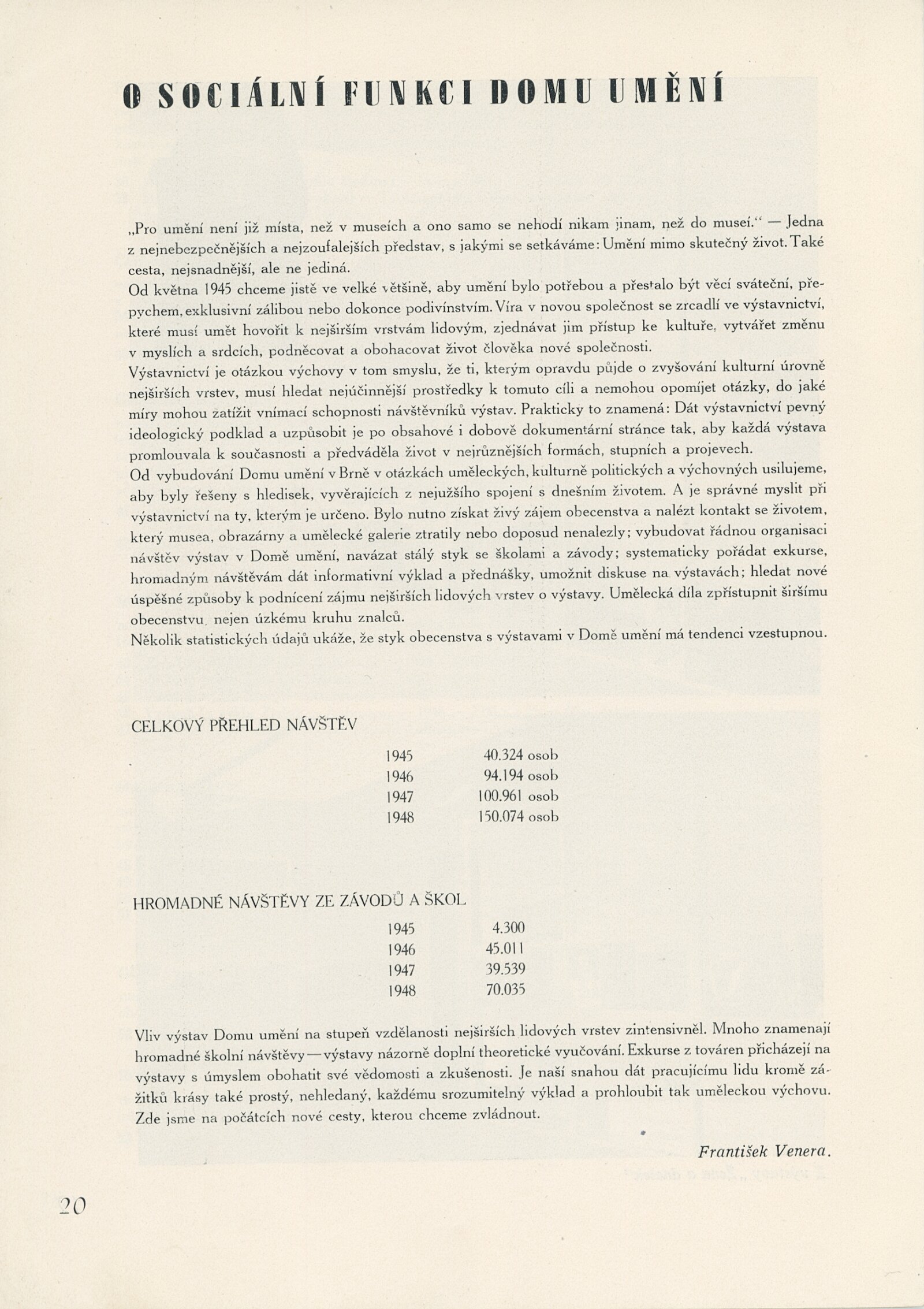 Katalog výstav Domu umění, pořádaných 13. 1. – 30. 1. 1949 / Obsahuje výstavy: Vladimír Iljič Lenin. 93. výstava. (výstavní list), Francouzské nástěnné koberce. 92. výstava (výstavní list) / Texty: Ludvík Kundera, Robert Henry. – Brno: Dům umění, 1949. – 20 s., obr., stať Františka Venery „O sociální funkci Domu umění“, DU 92–93. – MG; MMB