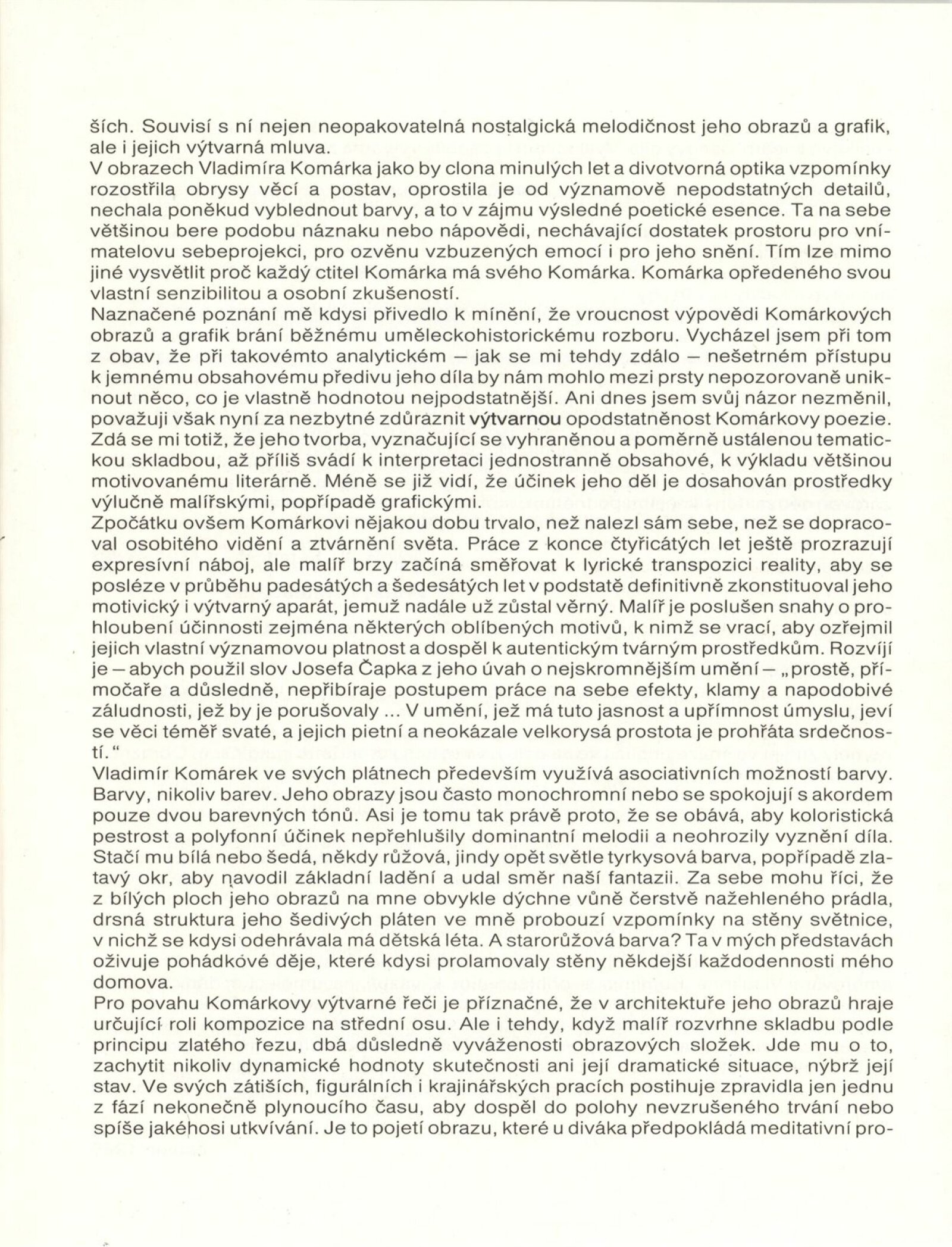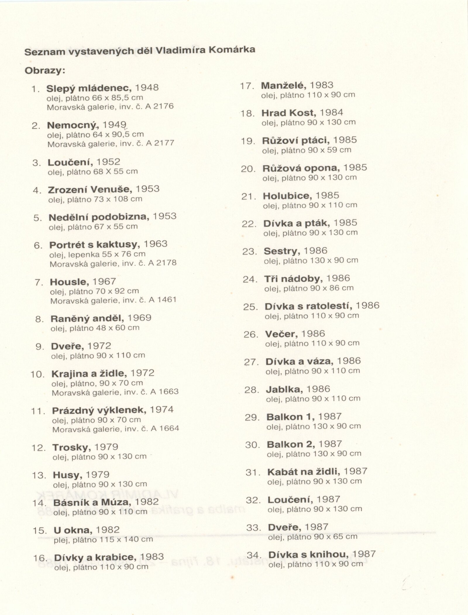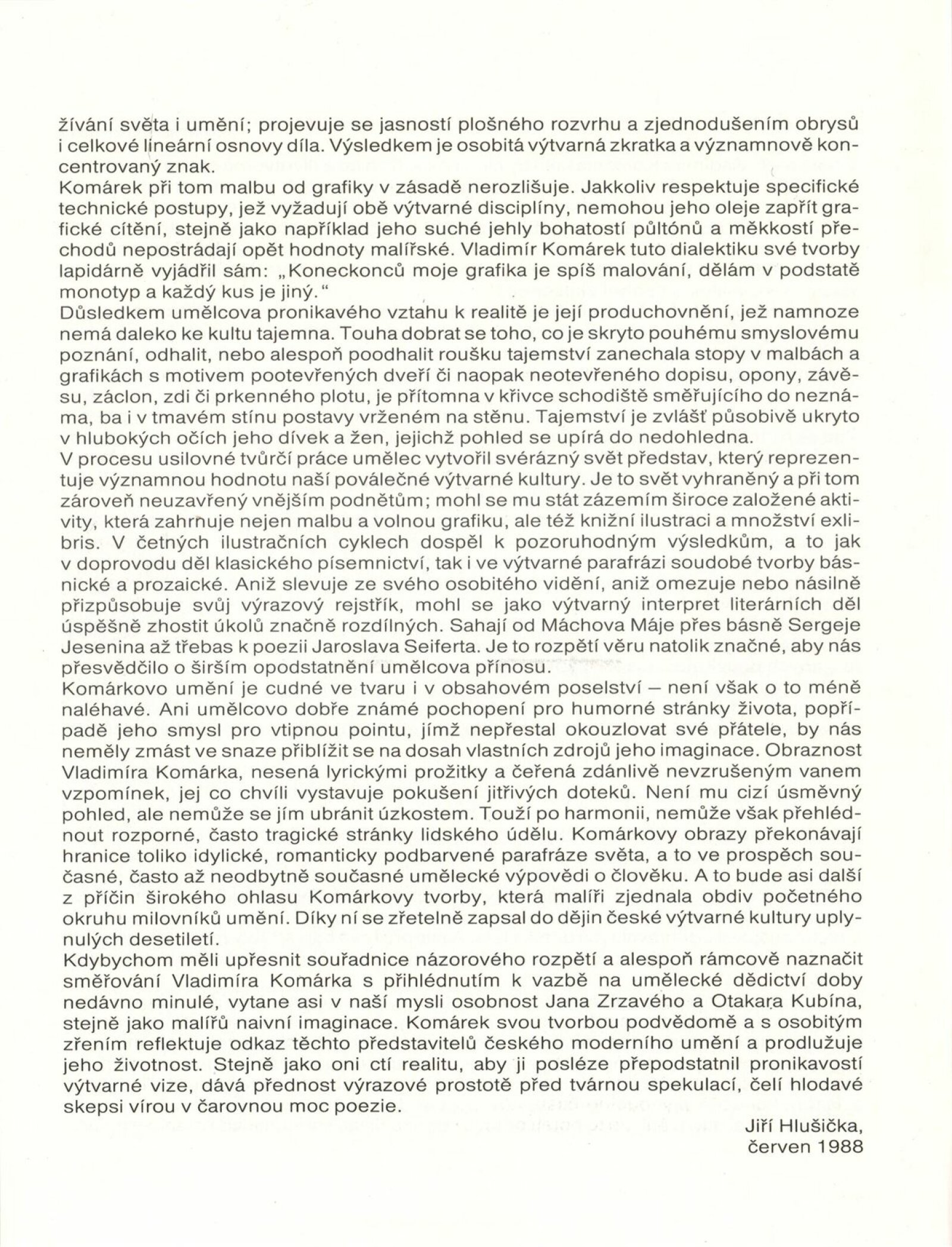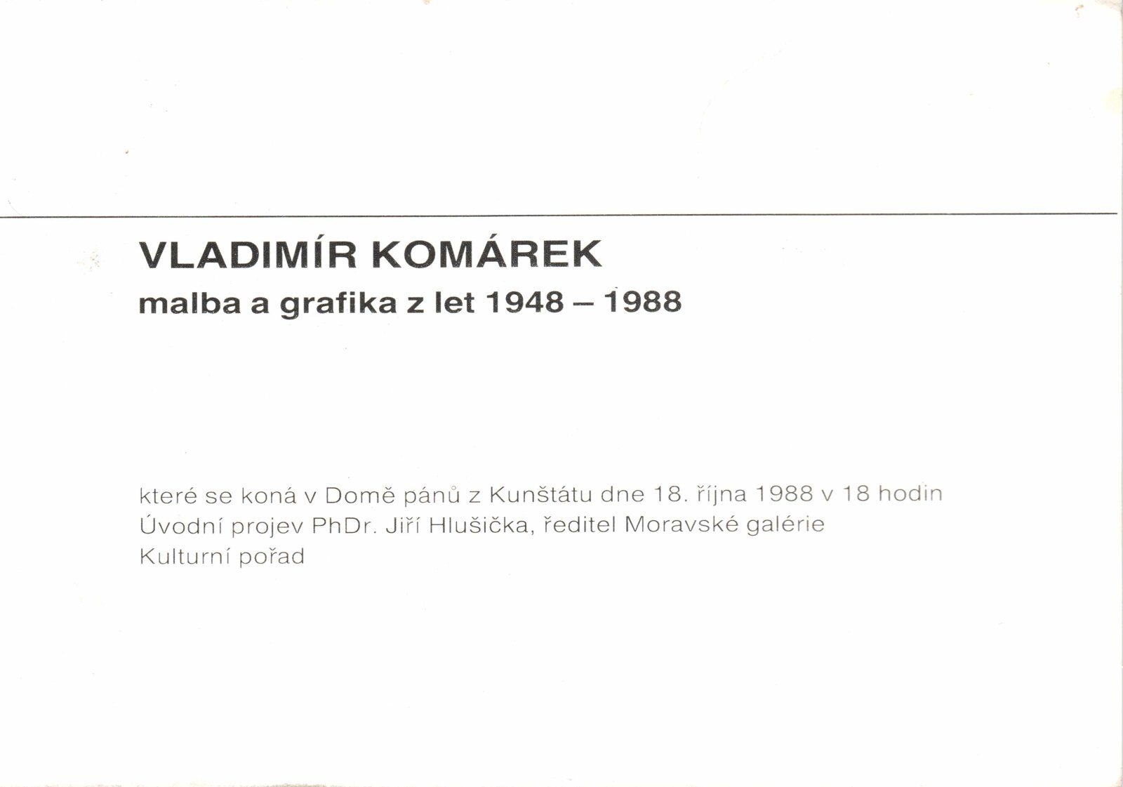 Vladimír Komárek. Malba a grafika z let 1948–1988: Dům umění / Dům pánů z Kunštátu, 18. 10. – 20. 11. 1988 / Text: Jiří Hlušička. – Brno: Moravská galerie, 1988. – [45] s., obr., seznam vystavených prací [7] s., portrét, životní data, seznam výstav, ilustrační tvorba, zastoupení ve sbírkách, bibliografie, DPK 912. – MZK; MG