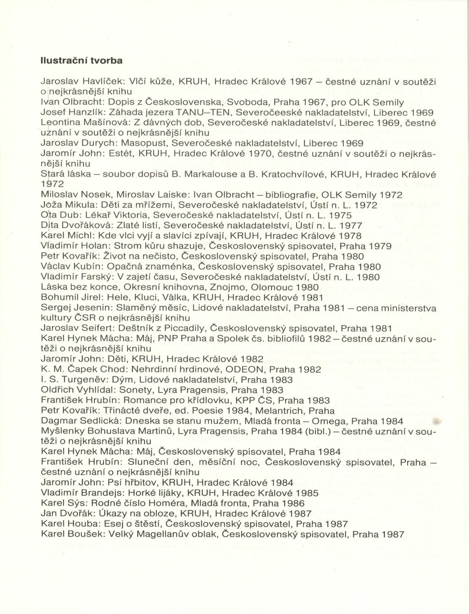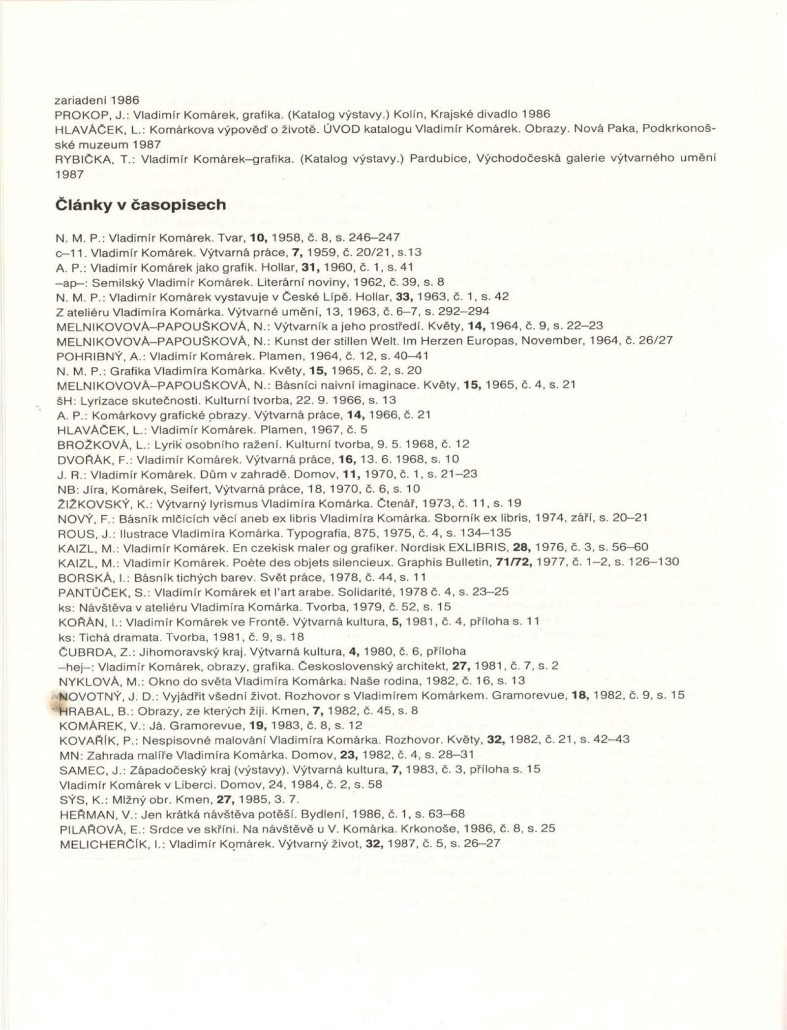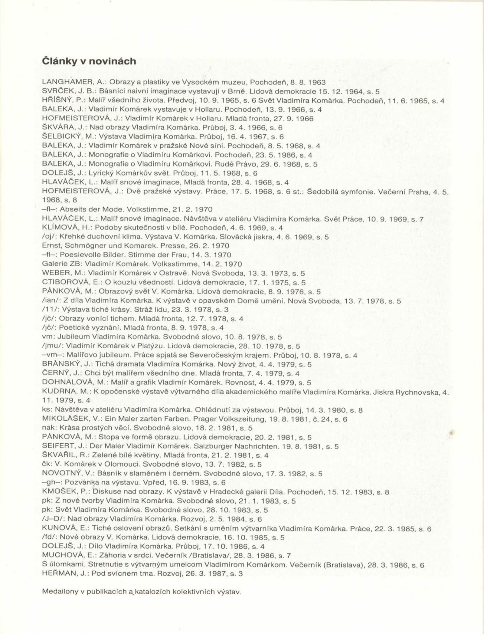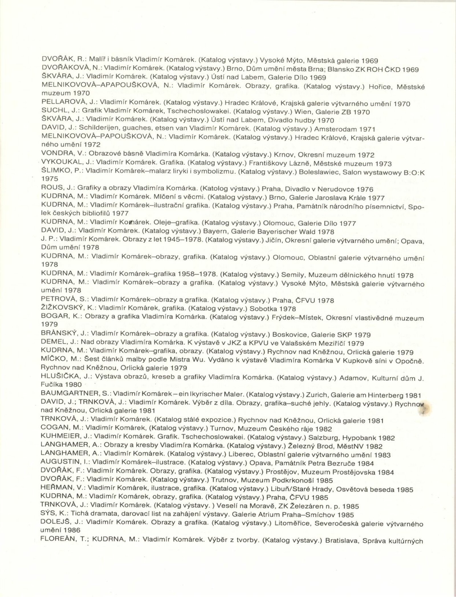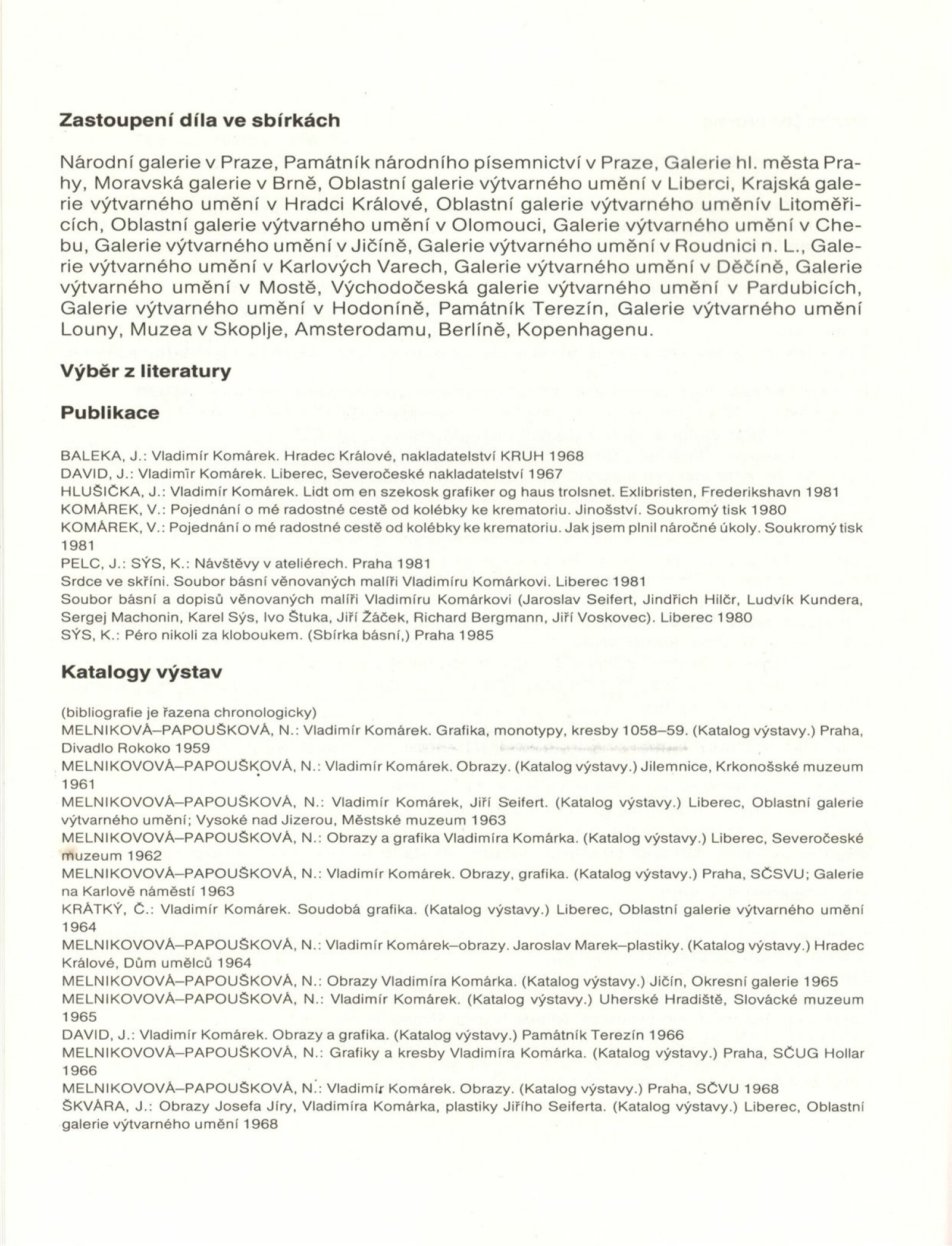 Vladimír Komárek. Malba a grafika z let 1948–1988: Dům umění / Dům pánů z Kunštátu, 18. 10. – 20. 11. 1988 / Text: Jiří Hlušička. – Brno: Moravská galerie, 1988. – [45] s., obr., seznam vystavených prací [7] s., portrét, životní data, seznam výstav, ilustrační tvorba, zastoupení ve sbírkách, bibliografie, DPK 912. – MZK; MG