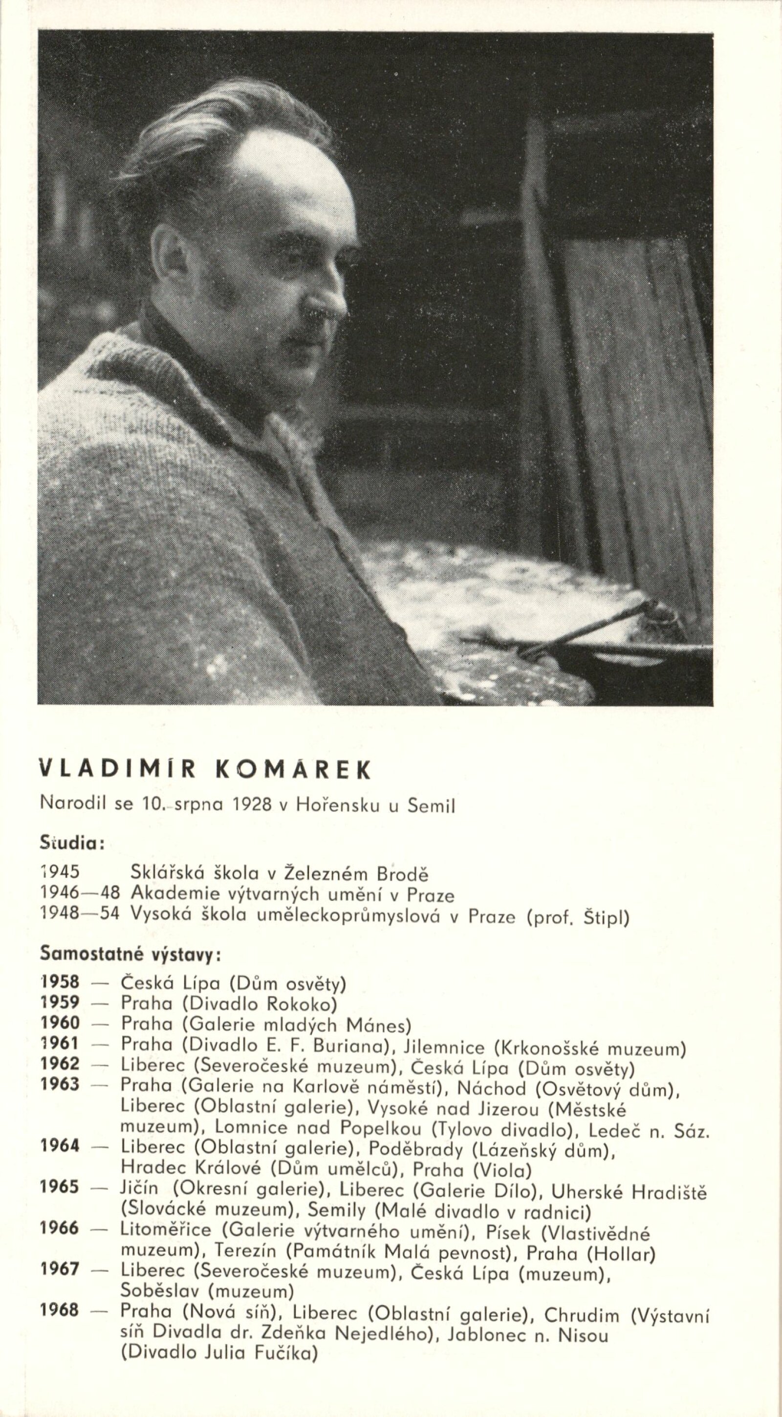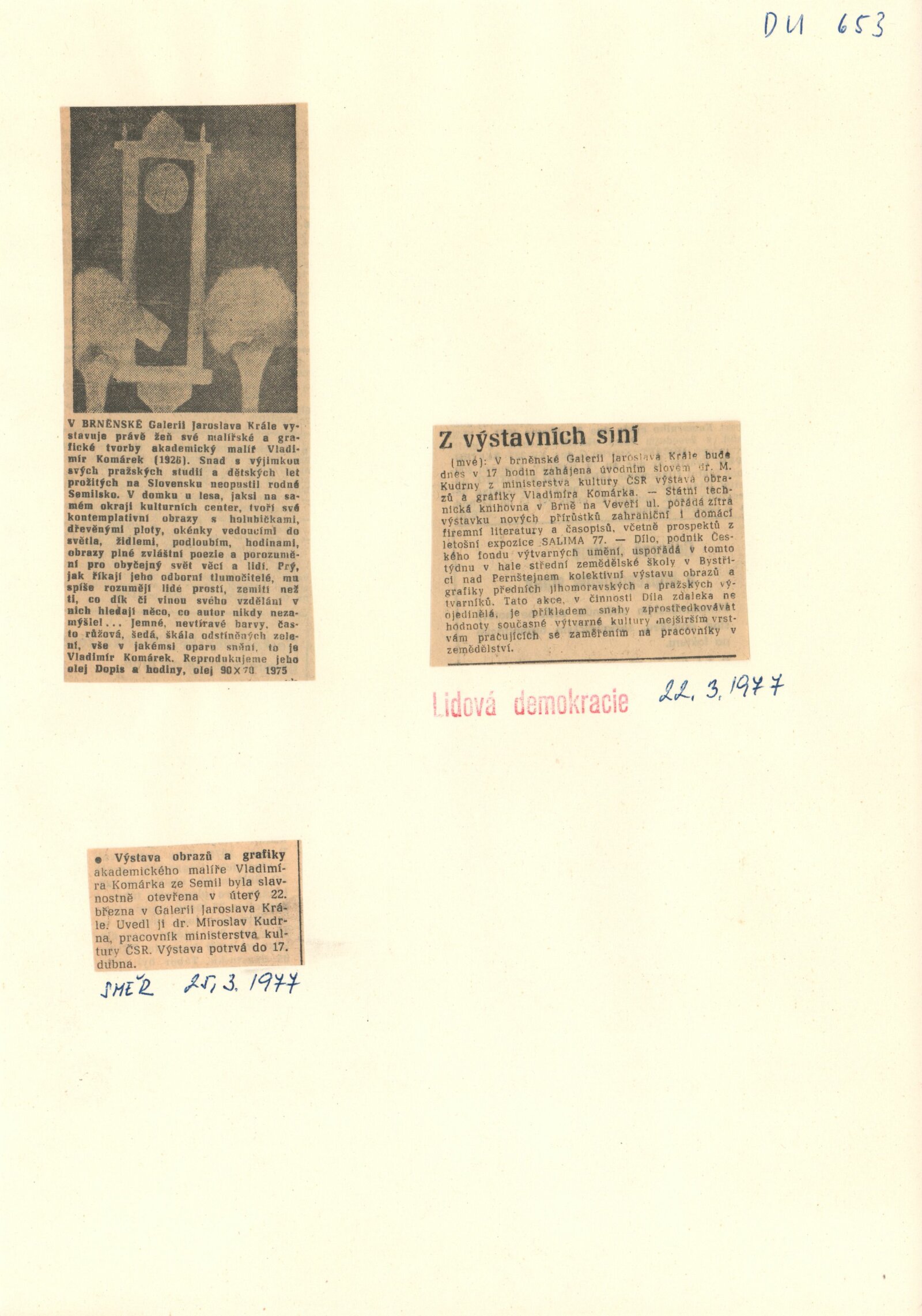 Vladimír Komárek. Obrazy a grafika: Dům umění, 78. výstava v Galerii Jaroslava Krále 22. 3. – 24. 4. 1977 / Text: Miroslav Kudrna. – Brno: ČFVU, 1977. – 2 s., 12 s. obr., seznam vystavených prací 1 s., portrét, životní data, seznam výstav, DU 653. – MG