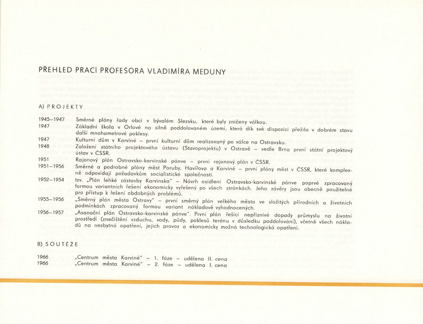 Vladimír Meduna. Architekt–urbanista: Dům umění / Dům pánů z Kunštátu, 155. výstava Kabinetu architektury, 24. 1. – 24. 2. 1985 / U příležitosti 75. narozenin vydána publikace Vladimír Meduna. Architekt urbanista. – Texty: František Bartek, Zdeněk Šaman, Zdeněk Kuna, Josef Kempný, Vladimír Meduna. Brno: FA VUT, 1985. – 56 s., DPK 837. – MZK; MG