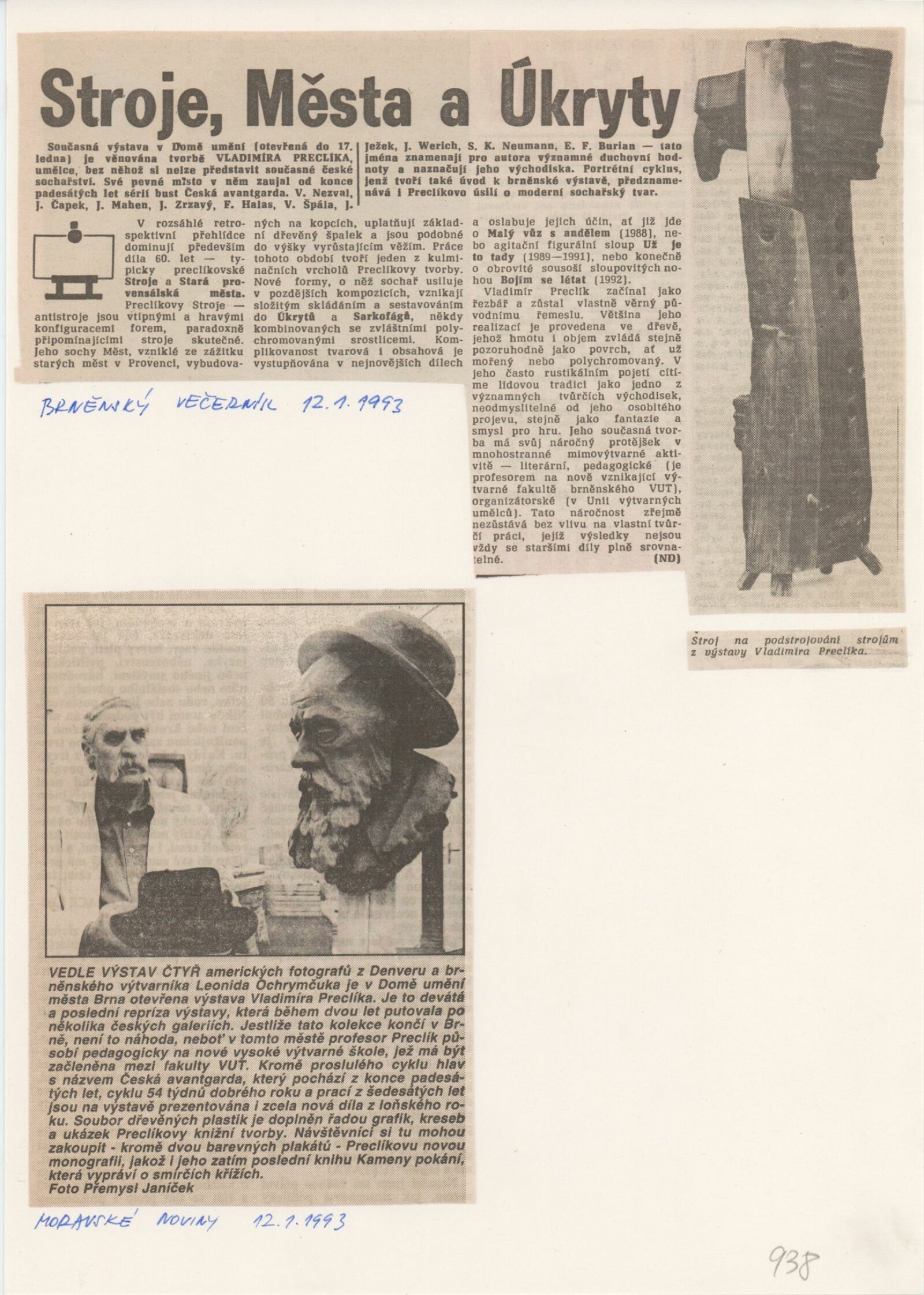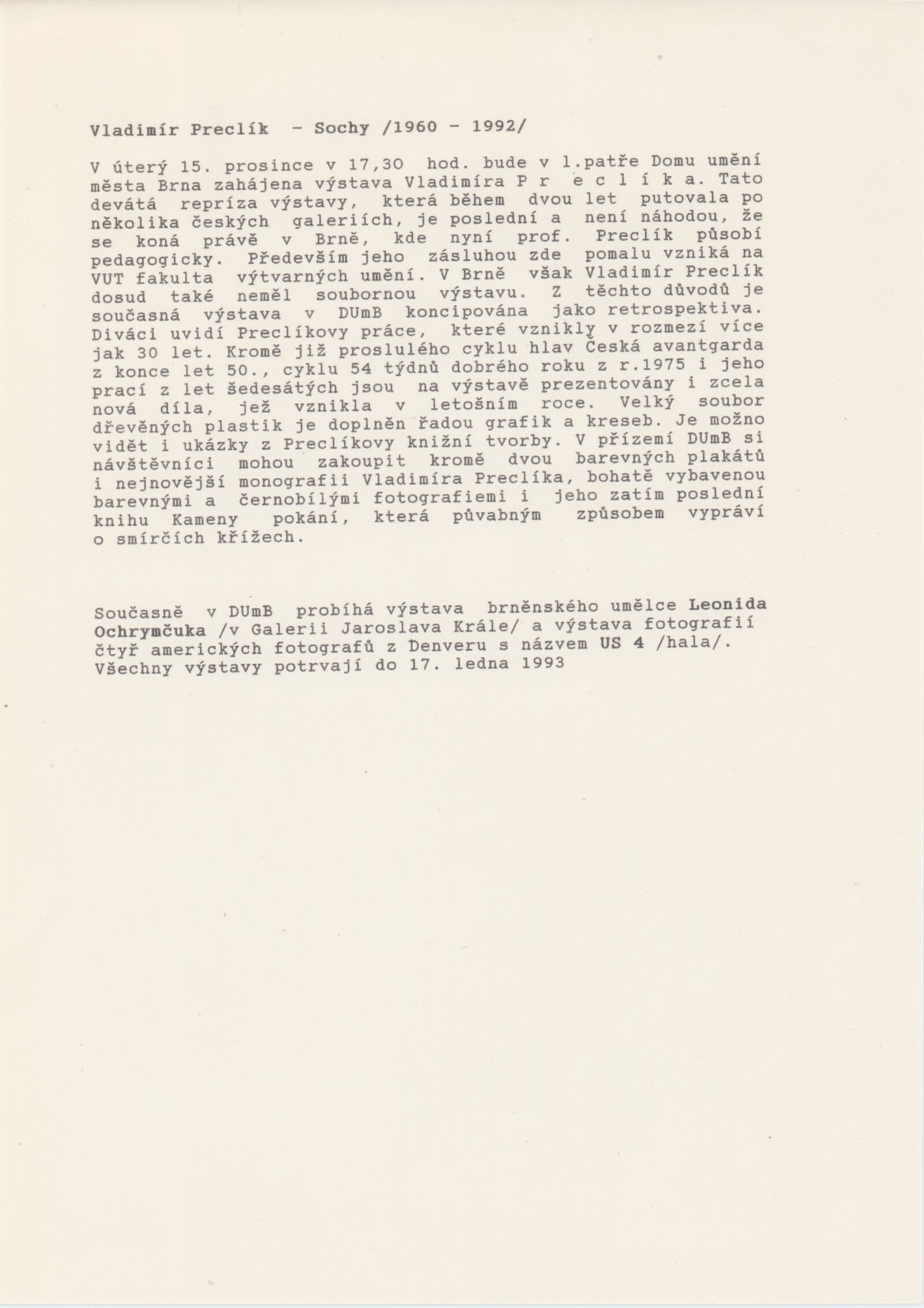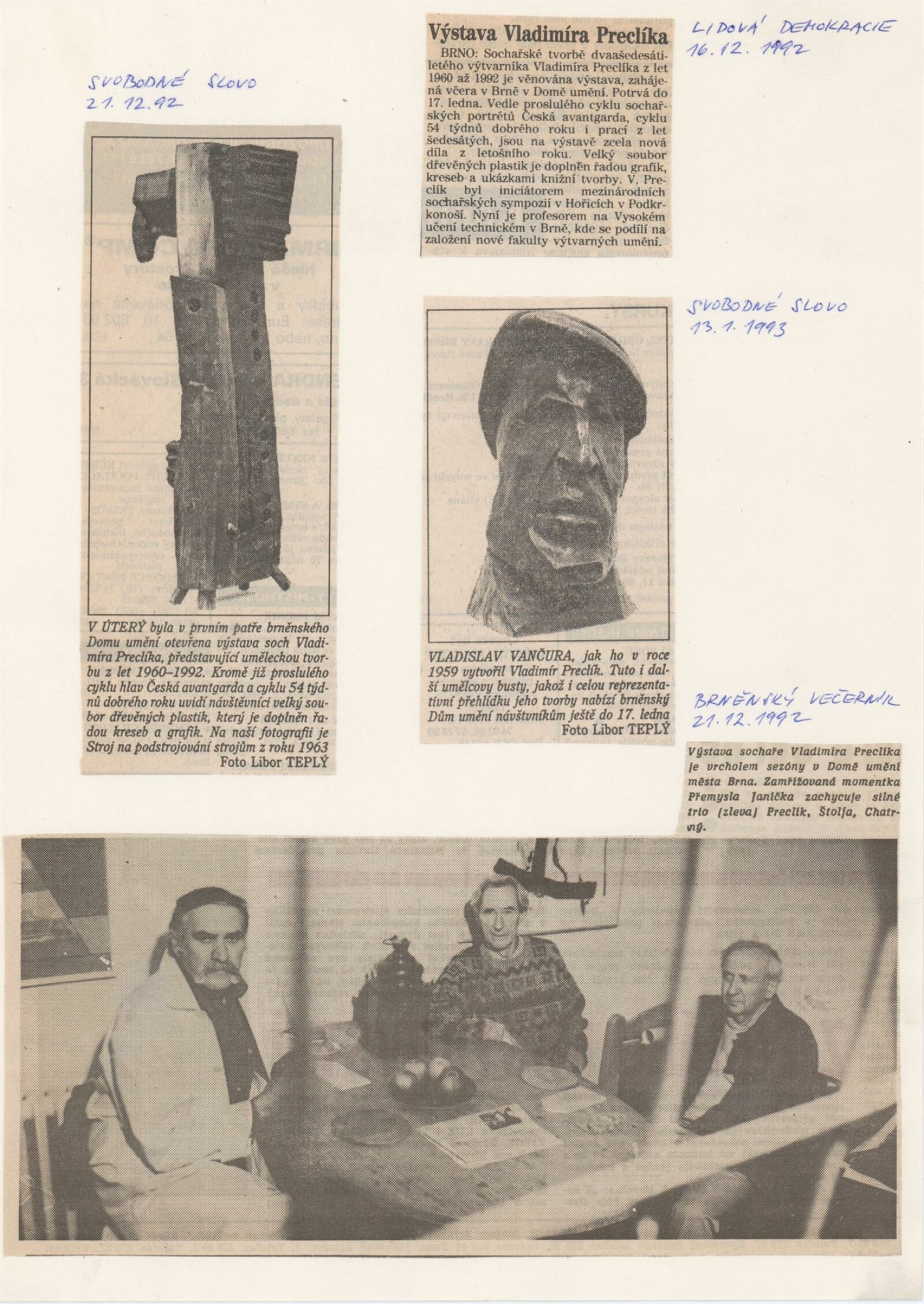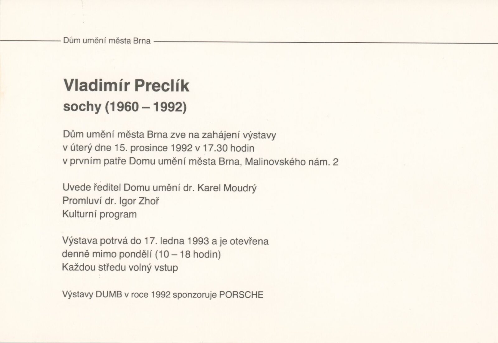 Vladimír Preclík: Dům umění města Brna, 15. 12. 1992 – 17. 1. 1993 / Texty: Karel Šiktanc, Milan Kundera, František Šmejkal, Eva Petrová, Jan Werich, Bohumil Hrabal, Jana a Jiří Ševčíkovi, Ludvik Kundera, Igor Zhoř, Ladislav Daneš, Jiří Valoch, Vladimír Preclík. – Praha: Orbis pictus, 1992. – 125 s., obr., portrét, životopis, výstavy, zastoupení ve sbírkách, DU 938. – MG