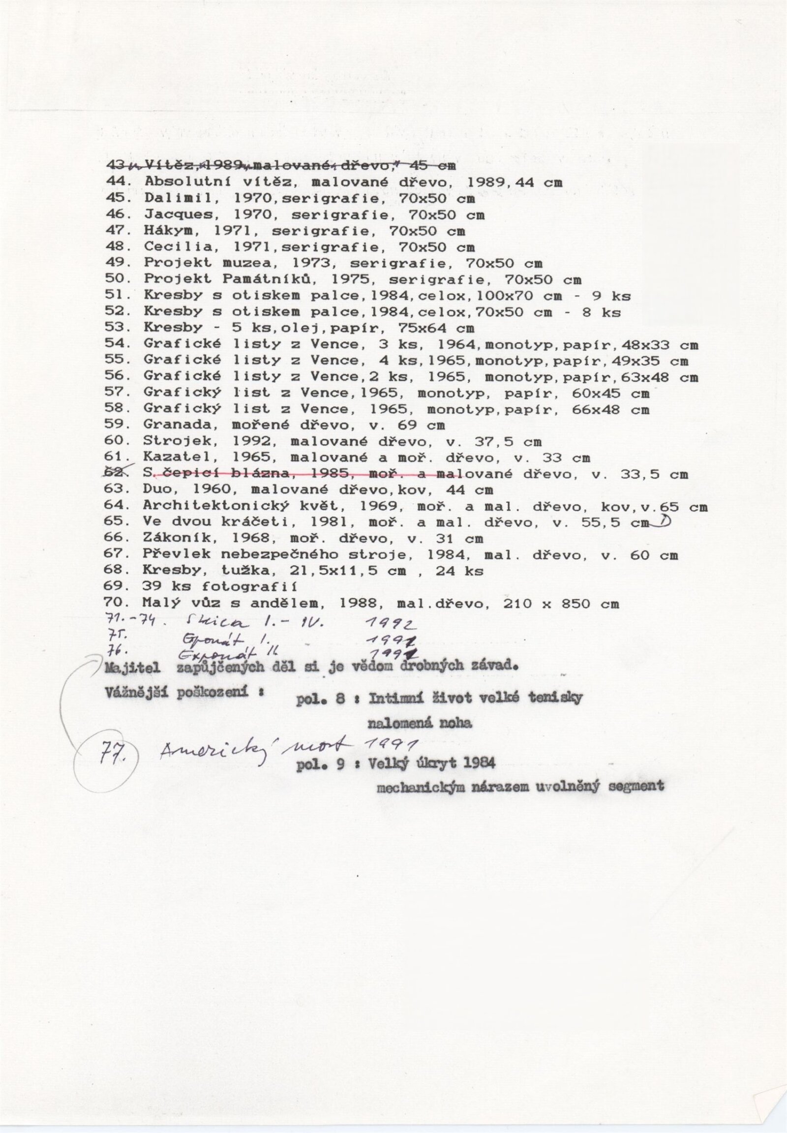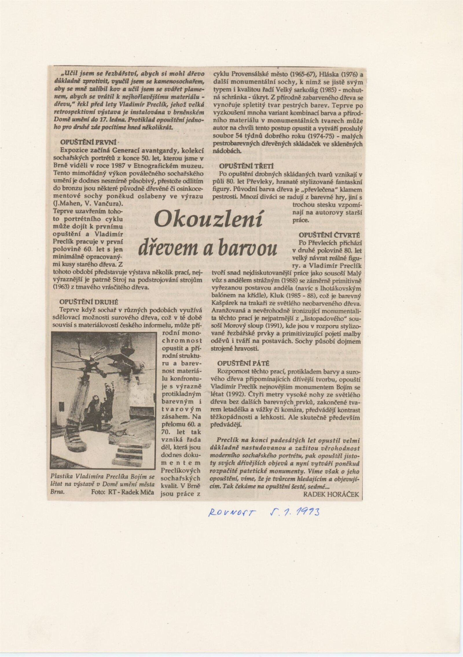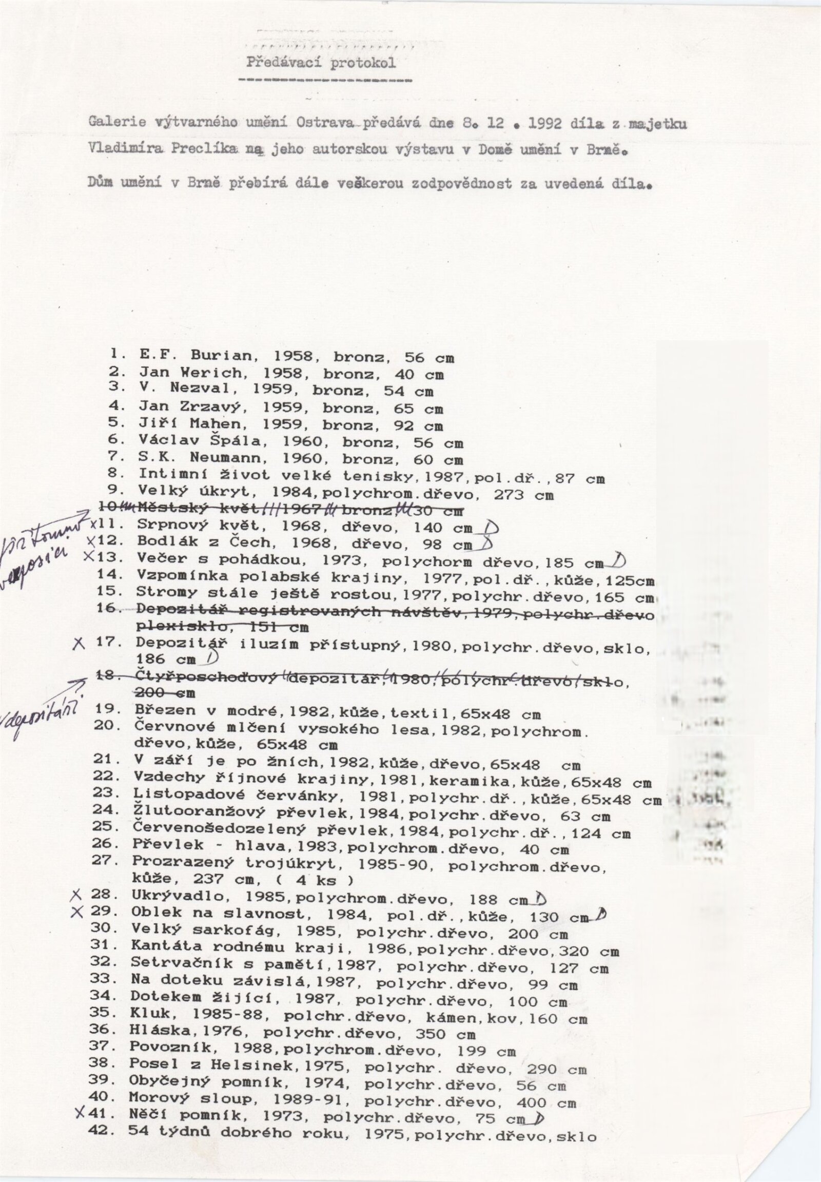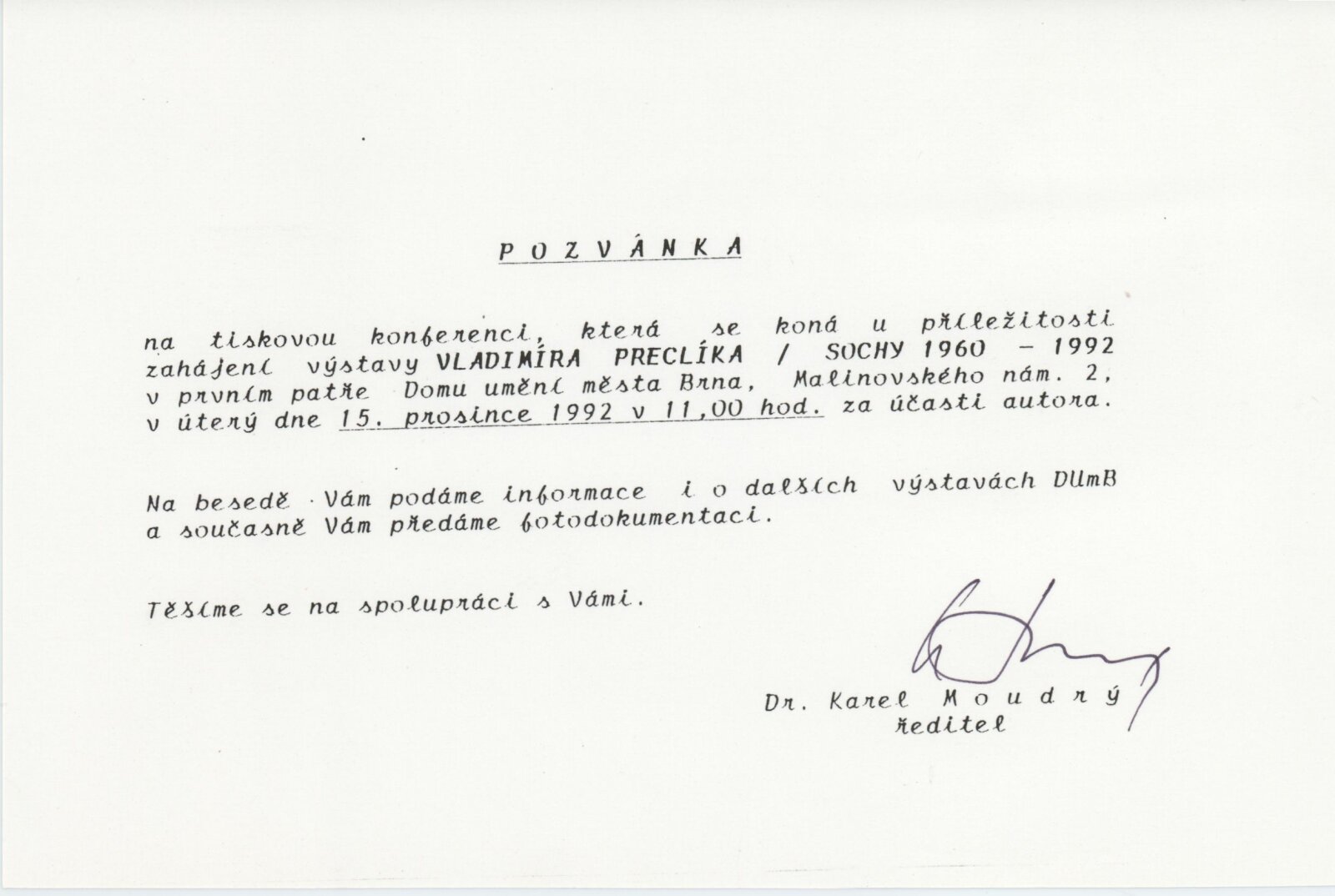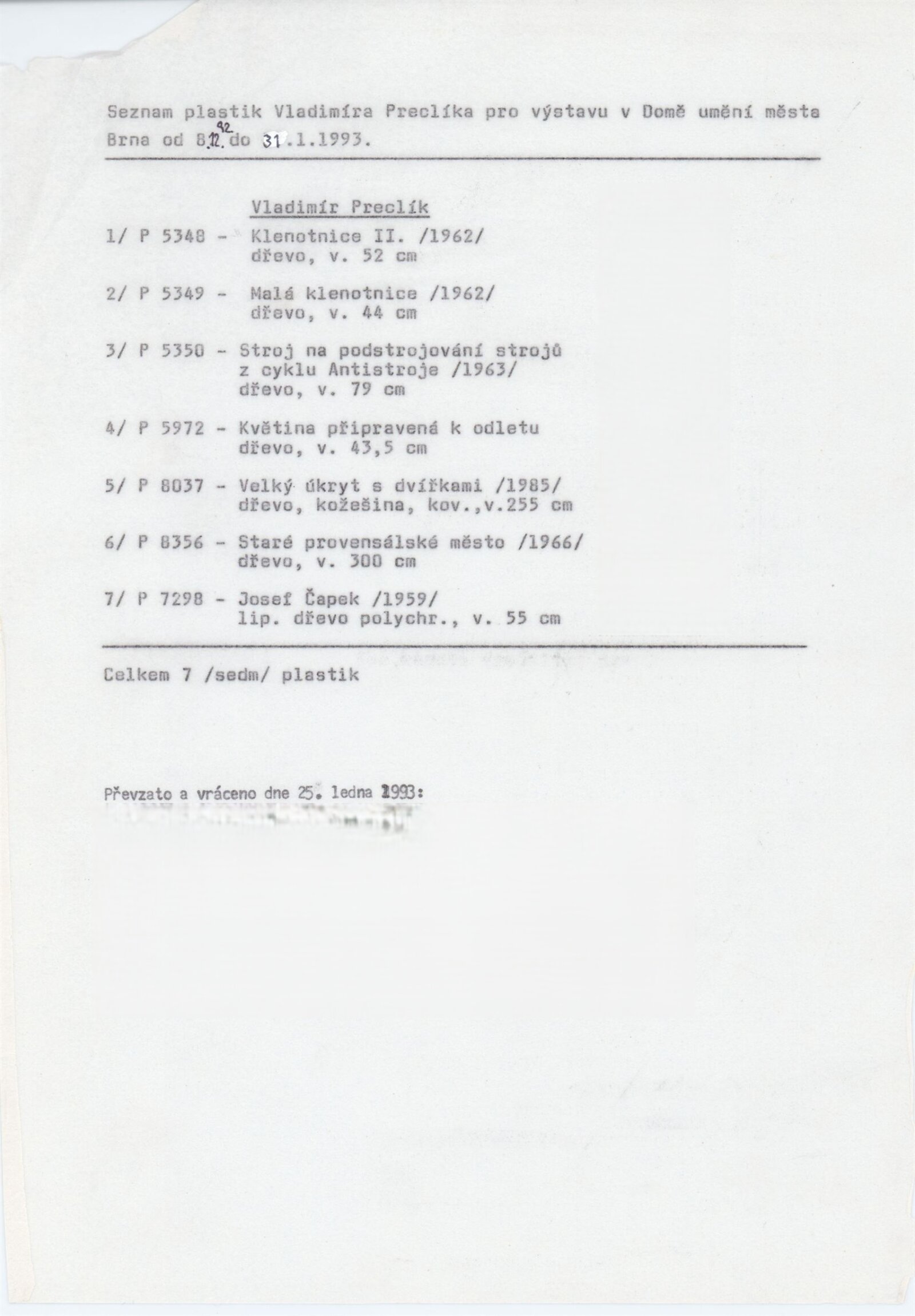 pozvánka na výstavu a tiskovou konferenci, harmonogram výstav V. Preclíka po ČR, strojopis pozvánky, zpráva pro média, fotografie děl, korespondence o realizaci výstavy, provozní korespondence, předávací protokol, smlouva o výpůjčce, reversy, hospodářská smlouva, recenze v tisku, pozvánka na výstavu V. Preclíka v Praze (1991)