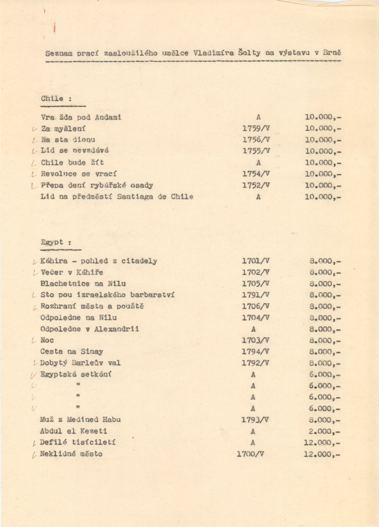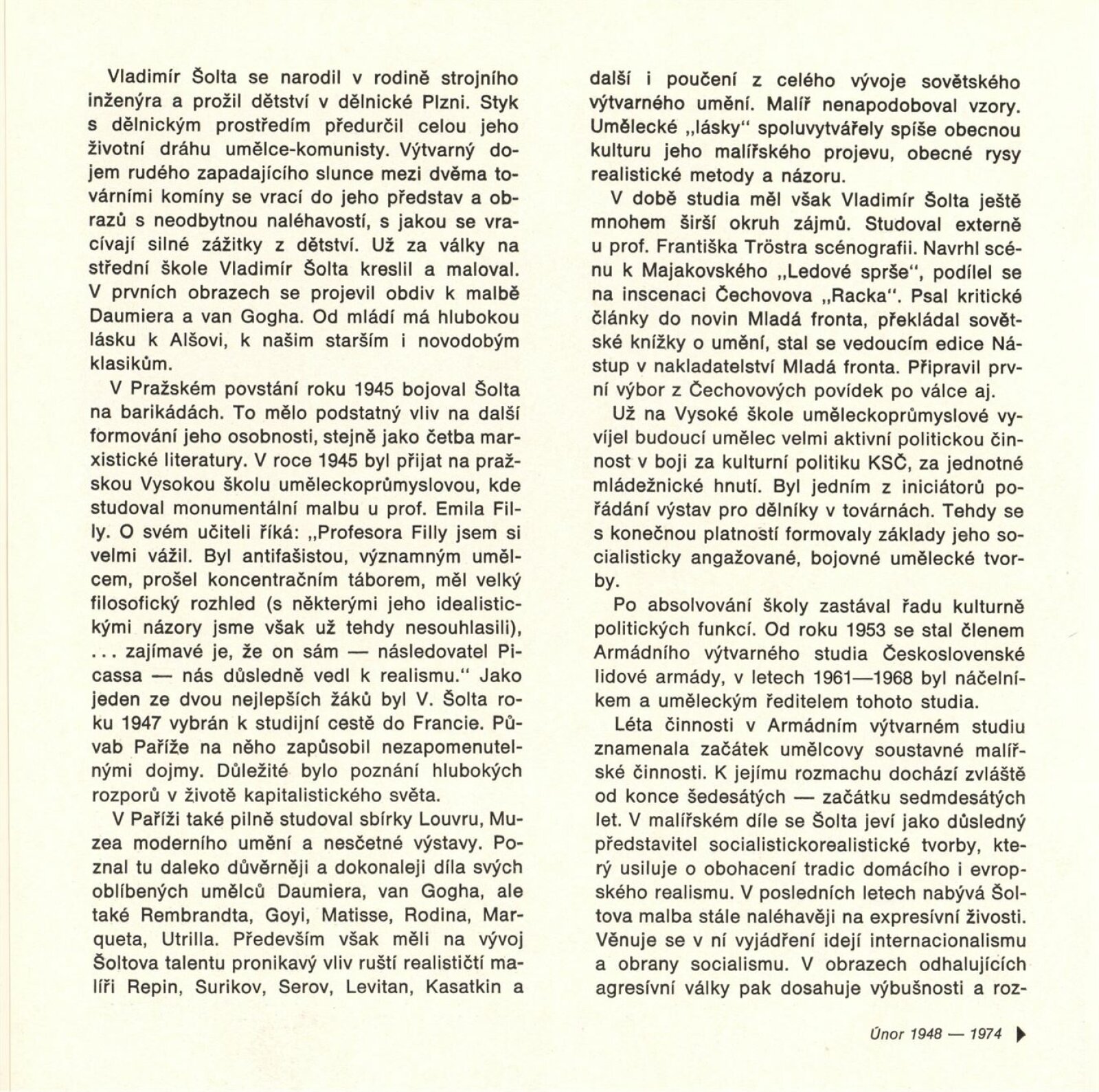 Vladimír Šolta. Obrazy, kresby, keramika. Výběr z cyklů 1963–1976: Dům umění města Brna, 21. 5. – 20. 6. 1976 / Text: Dušan Konečný. – Praha: Armádní výtvarné studio, 1976. – 28 s., obr., portrét, životní data, výstavy, neobsahuje seznam vystavených prací, DU 640. – MZK; MG