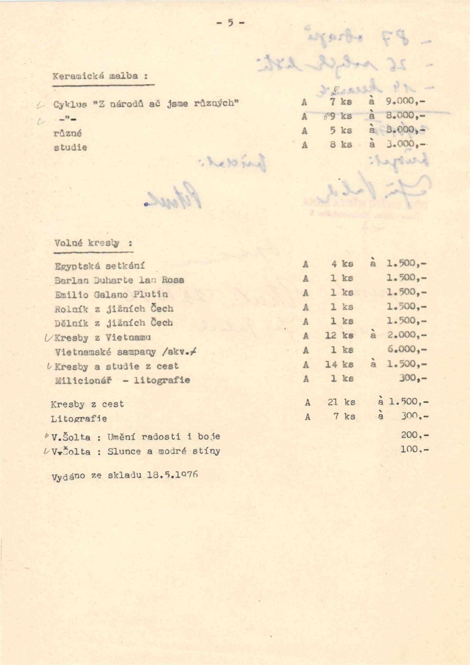 pozvánka, katalog, katalogy společných výstav (Pardubice 1975, Praha 1976), leaflet (Praha 1975), seznam vystavených děl, zpráva pro tisk, prezenční listina, provozní korespondence, výstavní smlouva, recenze v tisku