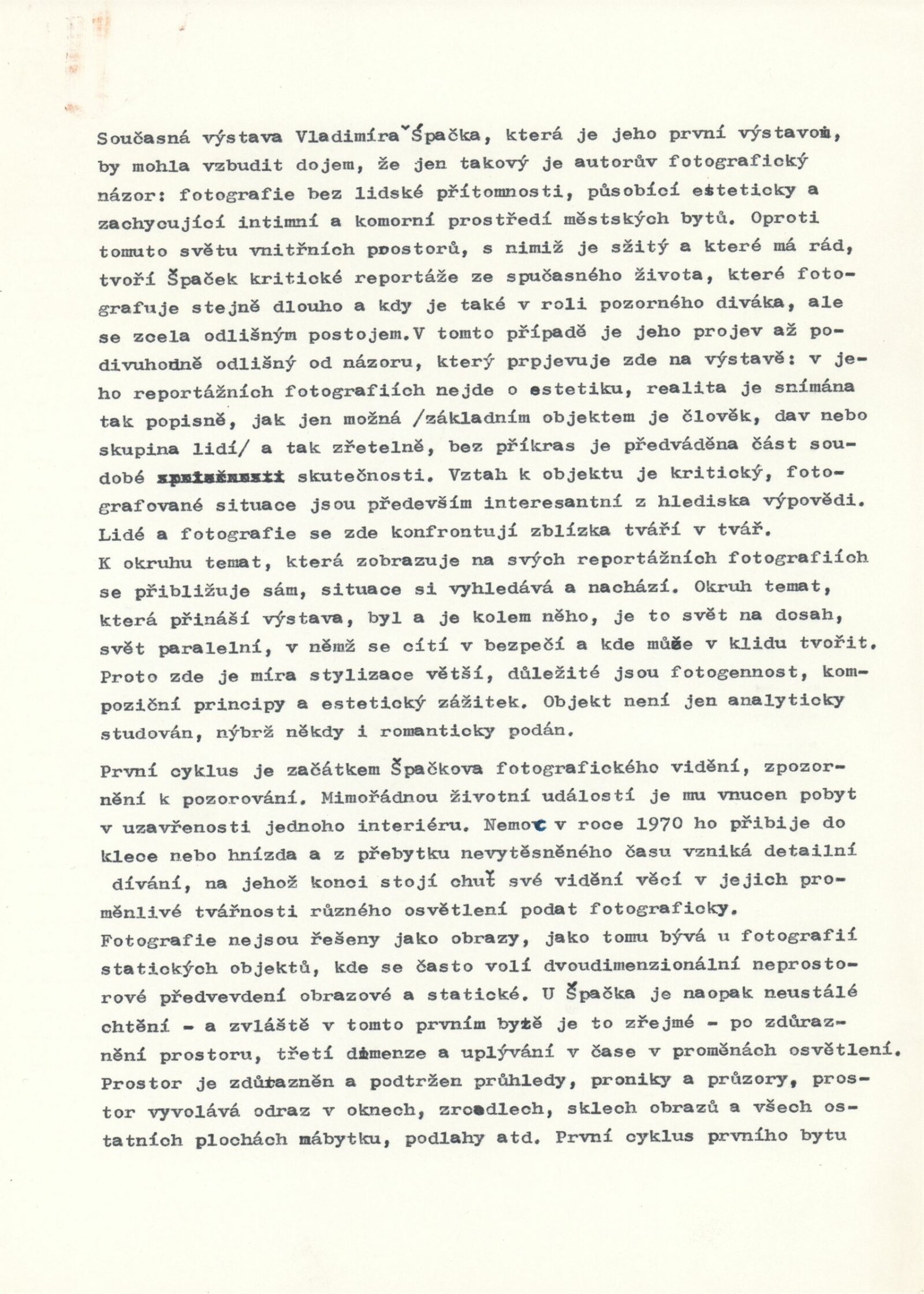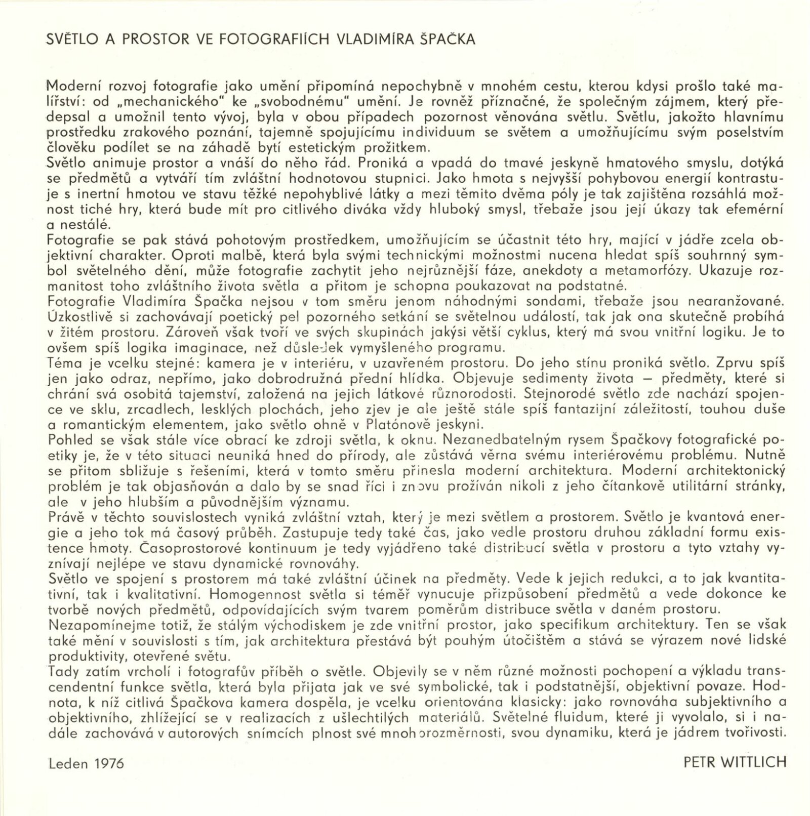 Vladimír Špaček. Světlo a prostor: Dům umění / Dům pánů z Kunštátu, Kabinet fotografie Jaromíra Funka, 21. 1. – 27. 2. 1977 / Text: Petr Wittlich. – Brno: DUmB, 1977. – 12 s., obr., DPK 642. – MZK; MG