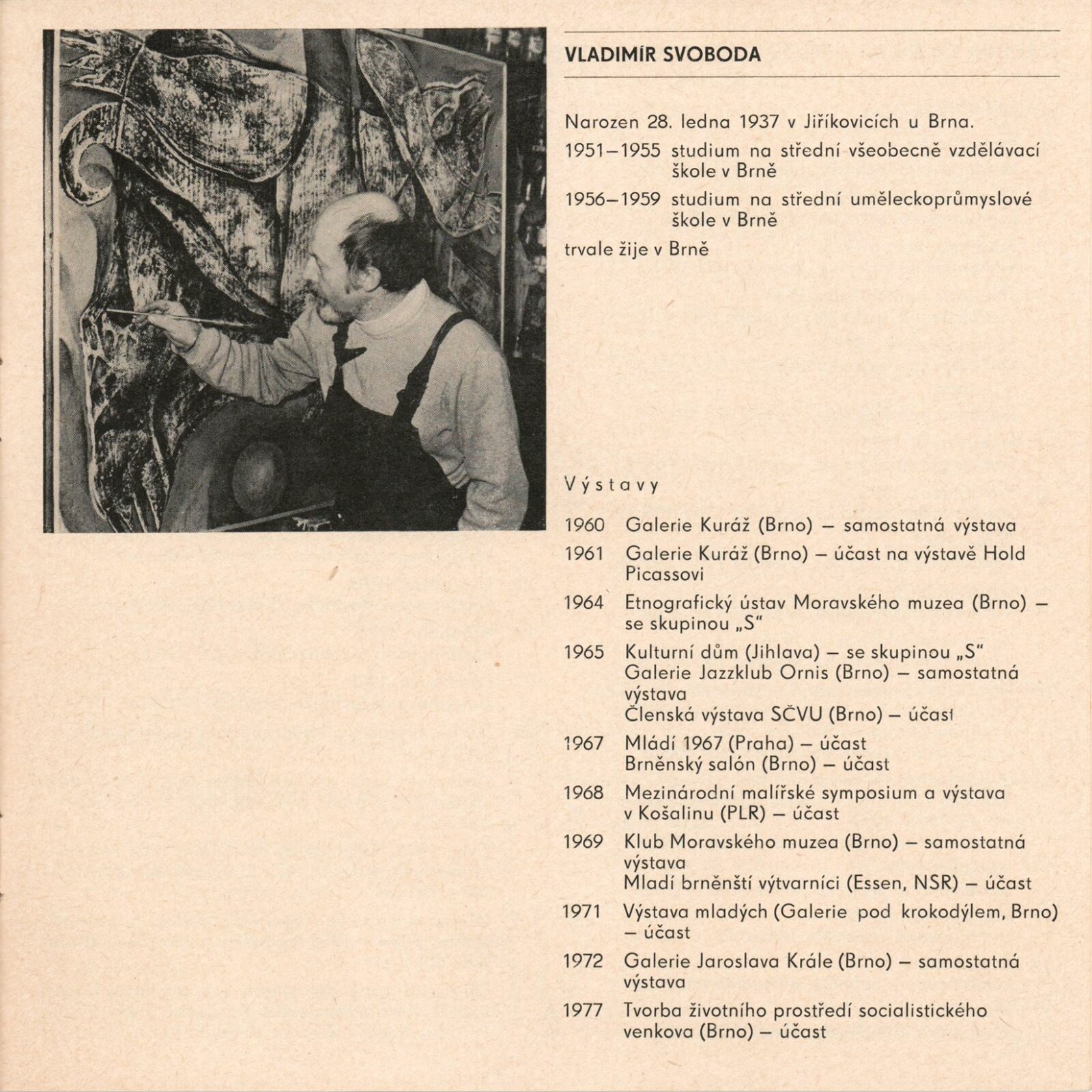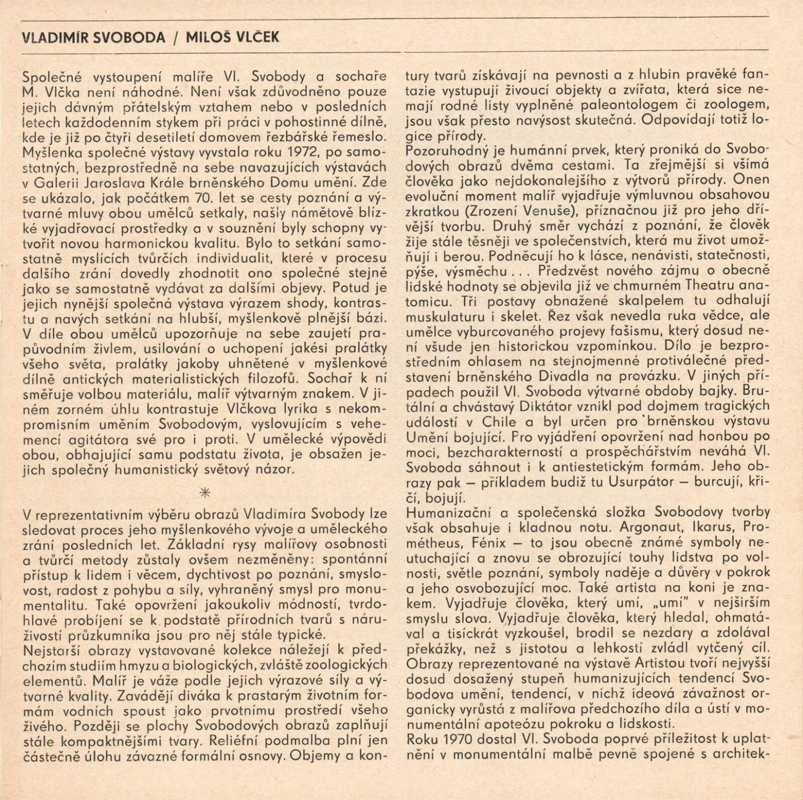 Vladimír Svoboda. Miloš Vlček. Obrazy. Plastiky. Práce z posledních let: Dům pánů z Kunštátu 23. 4. – 28. 5. 1978. / Text Eva Samková. - Brno: DUmB, - 20 s., obr. Portréty, životní data, výstavy DPK 675; MZK; MG