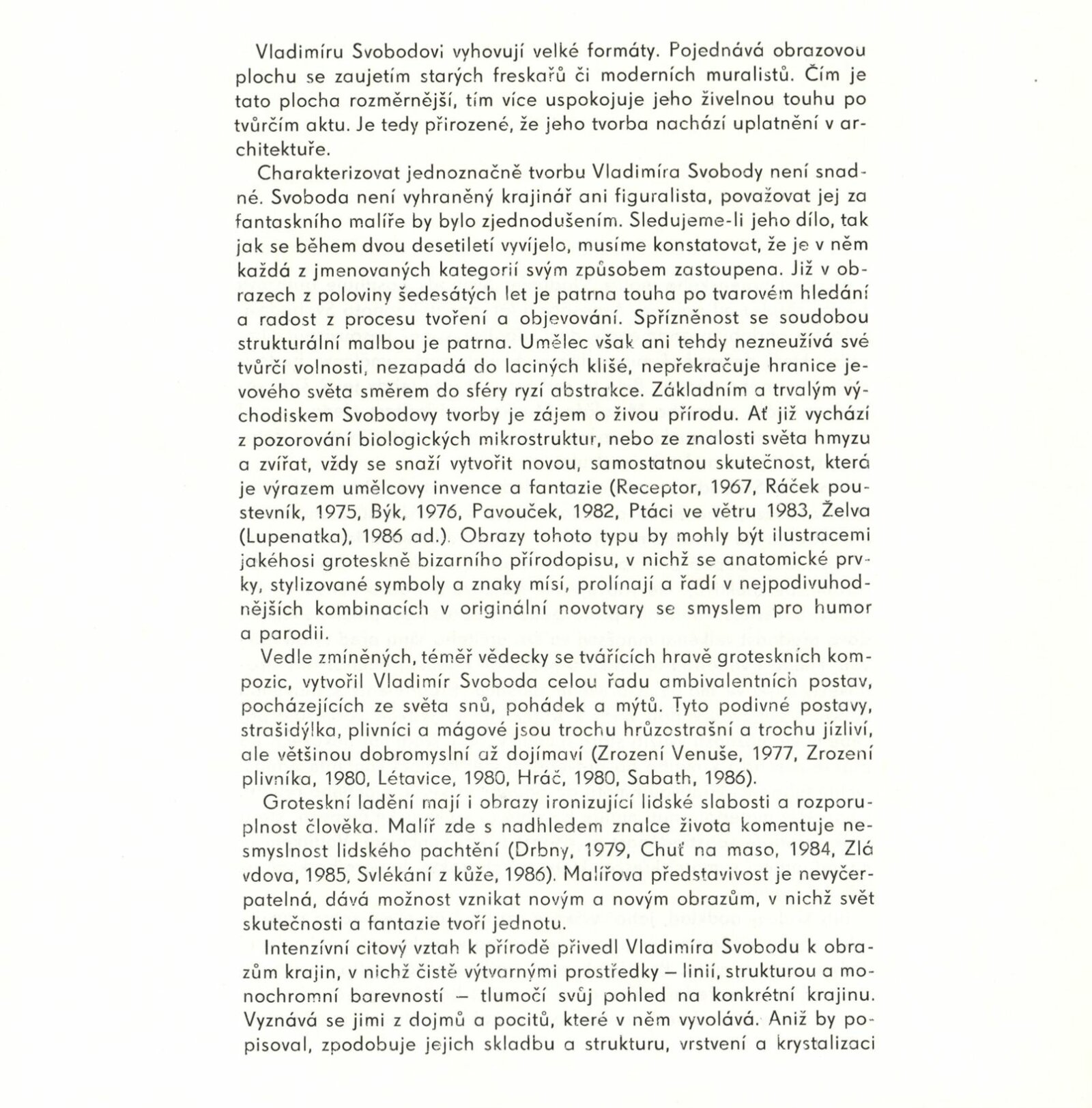Vladimír Svoboda. Obrazy: Dům umění / Dům pánů z Kunštátu, 2. 6. – 5. 7. 1987 / Text: Jiřina Hockeová. – Brno: DUmB, 1987. – [17] s., obr., portrét, životní data, výstavy, realizace v architektuře, DPK 893. – MZK; MG; MMB