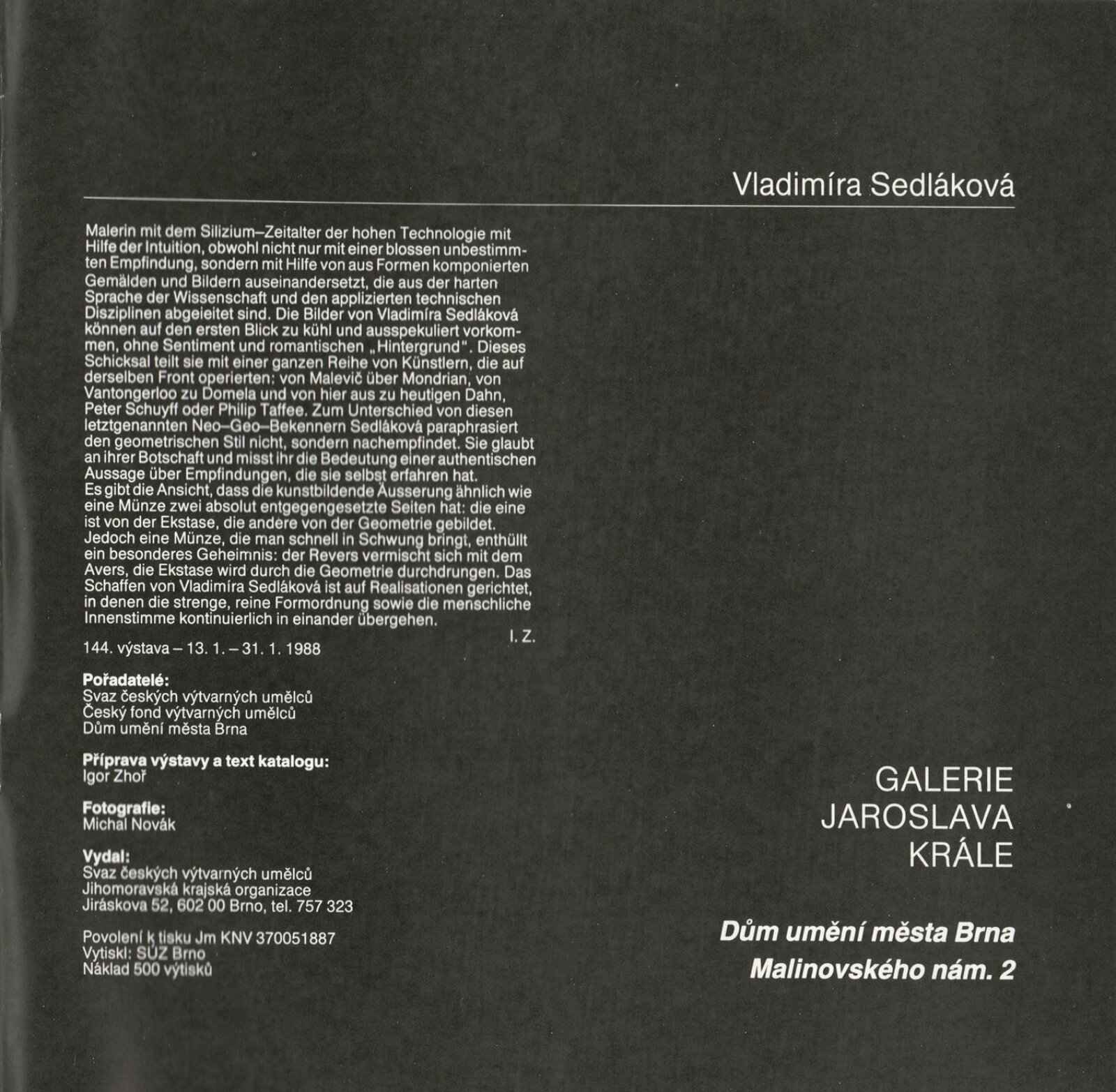 Vladimíra Sedláková. Profil výrobního procesu: Dům umění, 144. výstava Galerie Jaroslava Krále, 13. 1. – 31. 1. 1988 / Text: Igor Zhoř. – Brno: SČVU, 1988. – [16] s., obr., DU 847. – MZK; MG; MMB