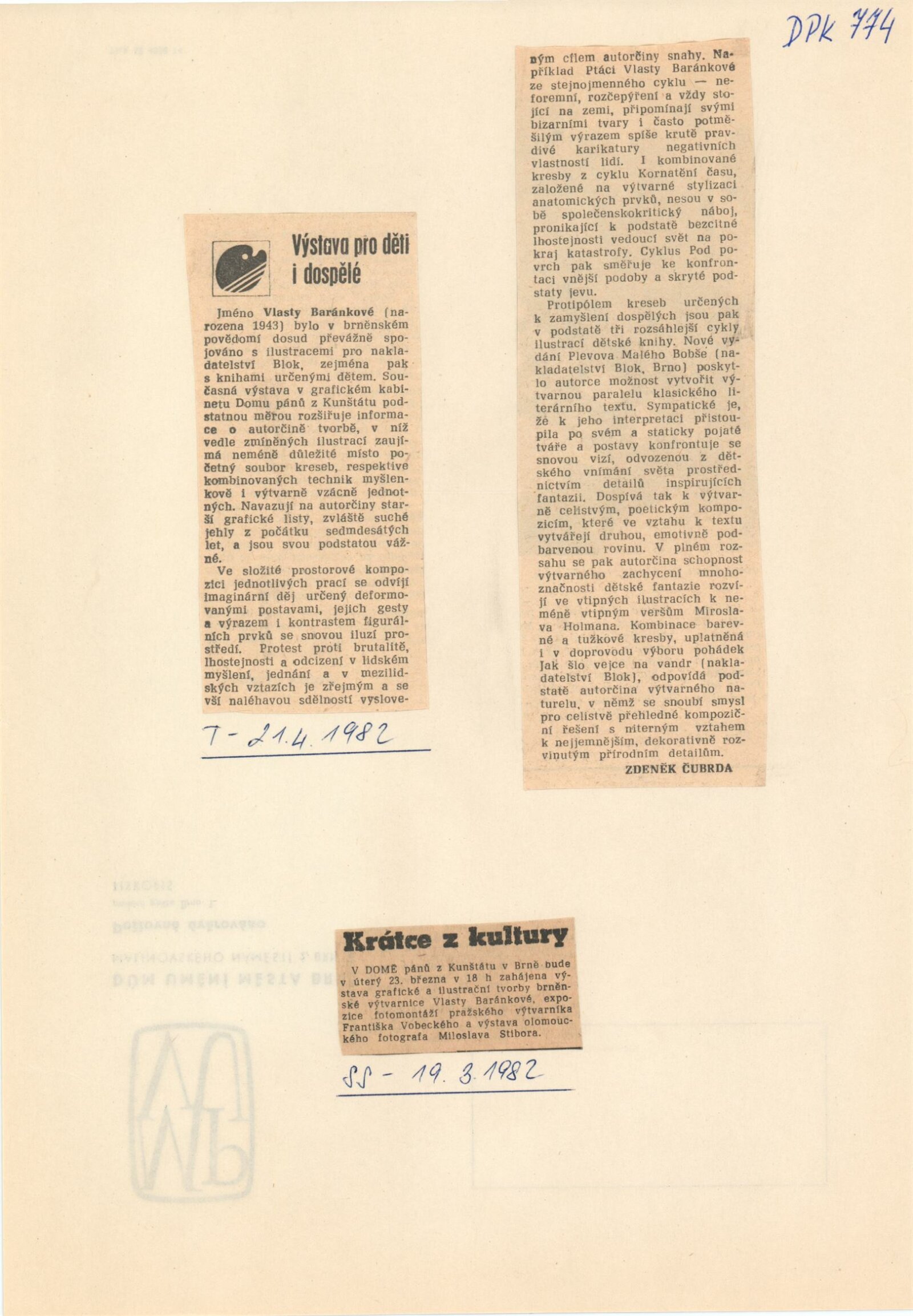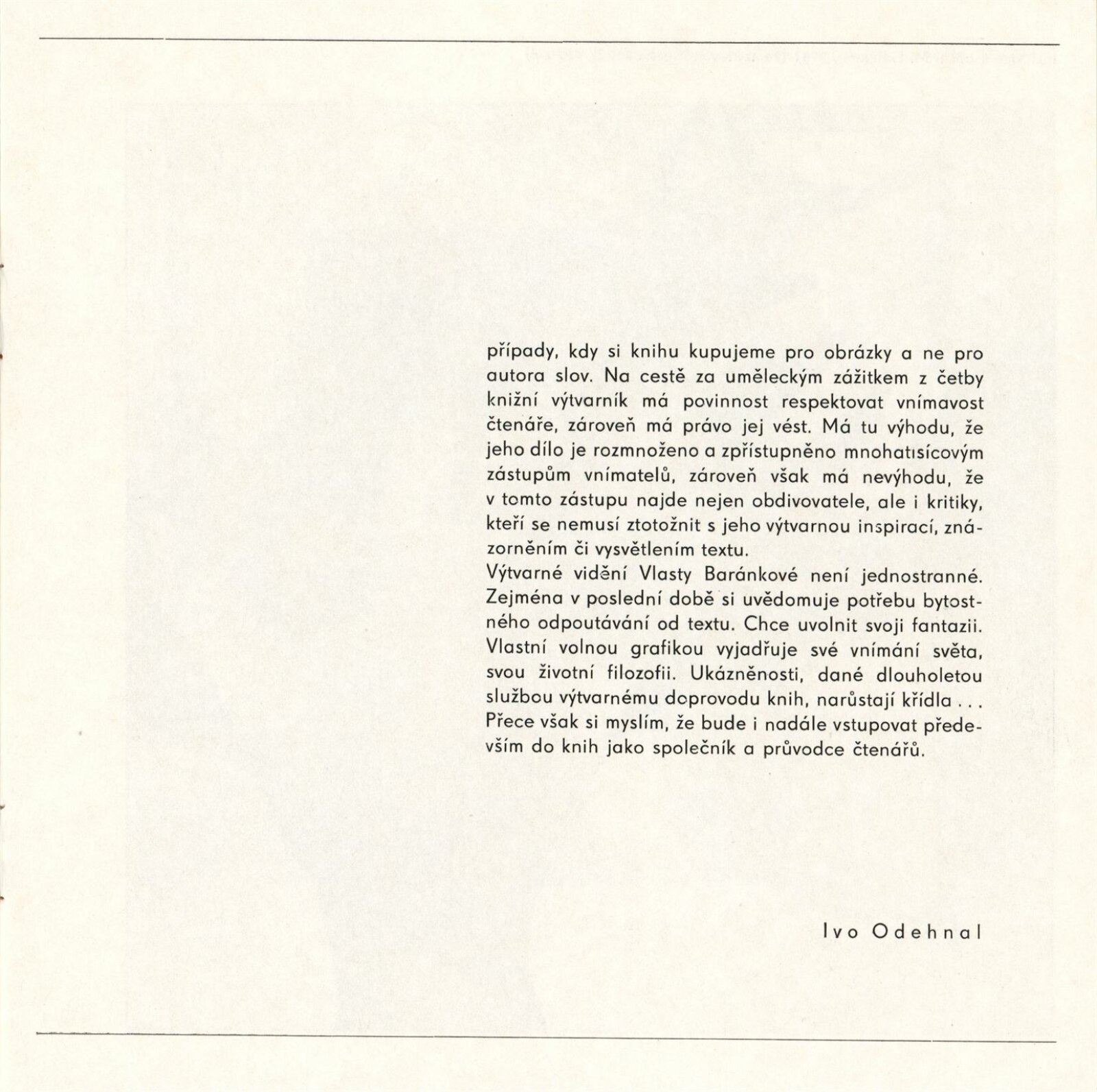 Vlasta Baránková. Ilustrace, grafika: Dům umění / Dům pánů z Kunštátu, Kabinet grafiky, 23. 3. – 18. 4. 1982 / Text: Ivo Odehnal. – Brno: DUmB, 1982. – 8 s., obr., seznam vystavených prací 1 s., životopis, seznam výstav a ilustrací, DPK 774. – MZK; MG