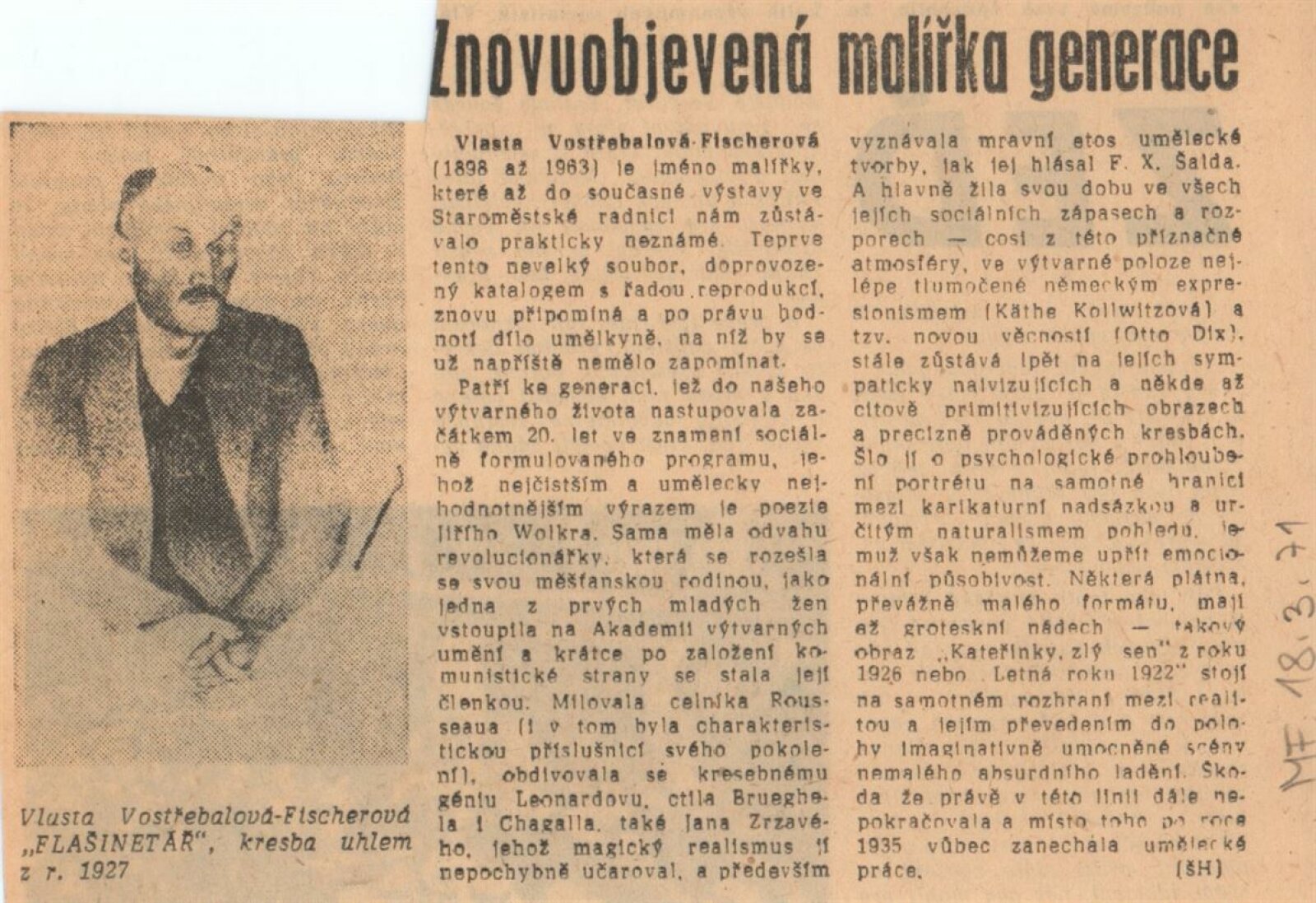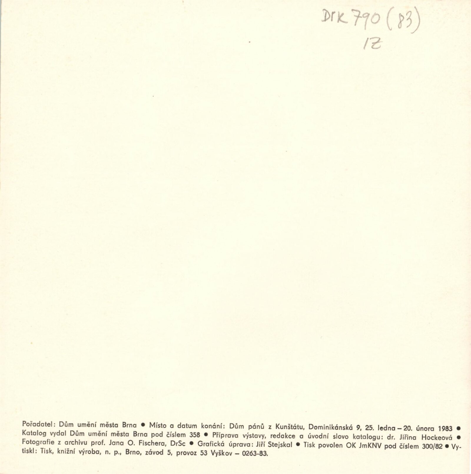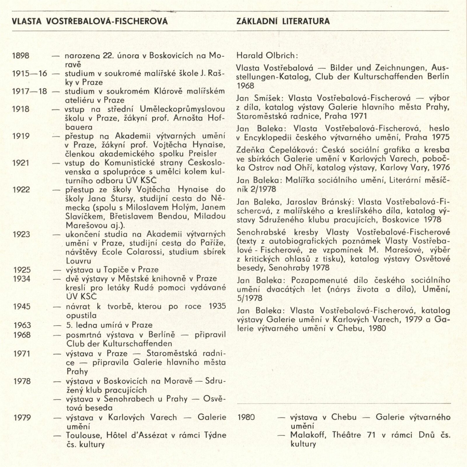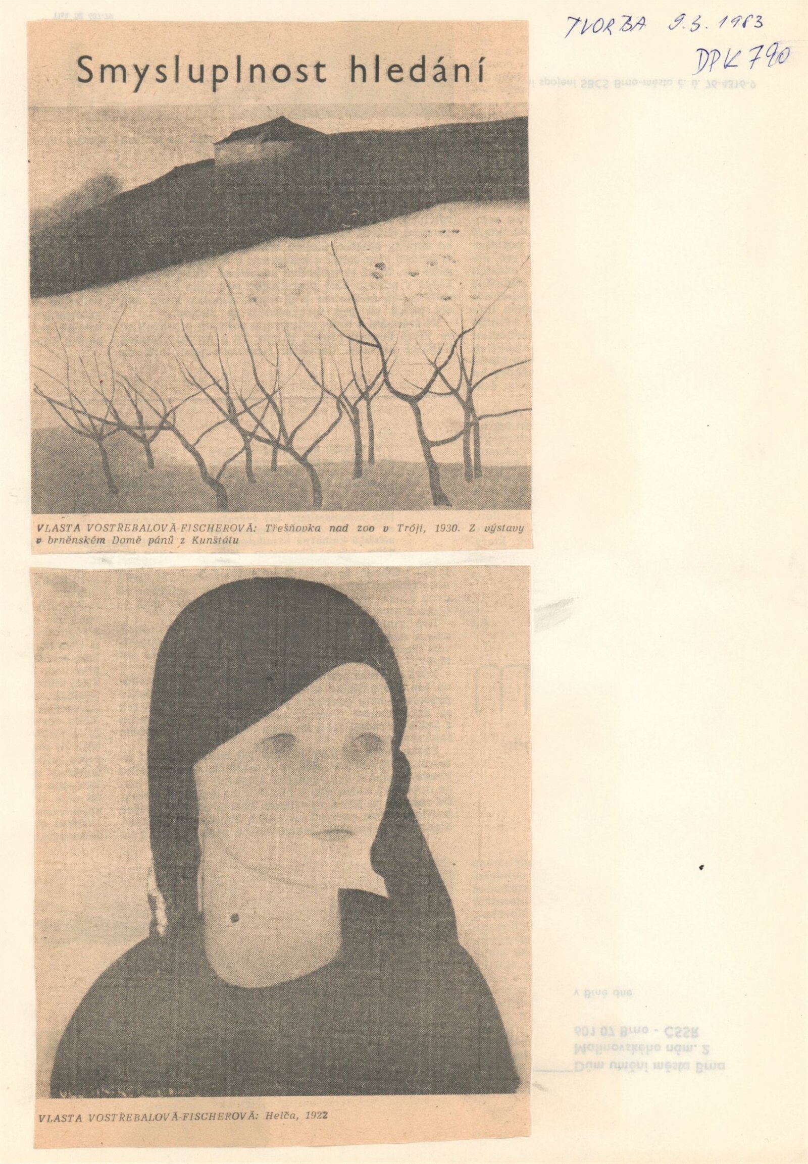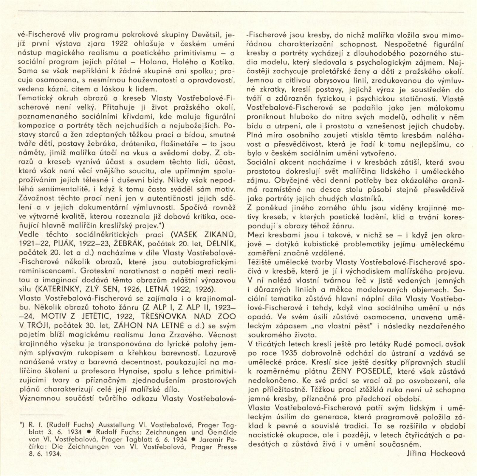 Vlasta Vostřebalová-Fischerová. Obrazy a kresby: Dům umění / Dům pánů z Kunštátu, 25. 1. – 20. 2. 1983 / Text: Jiřina Hockeová. – Brno DUmB, 1983. – 16 s., obr., životní data, bibliografie, DPK 790. – MZK; MG; MMB