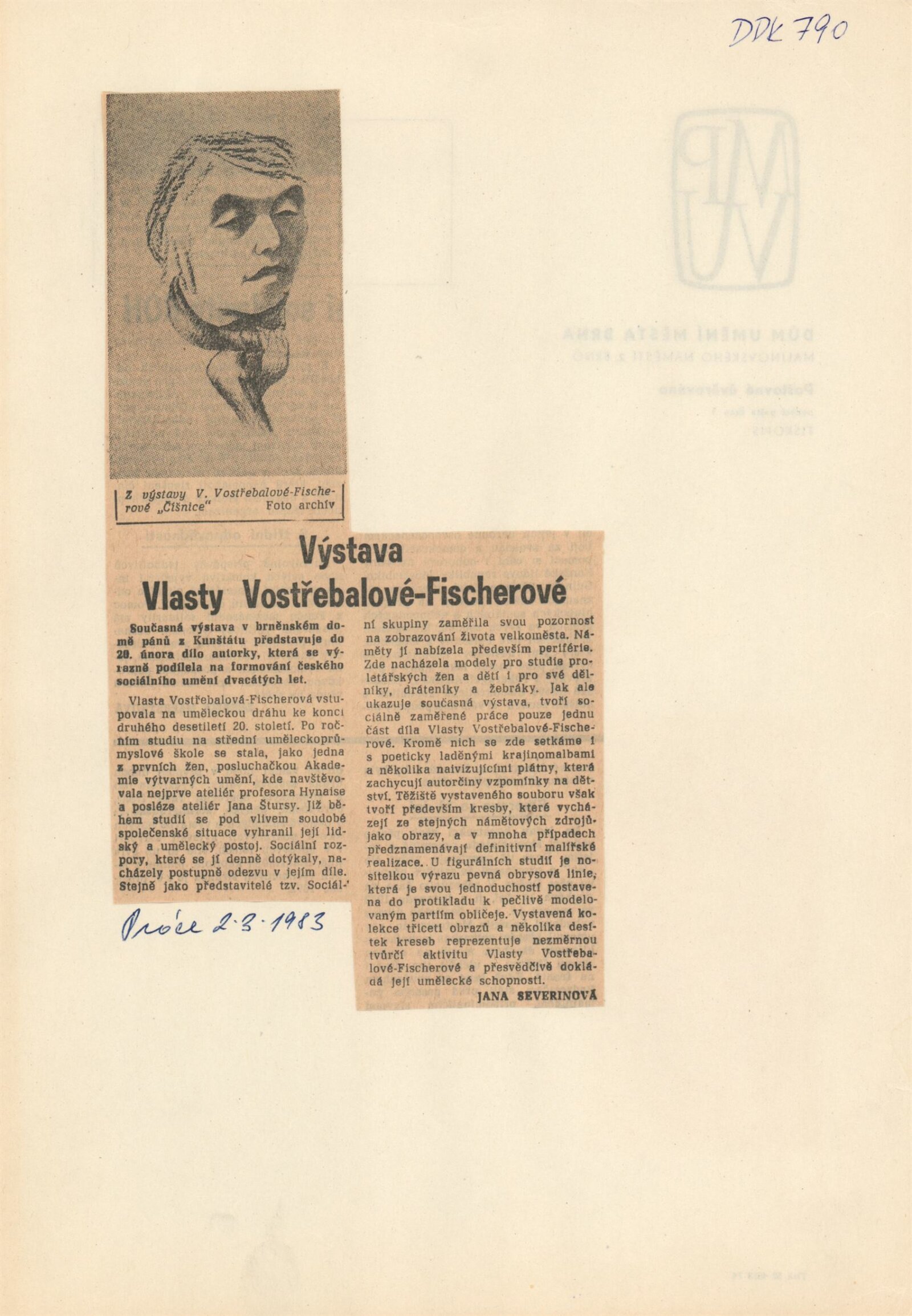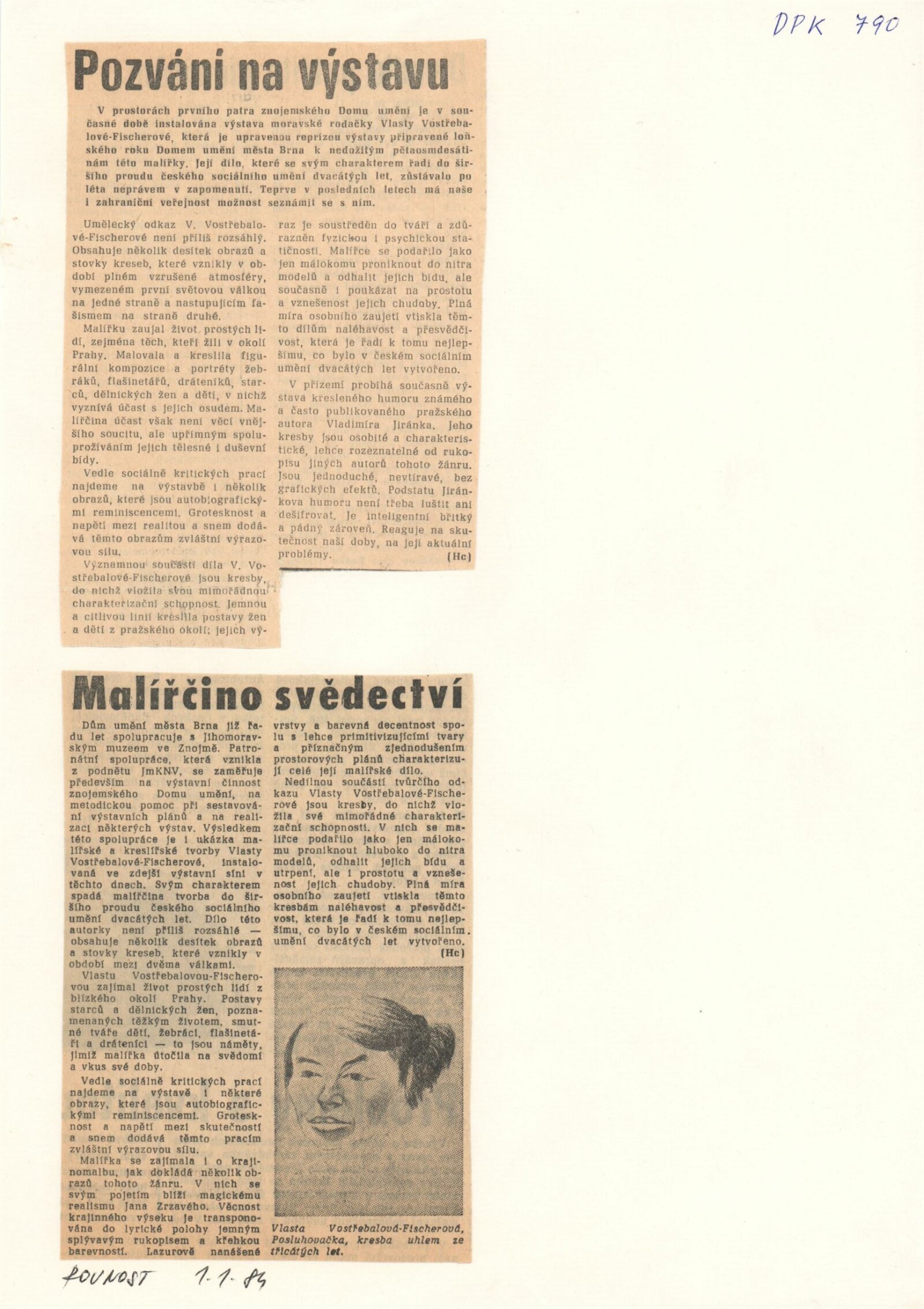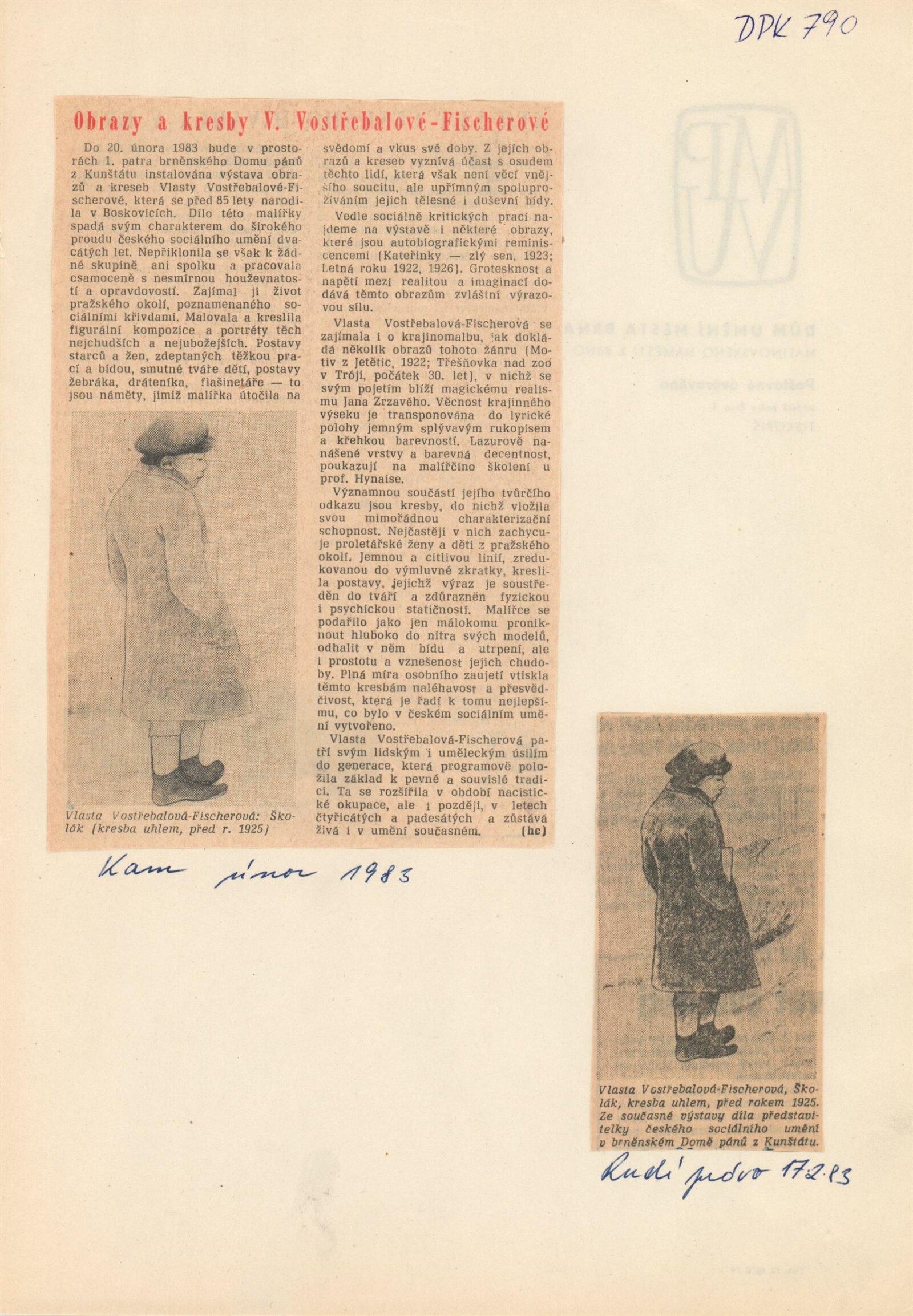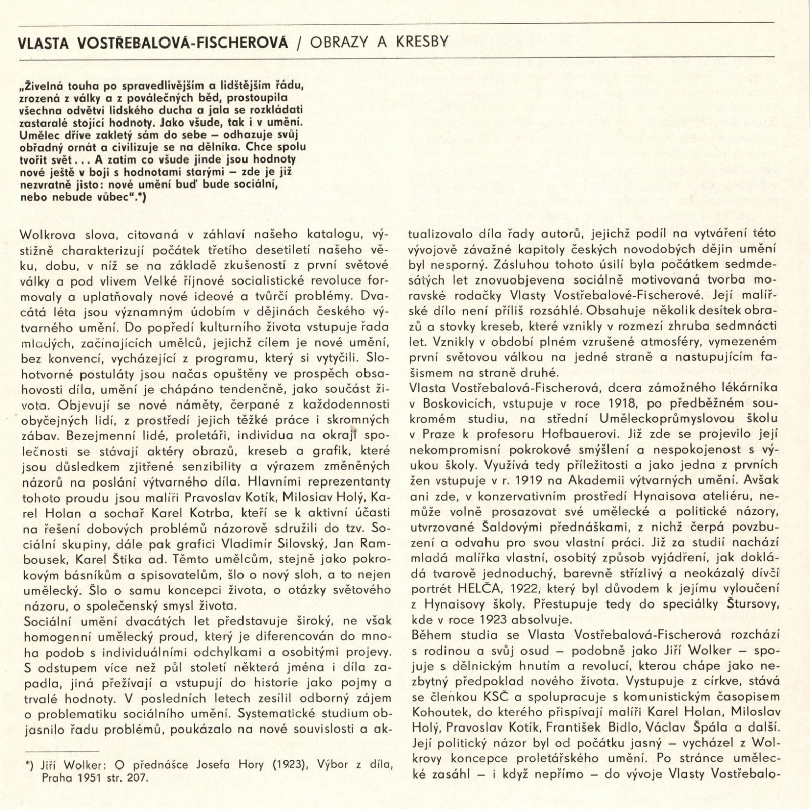 Vlasta Vostřebalová-Fischerová. Obrazy a kresby: Dům umění / Dům pánů z Kunštátu, 25. 1. – 20. 2. 1983 / Text: Jiřina Hockeová. – Brno DUmB, 1983. – 16 s., obr., životní data, bibliografie, DPK 790. – MZK; MG; MMB