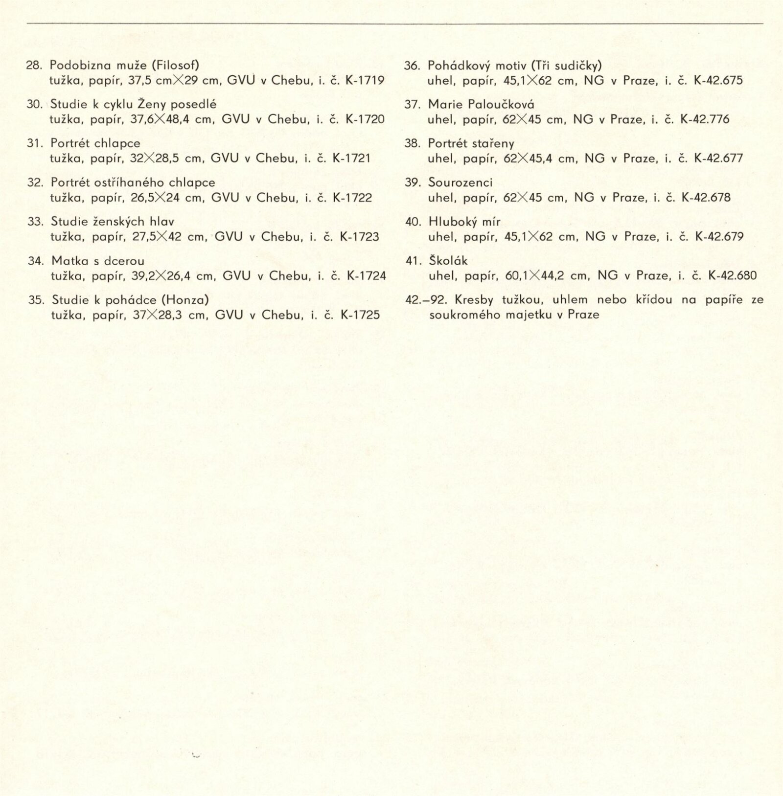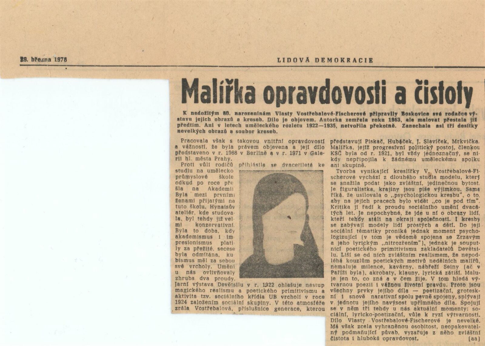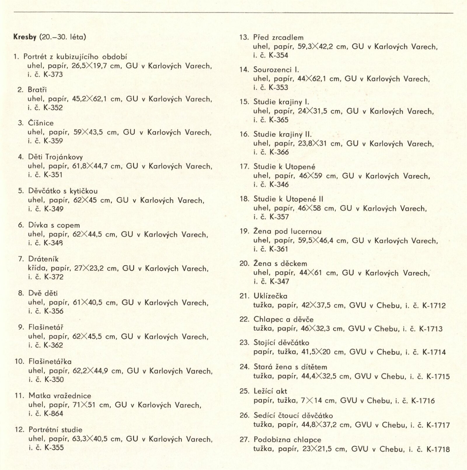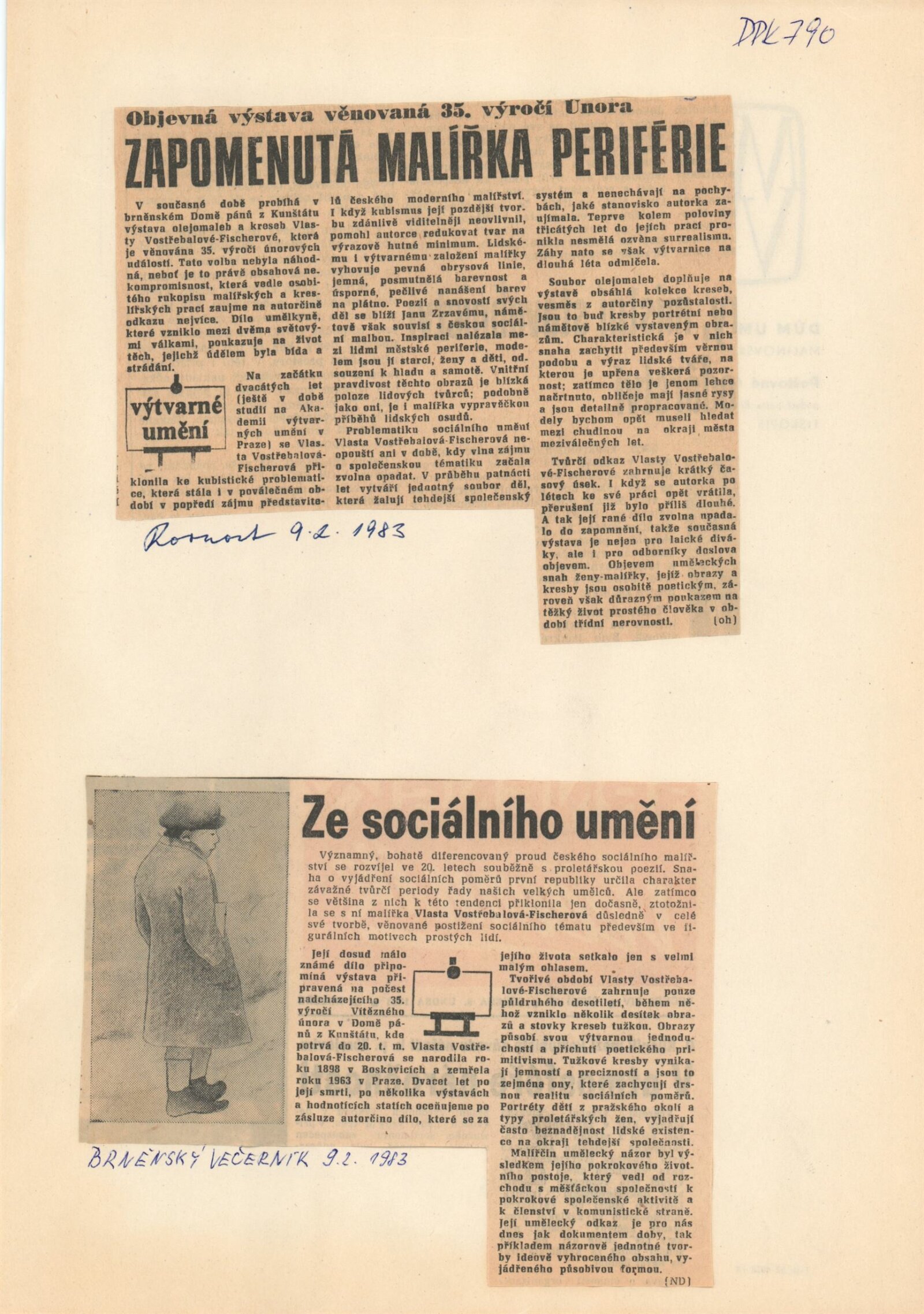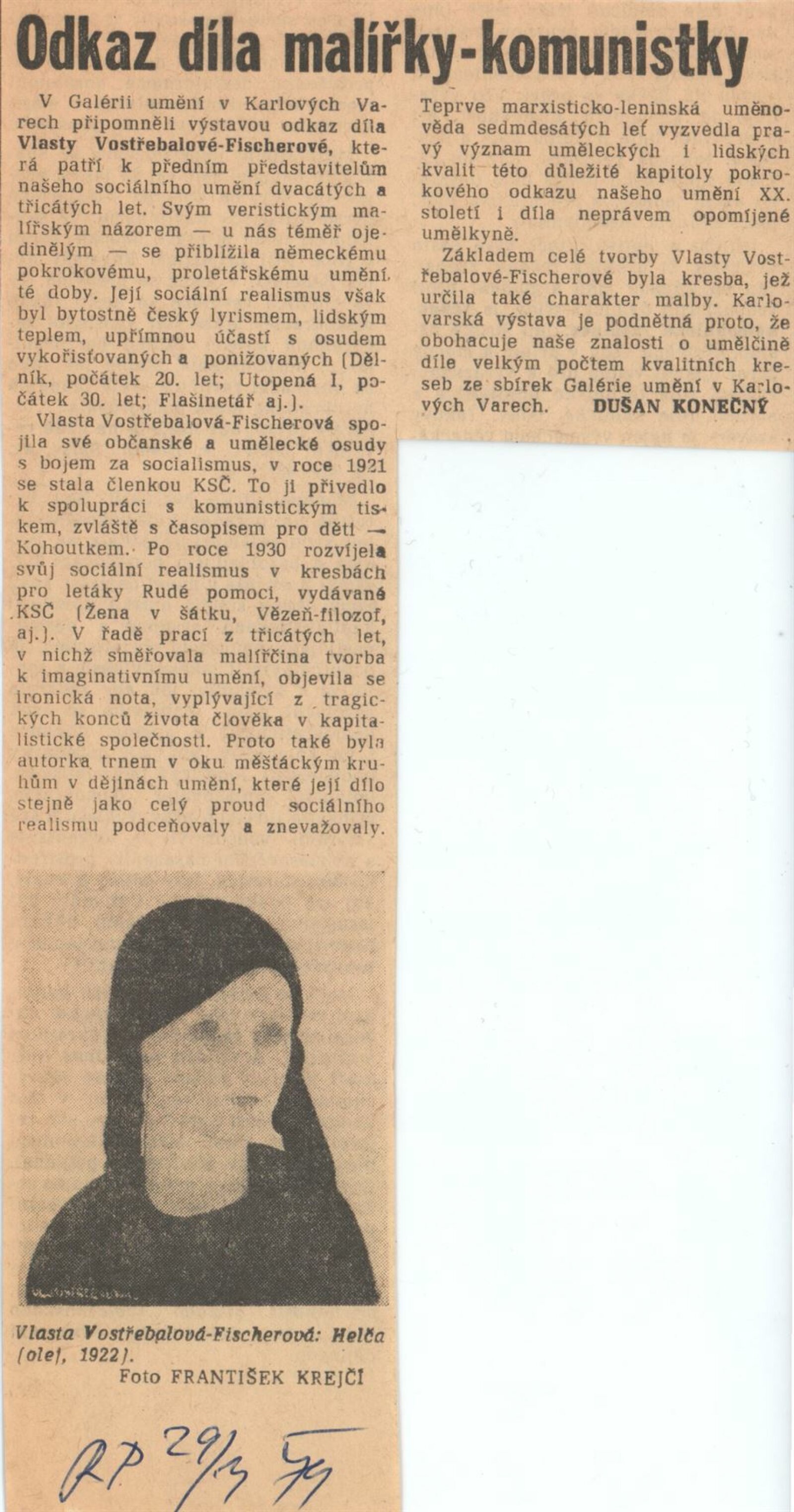 Vlasta Vostřebalová-Fischerová. Obrazy a kresby: Dům umění / Dům pánů z Kunštátu, 25. 1. – 20. 2. 1983 / Text: Jiřina Hockeová. – Brno DUmB, 1983. – 16 s., obr., životní data, bibliografie, DPK 790. – MZK; MG; MMB