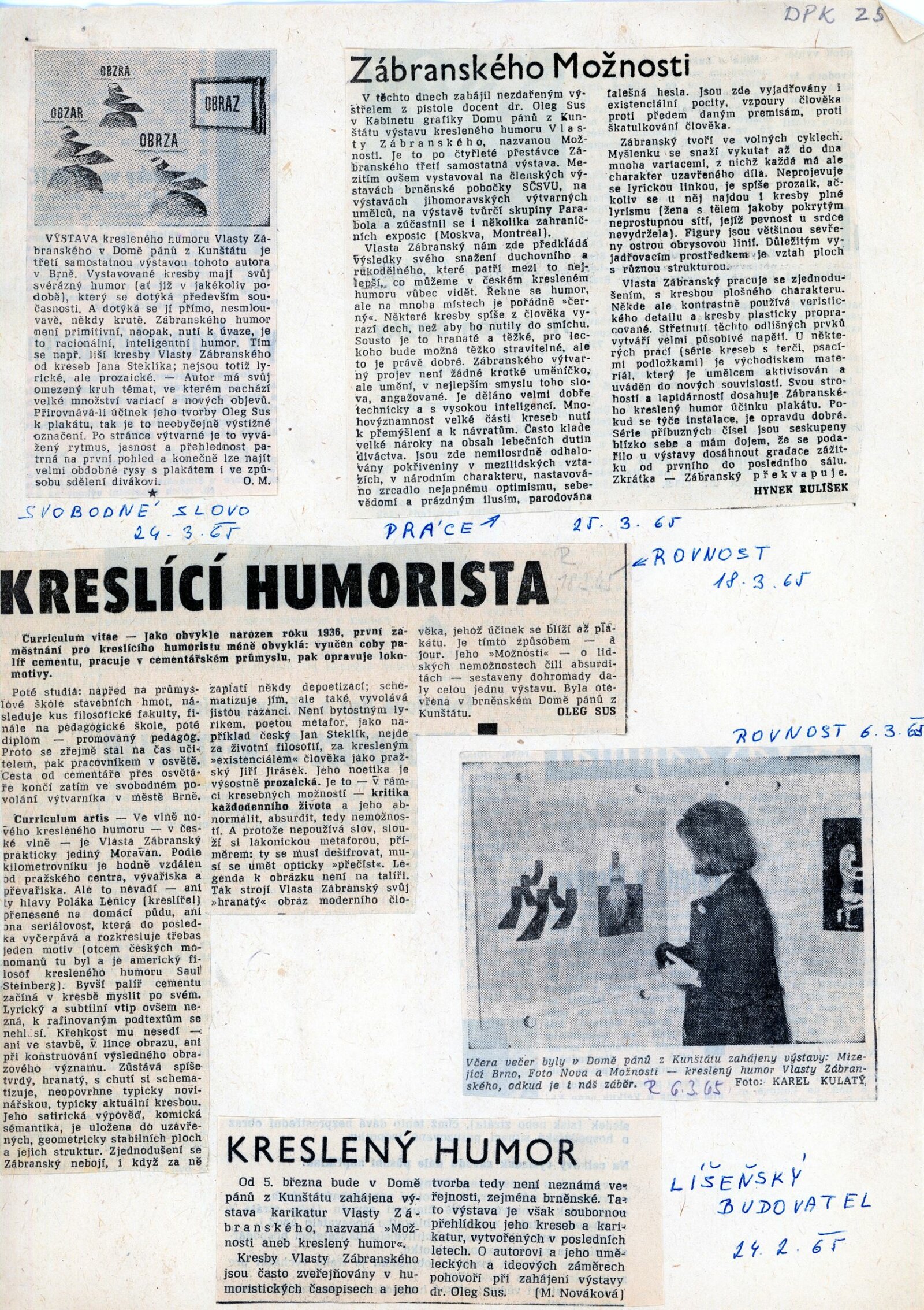Vlasta Zábranský. Možnosti. Kreslený humor: Dům umění města Brna / Dům pánů z Kunštátu, 63. výstava Kabinet grafiky, 5. 3. – 28. 3. 1965 / Text: Oleg Sus. – Brno: DUmB, 1965. – 6 s., obr., výstavy, DPK 259. – MZK; MG; MMB