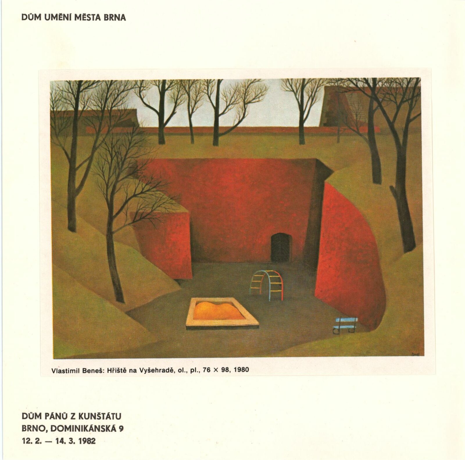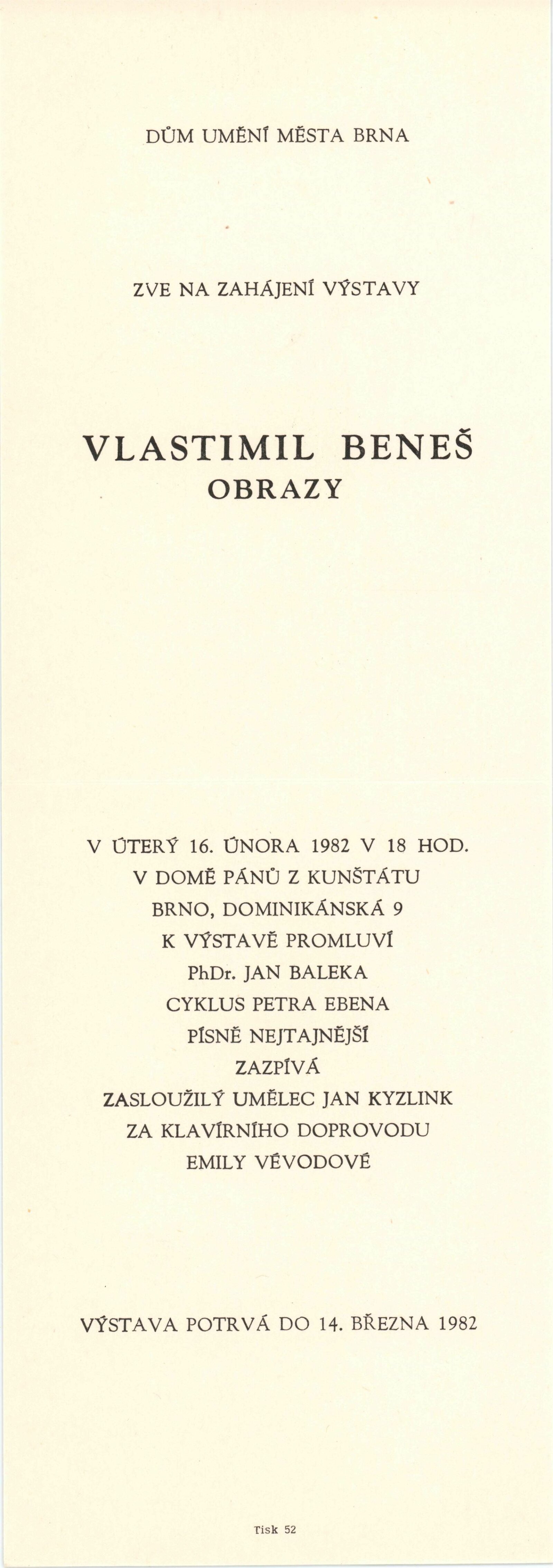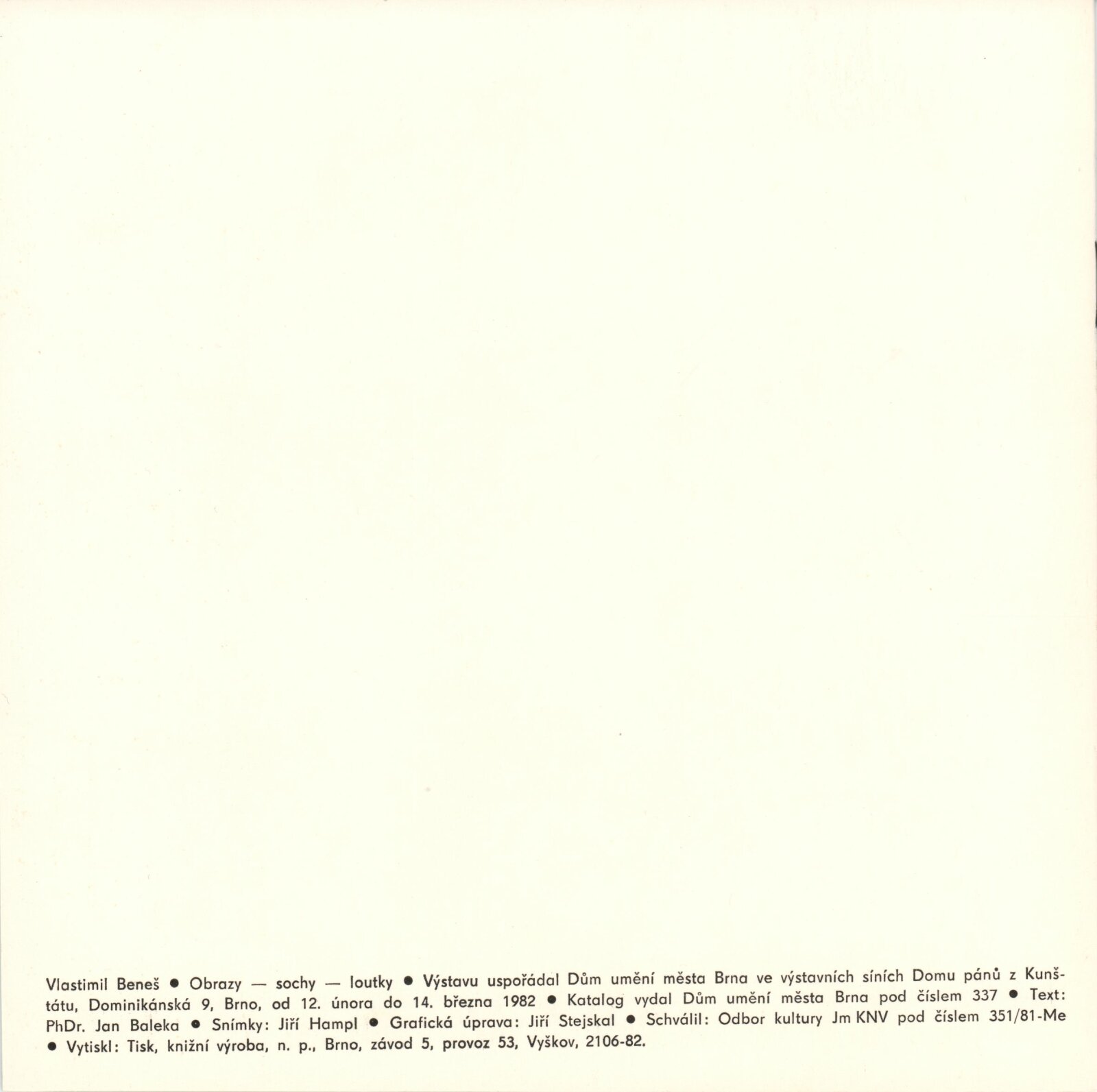 Vlastimil Beneš. Obrazy, sochy, loutky: Dům umění / Dům pánů z Kunštátu, 12. 2. – 14. 3. 1982 / Text: Jan Baleka. – Brno: DUmB, 1982. – 16 s., obr., seznam výstav, DPK 773. – MZK; MG; MMB