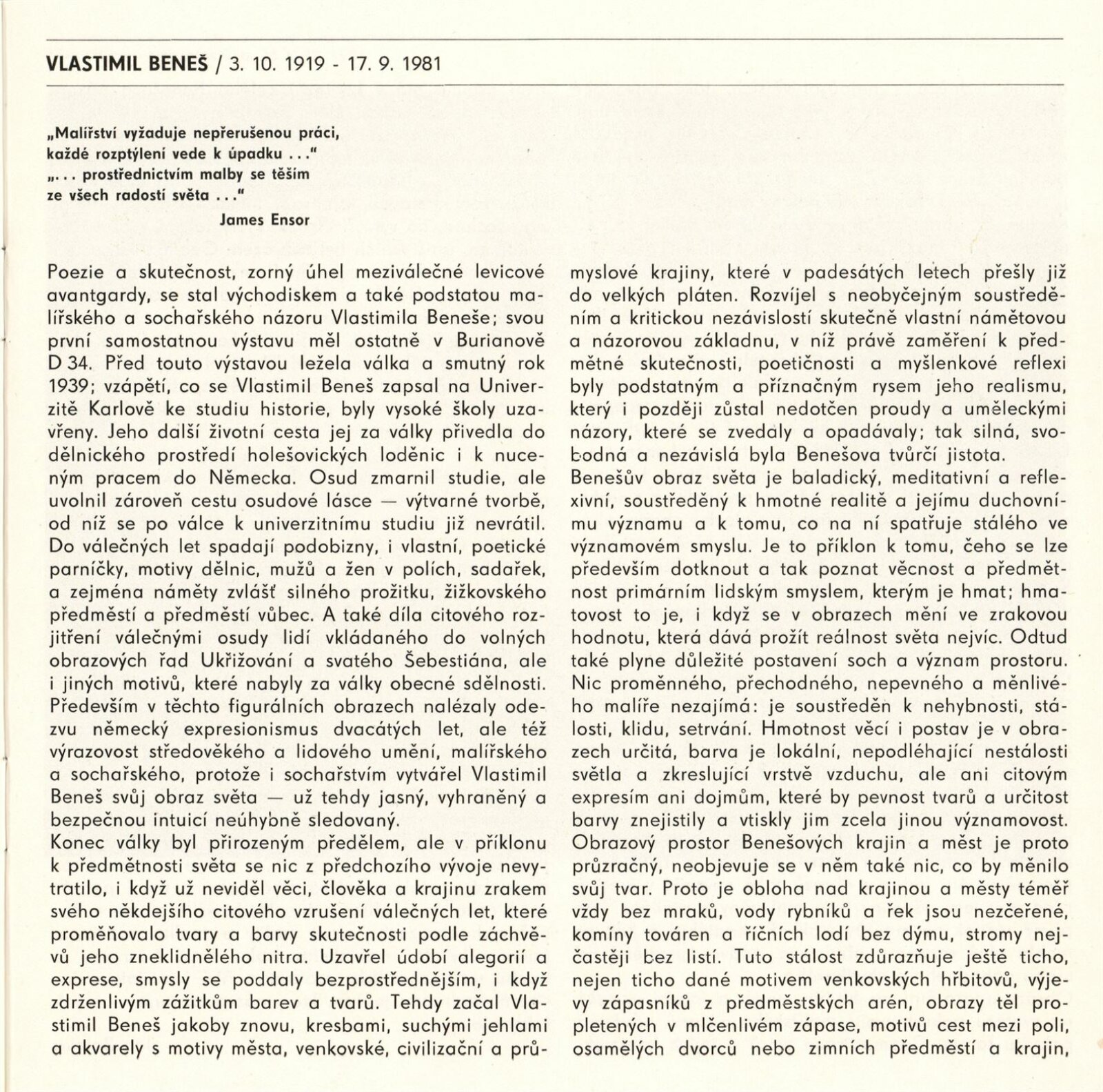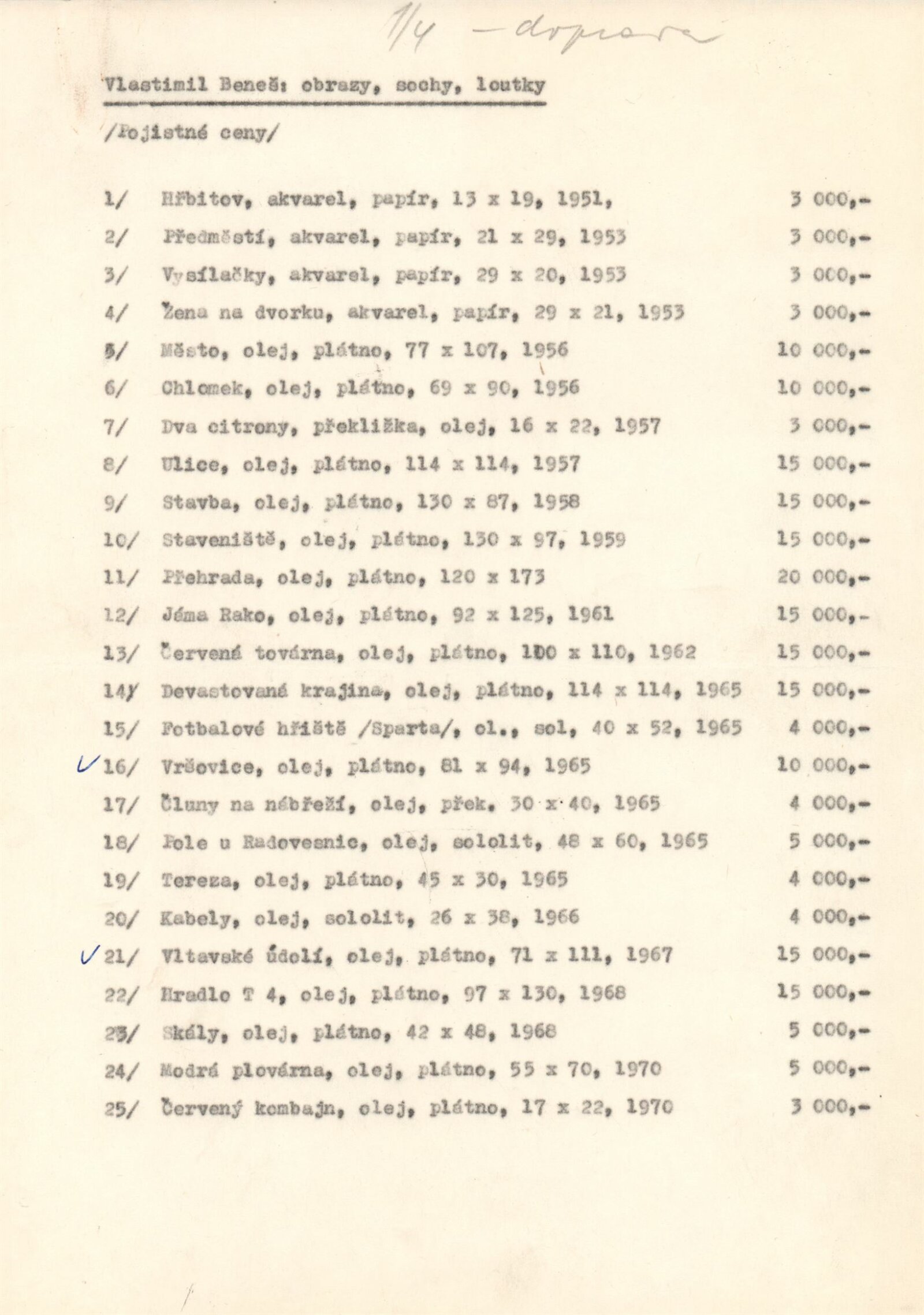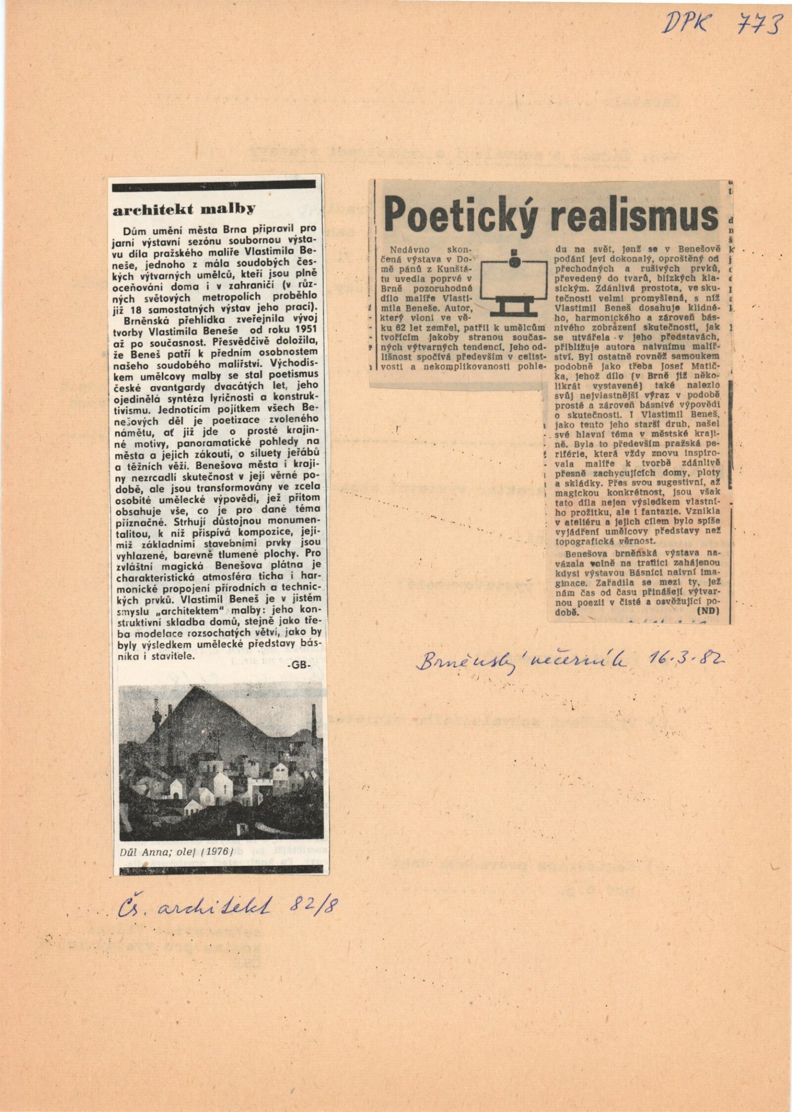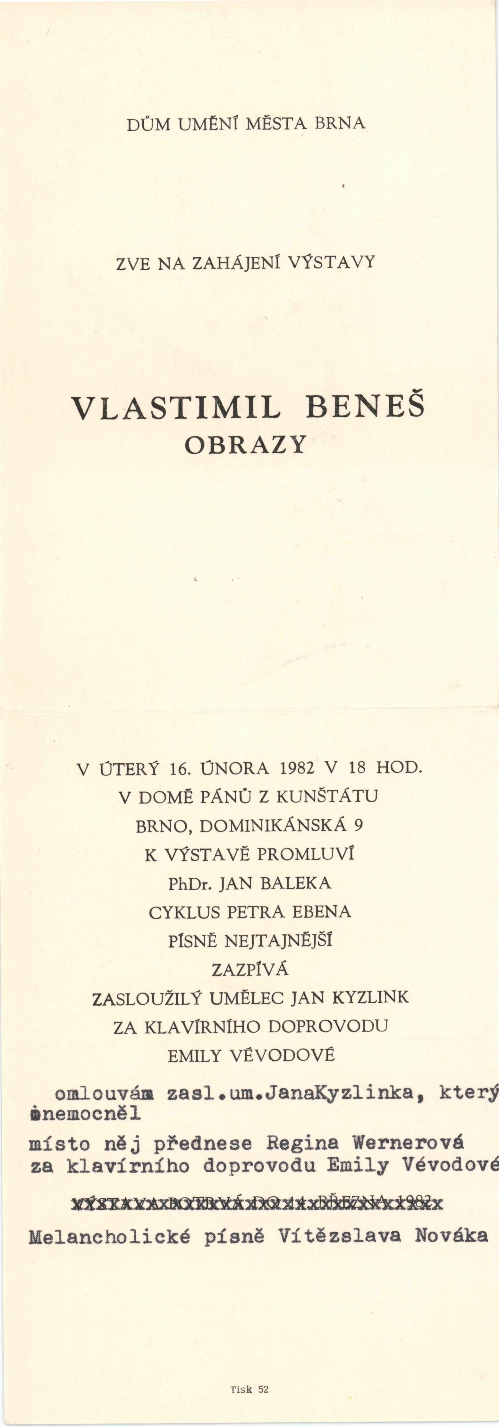 pozvánka, katalog, strojopis, seznam vystavených děl s pojistnými cenami, korespondence (Vlastimila Beneše, L. Benešové), recenze v tisku, pozvánka na výstavu Vlastimila Beneše ze Špálovy galerie v Praze 1981