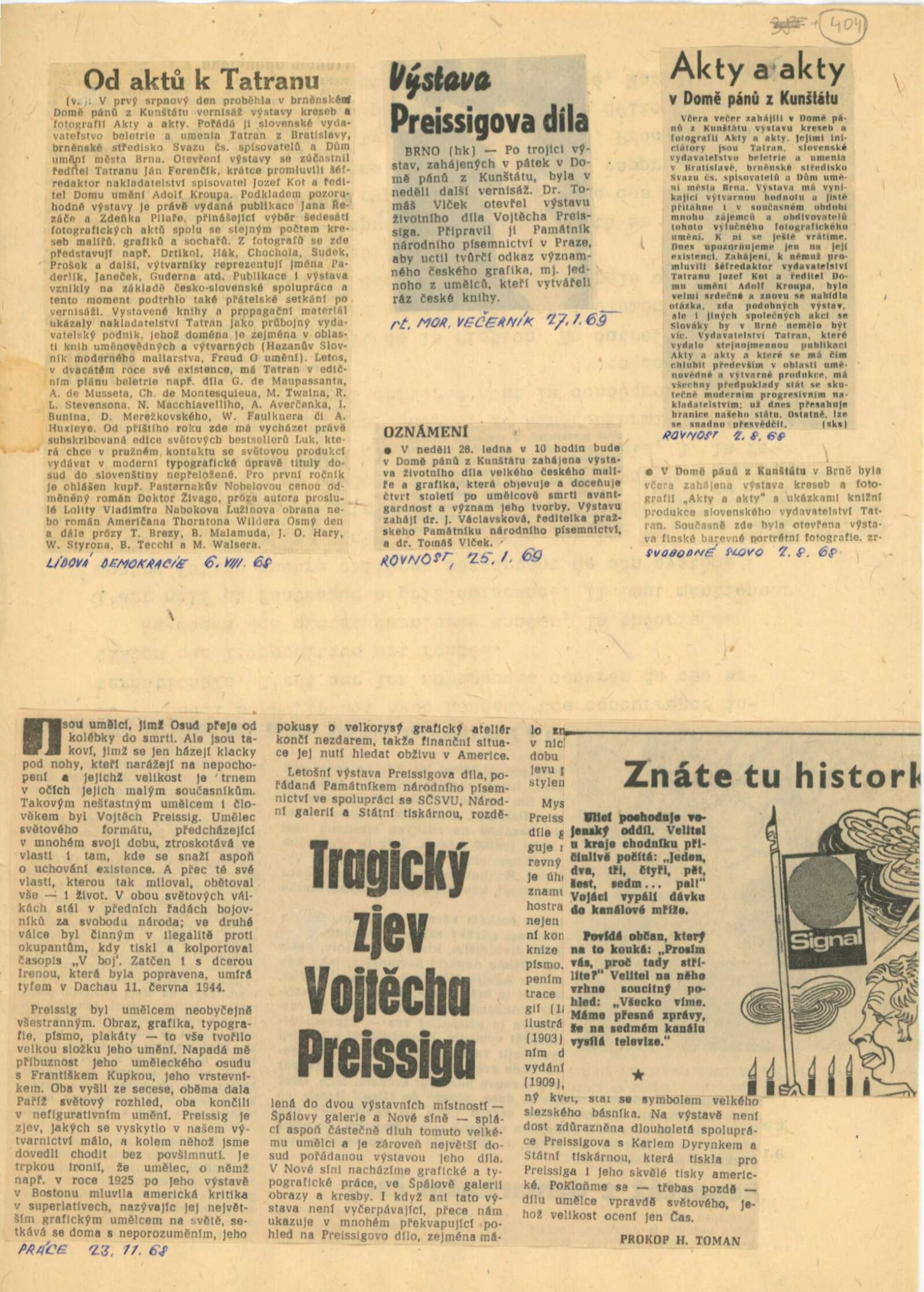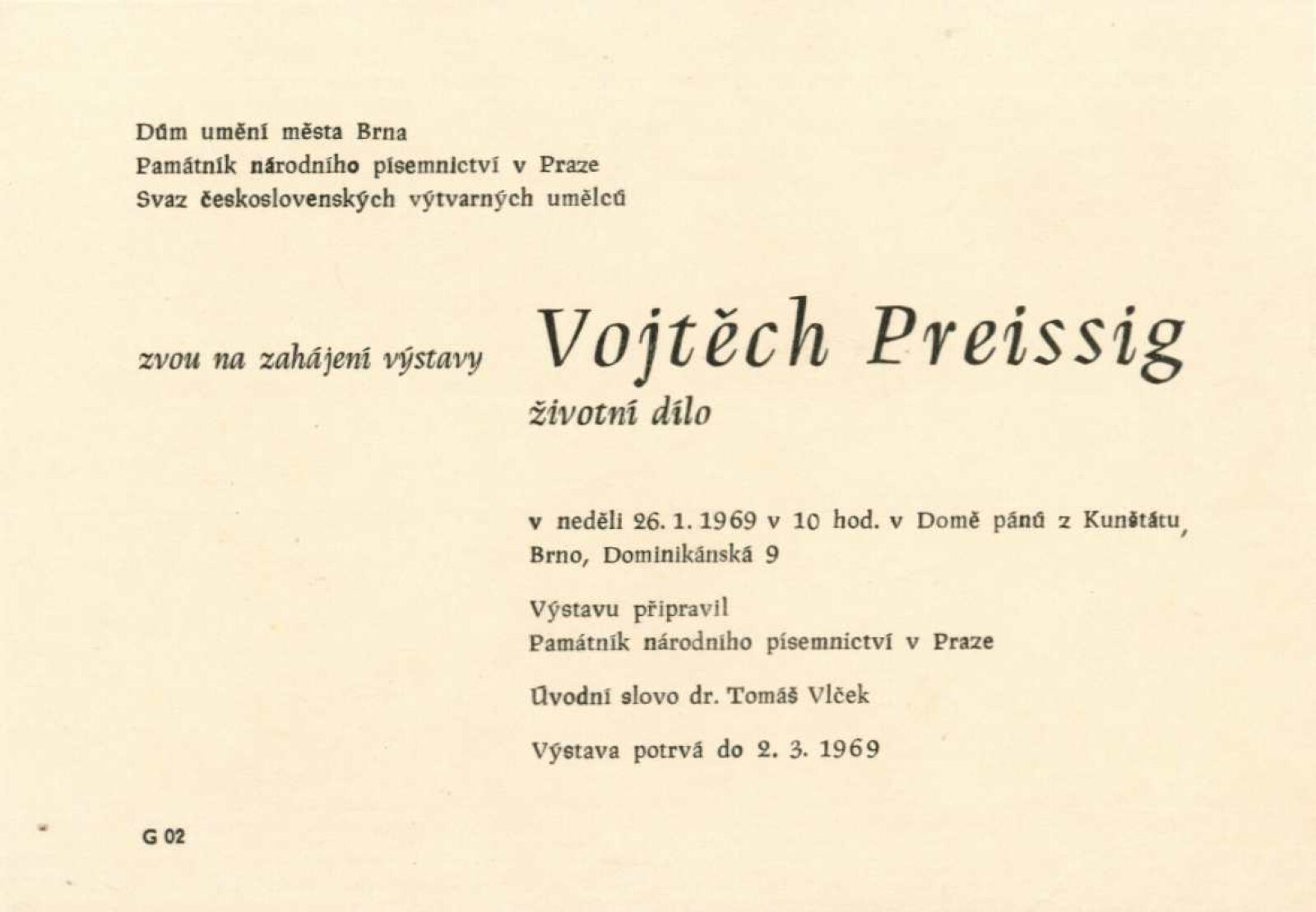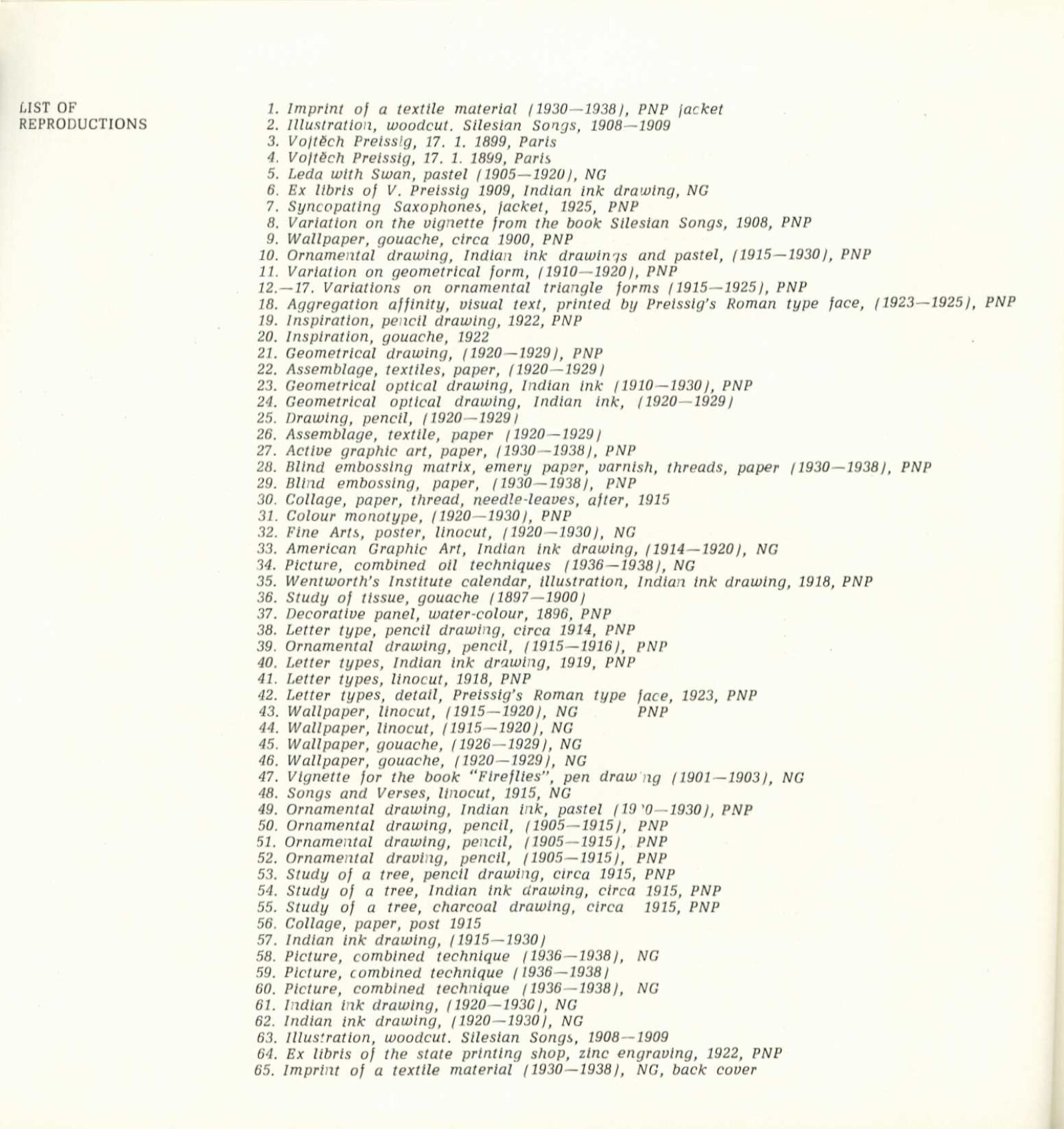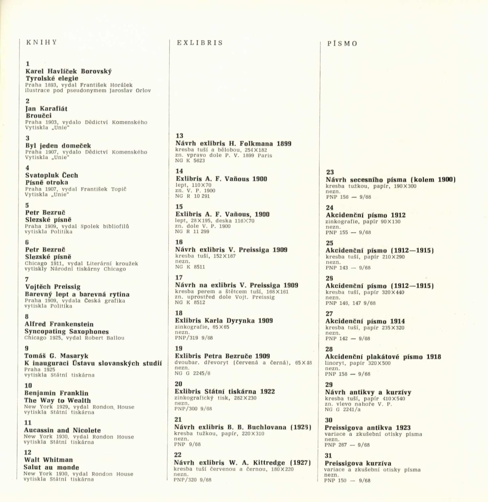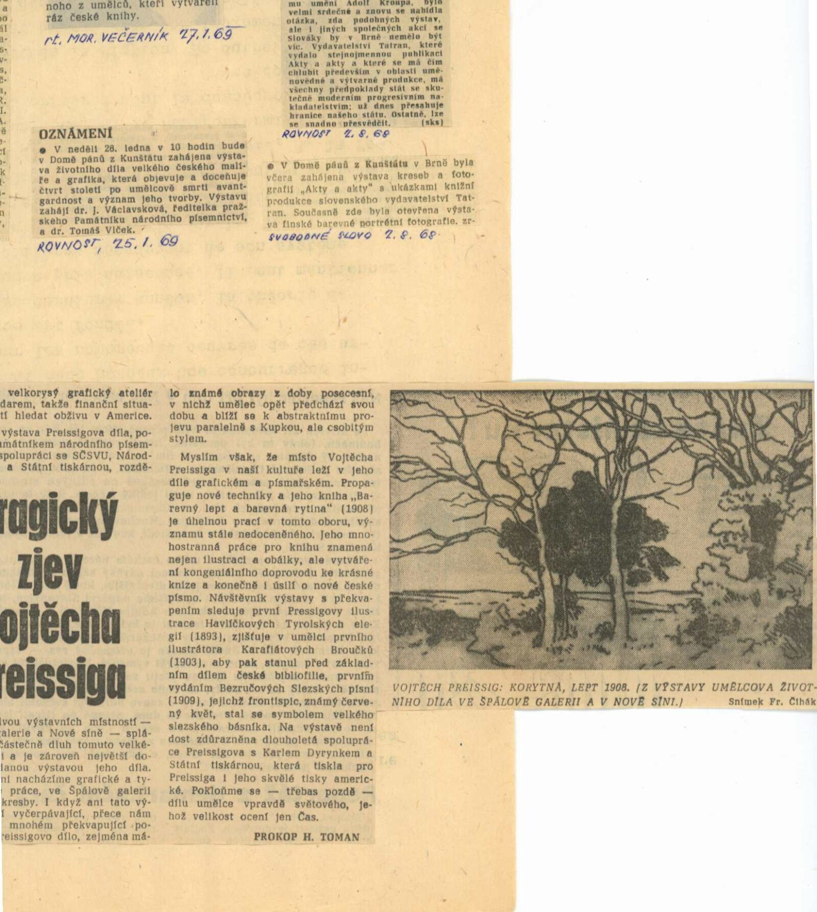 Vojtěch Preissig. Životní dílo: Dům umění města Brna / Dům pánů z Kunštátu, 26. 1. – 2. 3. 1969 / Převzatý katalog. Vojtěch Preissig. 1873–1944: Galerie Václava Špály, Nová síň, Praha, 22. 10. – 24. 11. 1968 / Texty: Tomáš Vlček, Jiří Žantovský. – Praha: Památník národního písemnictví, 1968. – 64 s., obr., portrét, životní data, bibliografie, DPK 404. – MZK; MG