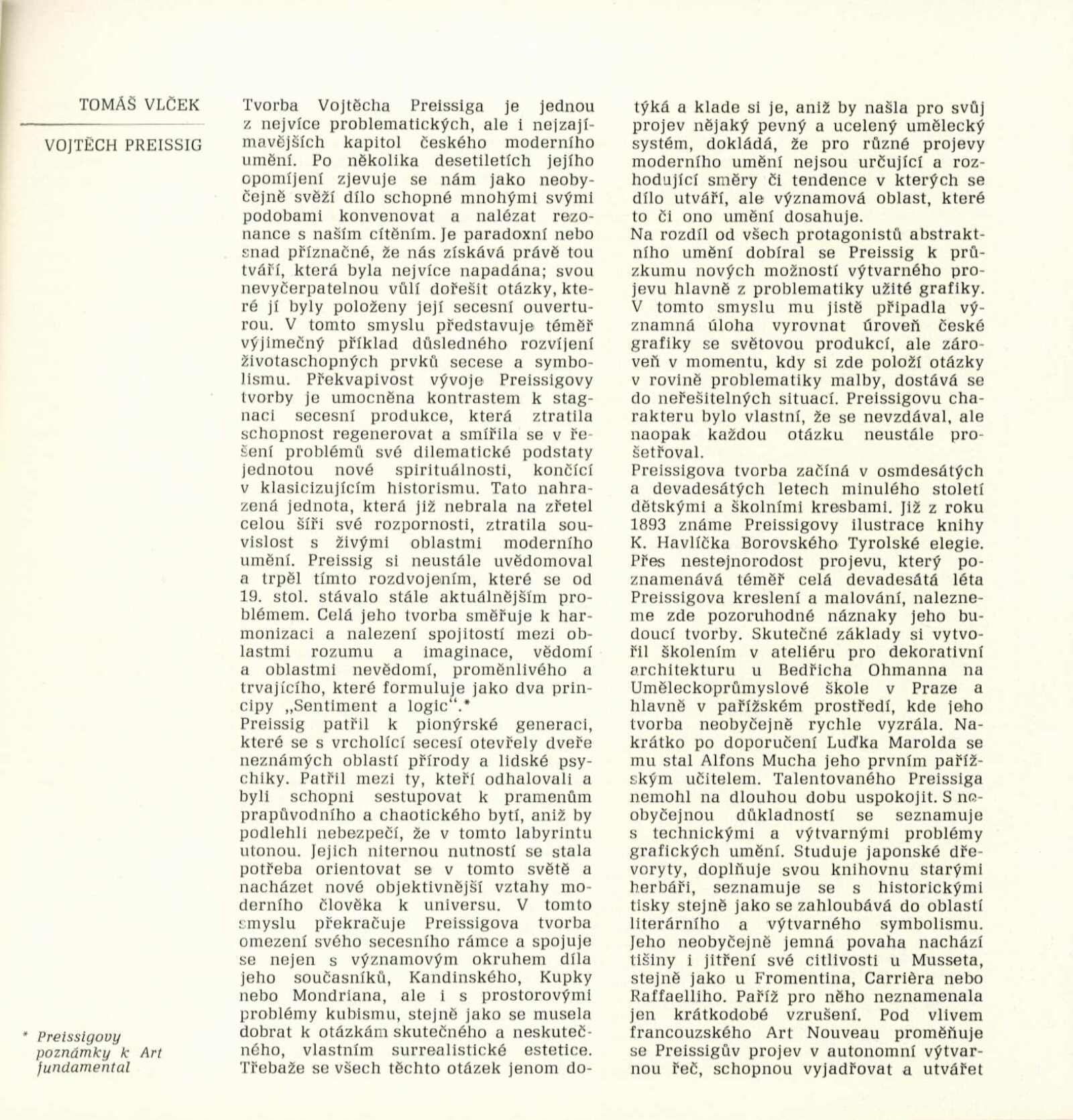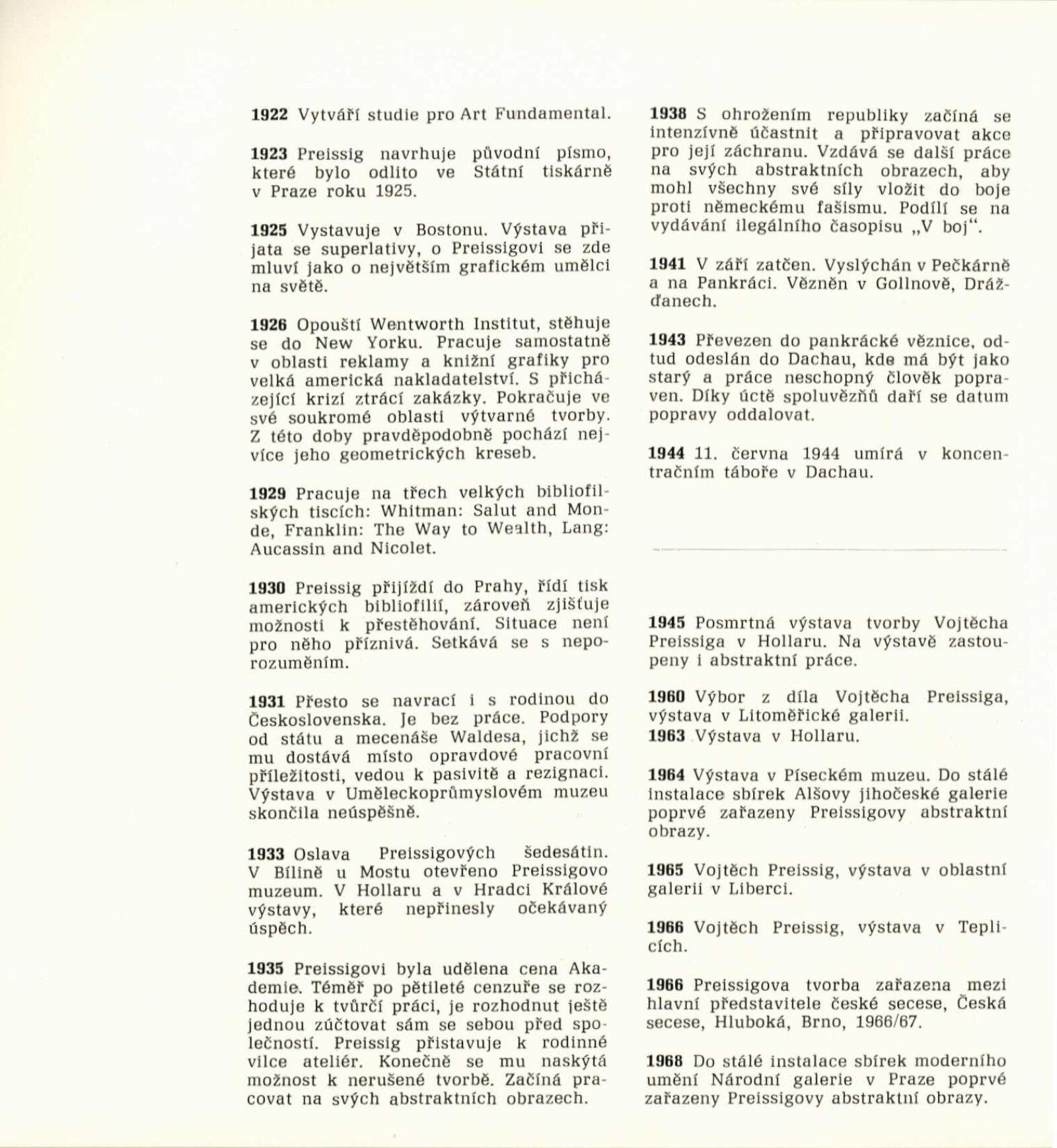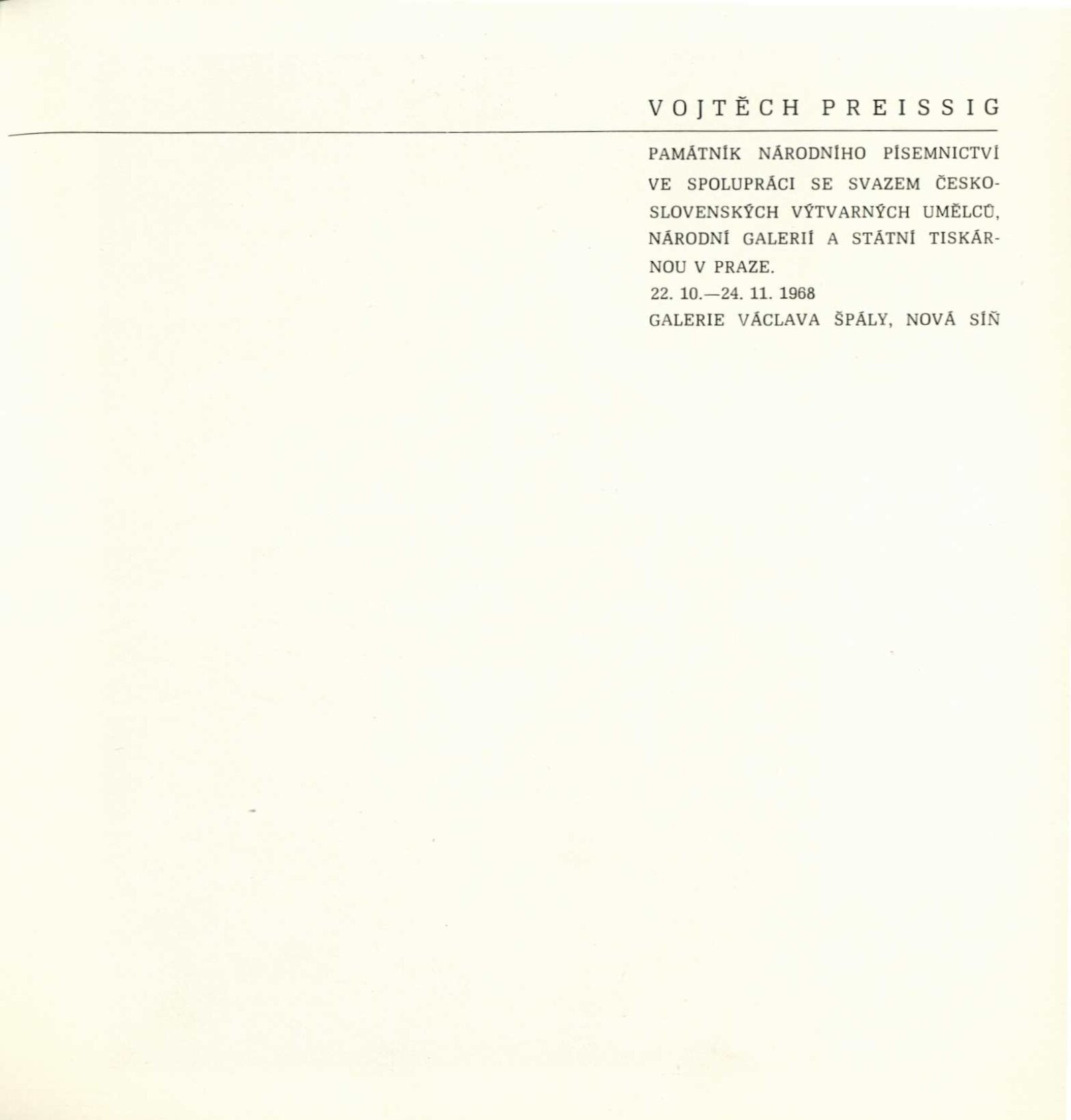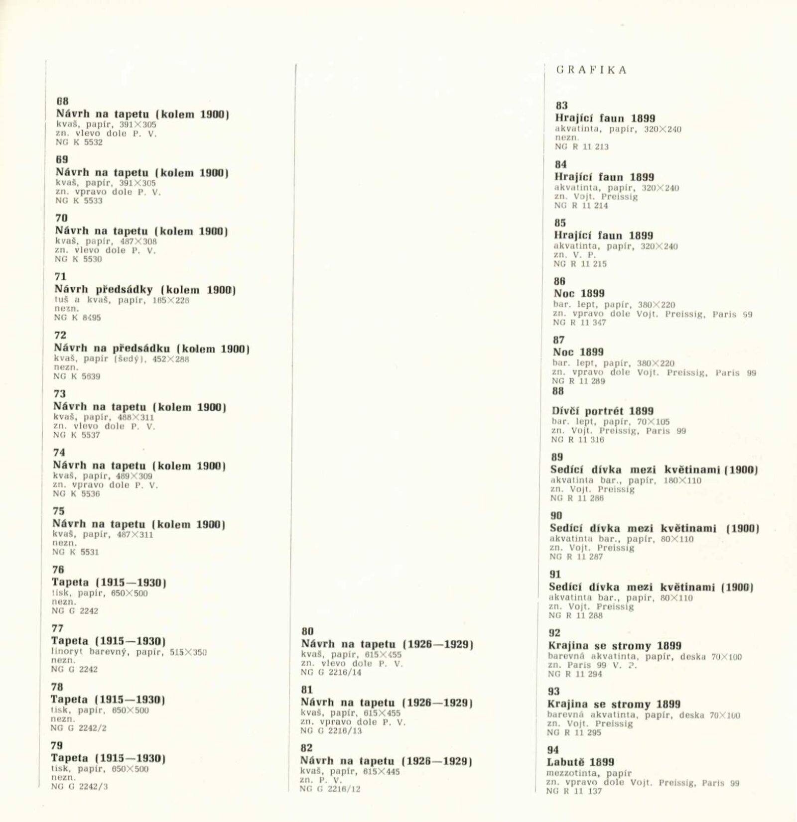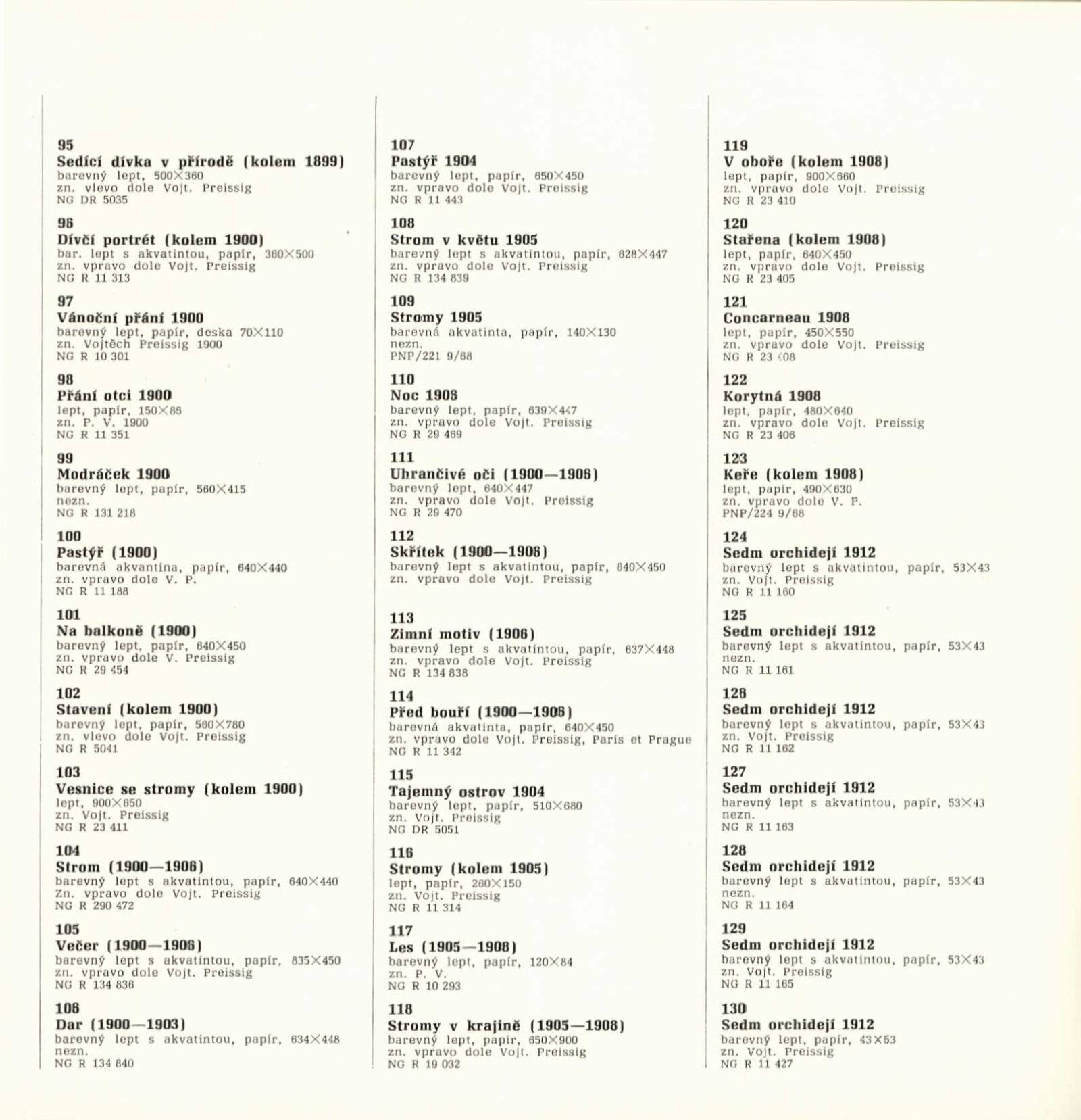 Vojtěch Preissig. Životní dílo: Dům umění města Brna / Dům pánů z Kunštátu, 26. 1. – 2. 3. 1969 / Převzatý katalog. Vojtěch Preissig. 1873–1944: Galerie Václava Špály, Nová síň, Praha, 22. 10. – 24. 11. 1968 / Texty: Tomáš Vlček, Jiří Žantovský. – Praha: Památník národního písemnictví, 1968. – 64 s., obr., portrét, životní data, bibliografie, DPK 404. – MZK; MG